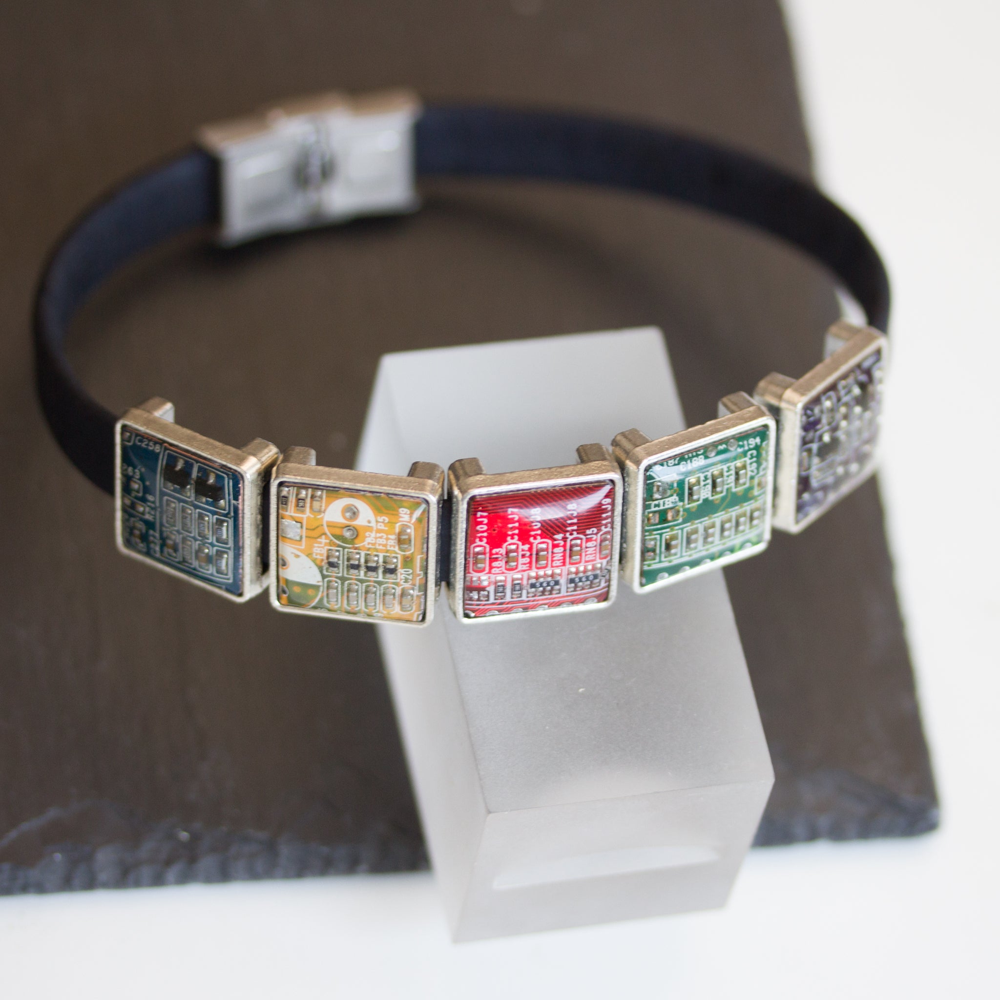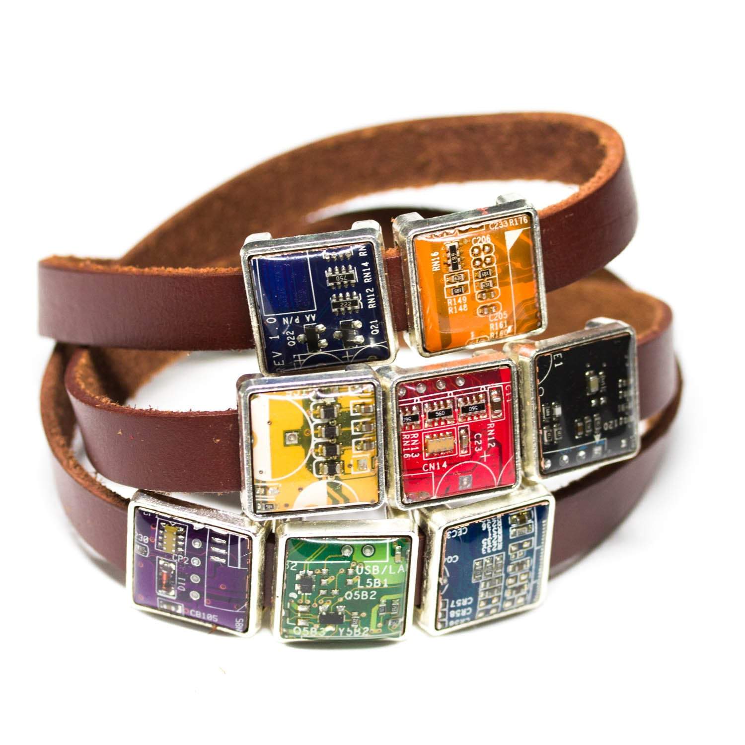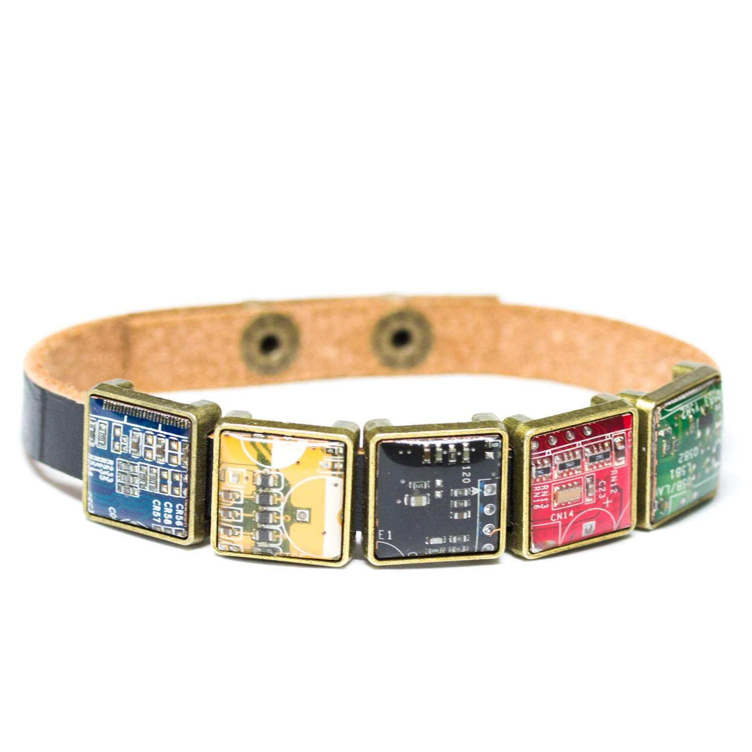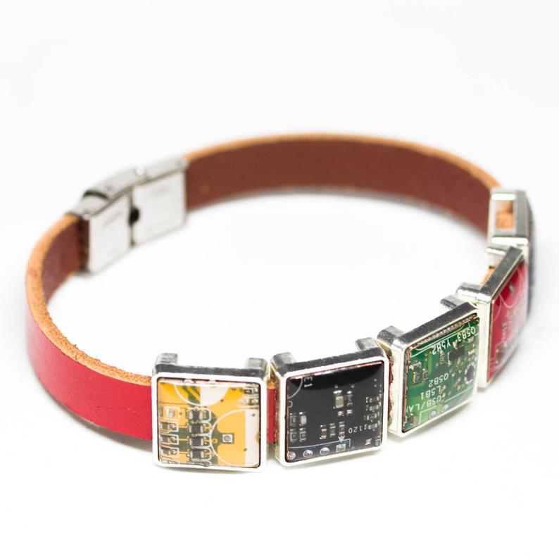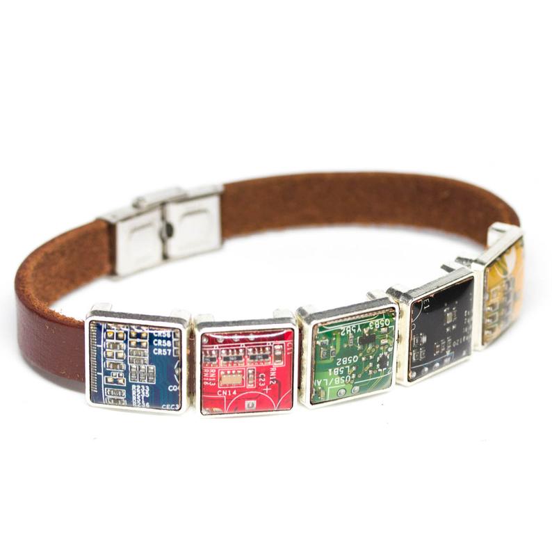 Unique bracelet for a stylish tech lover, made of a strip of brown, black or red leather and colorful beads made with recycled real circuit boards. We offer these bracelets...
