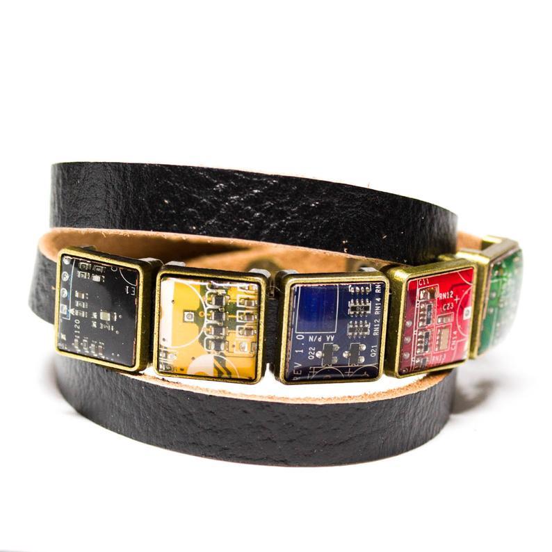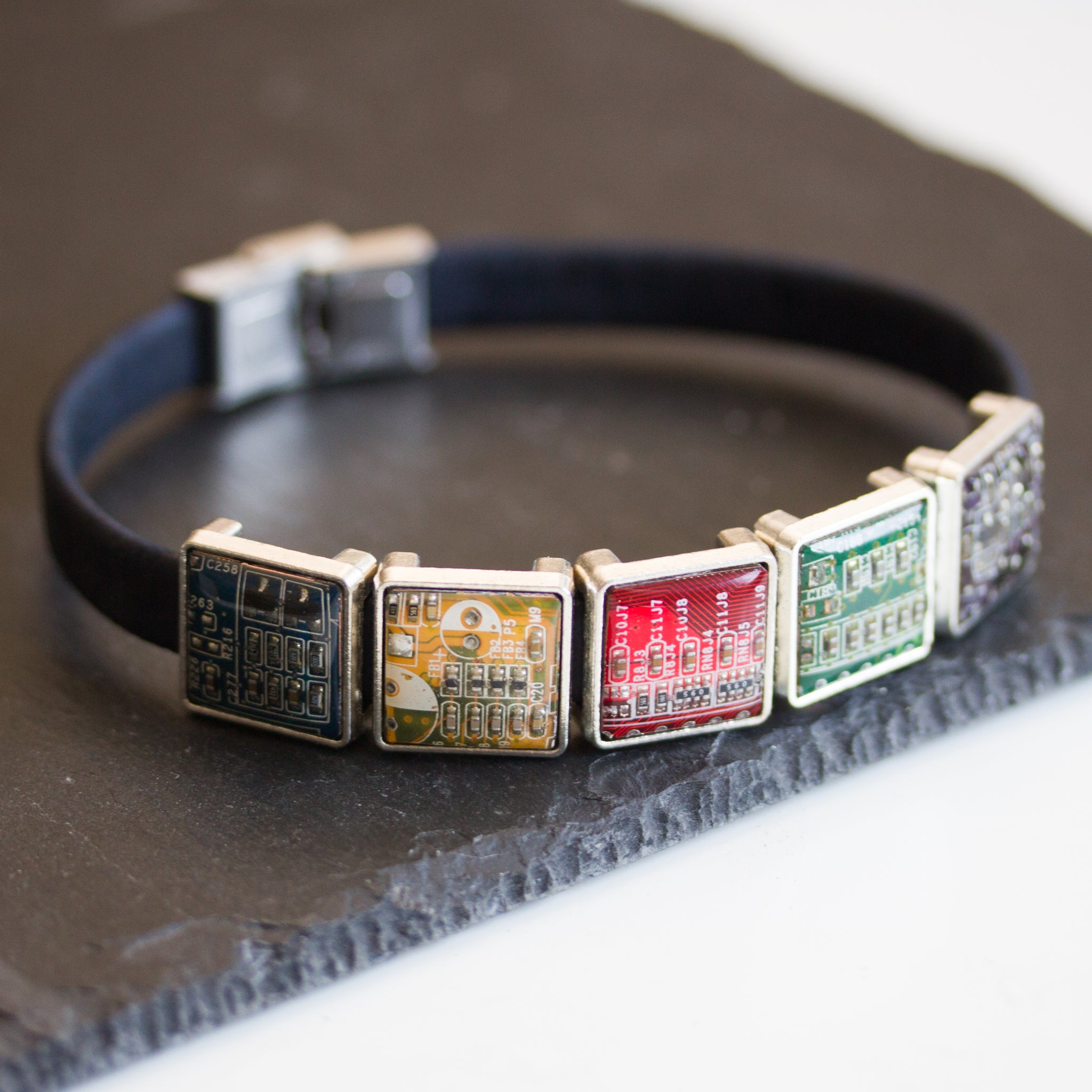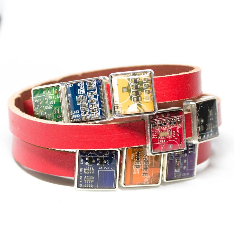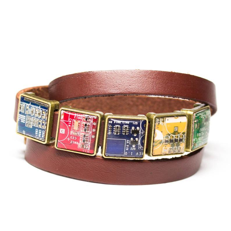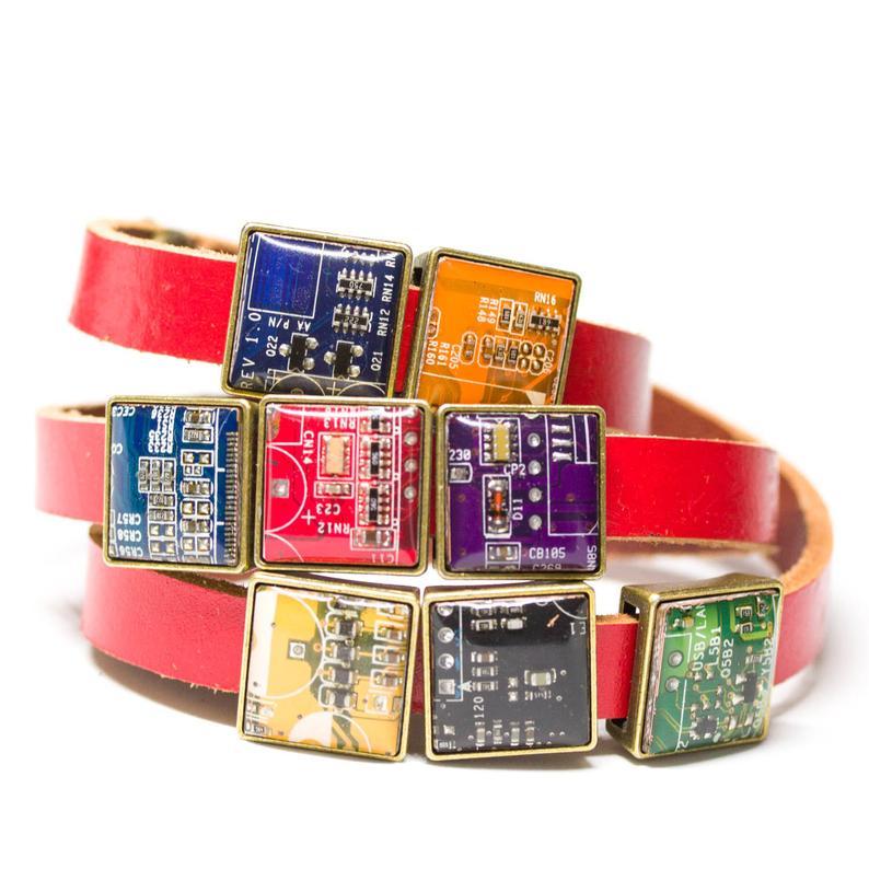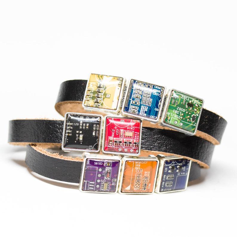 Unique bracelet for a stylish tech lover, made of a strip of brown, black or red leather and colorful beads made with recycled real circuit boards. We offer these bracelets...