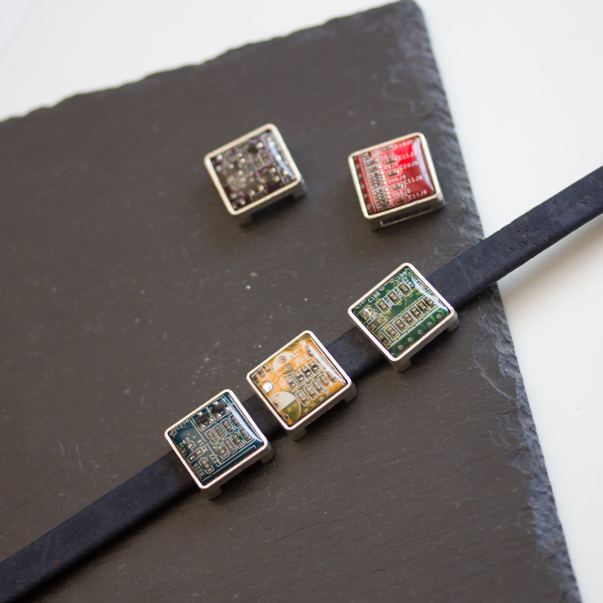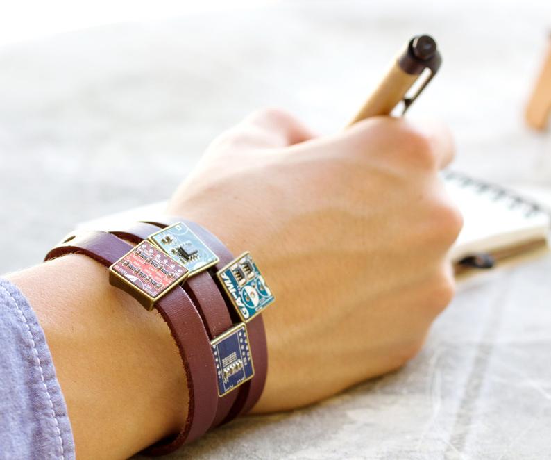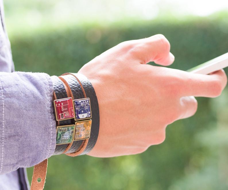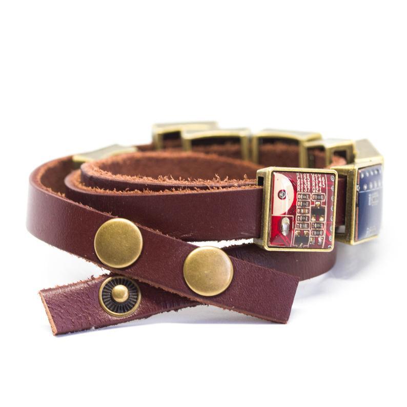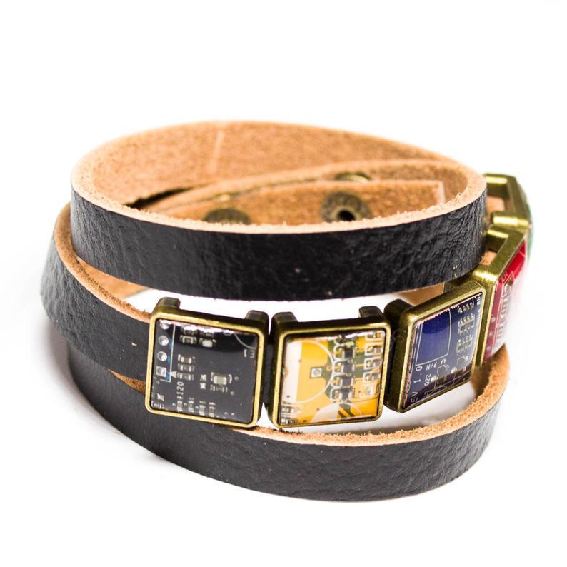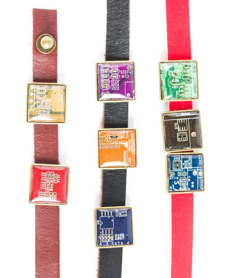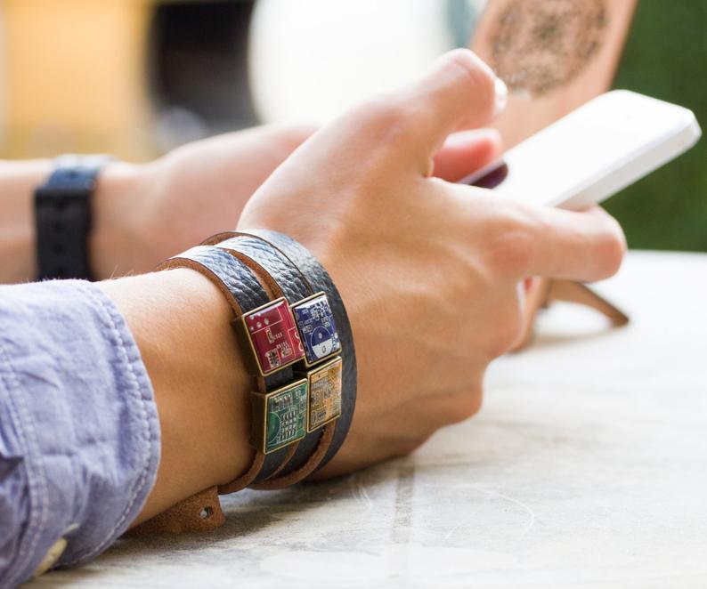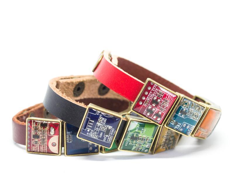 Unique bracelet for a stylish tech lover, made of a strip of brown, black or red leather and colorful beads made with recycled real circuit boards. We offer these bracelets...