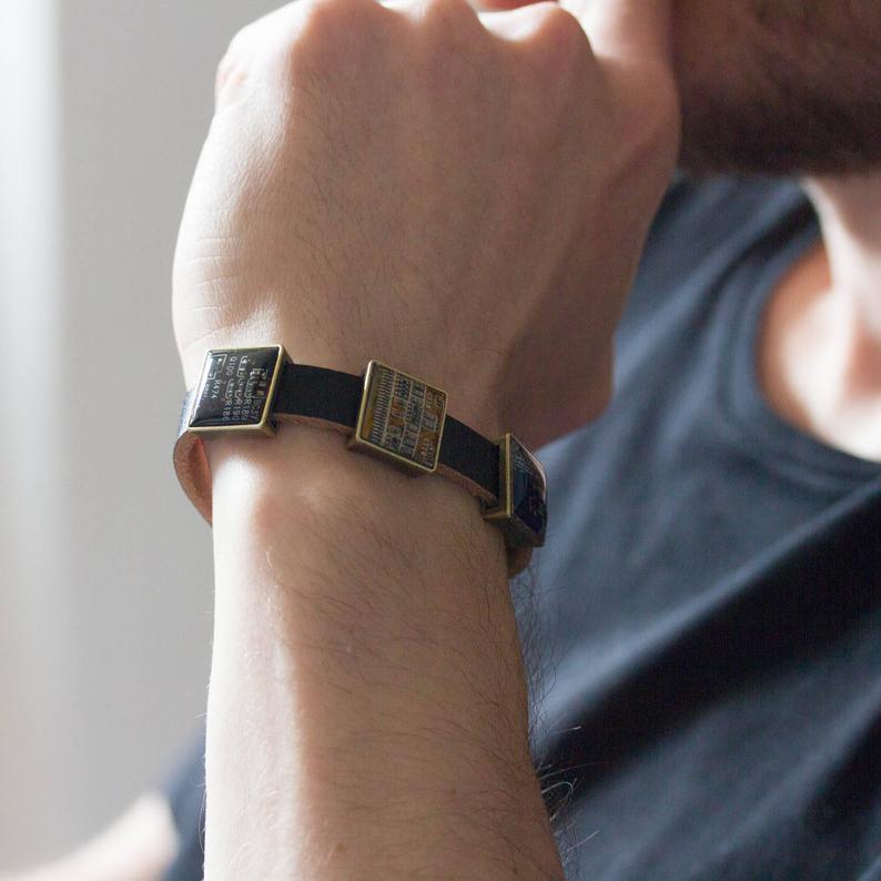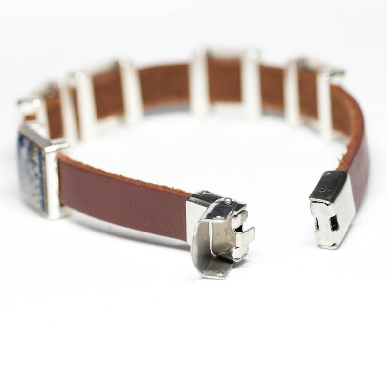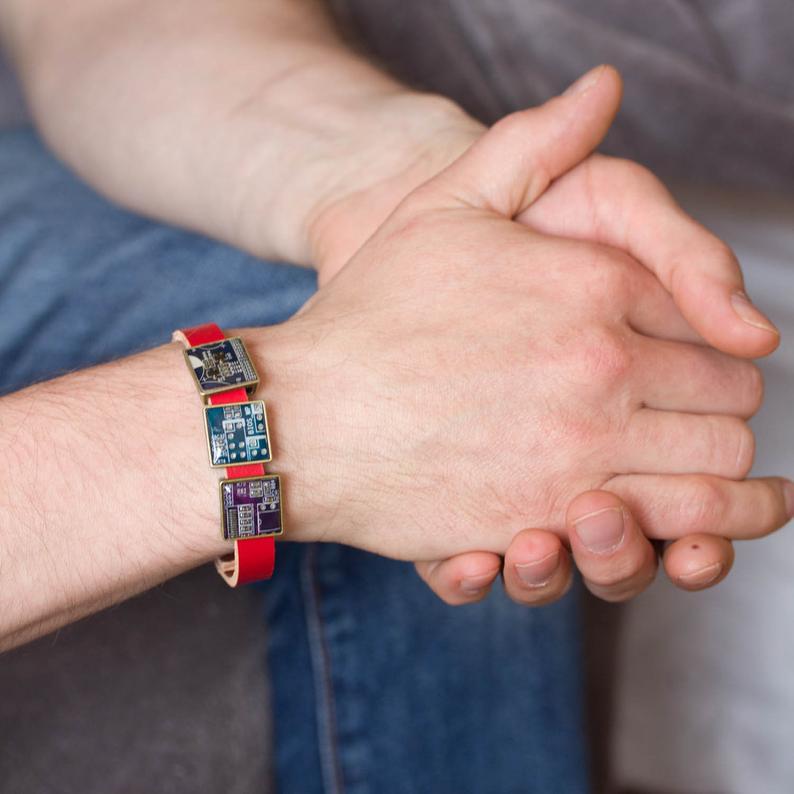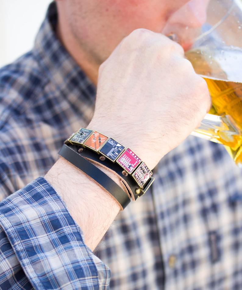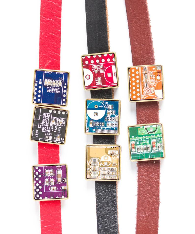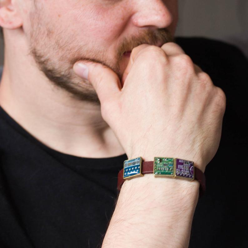 Unique bracelet for a stylish tech lover, made of a strip of brown, black or red leather and colorful beads made with recycled real circuit boards. We offer these bracelets...