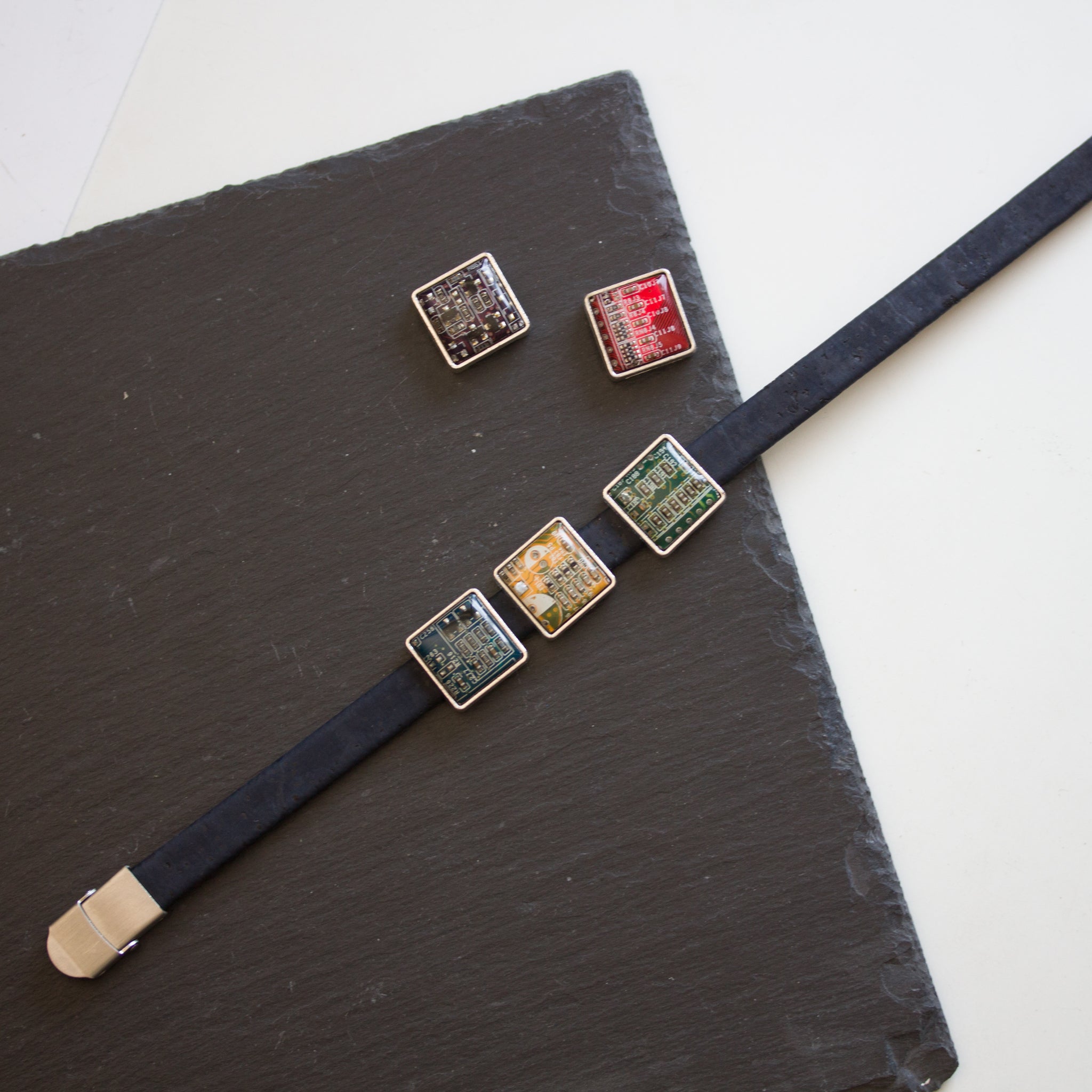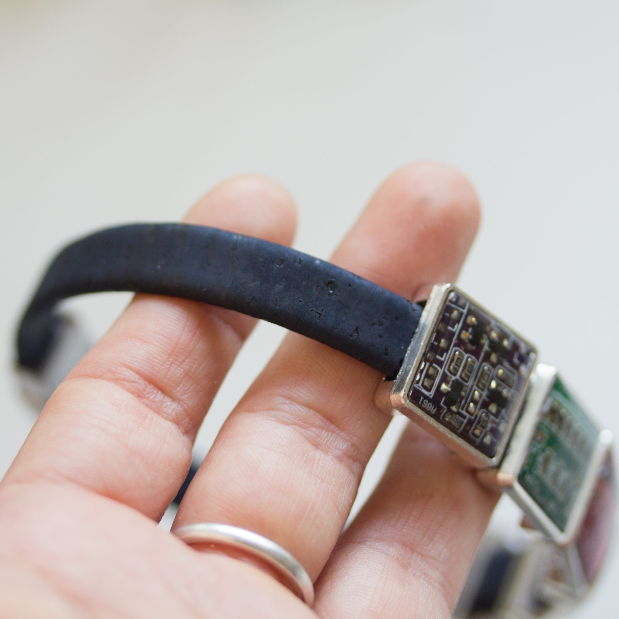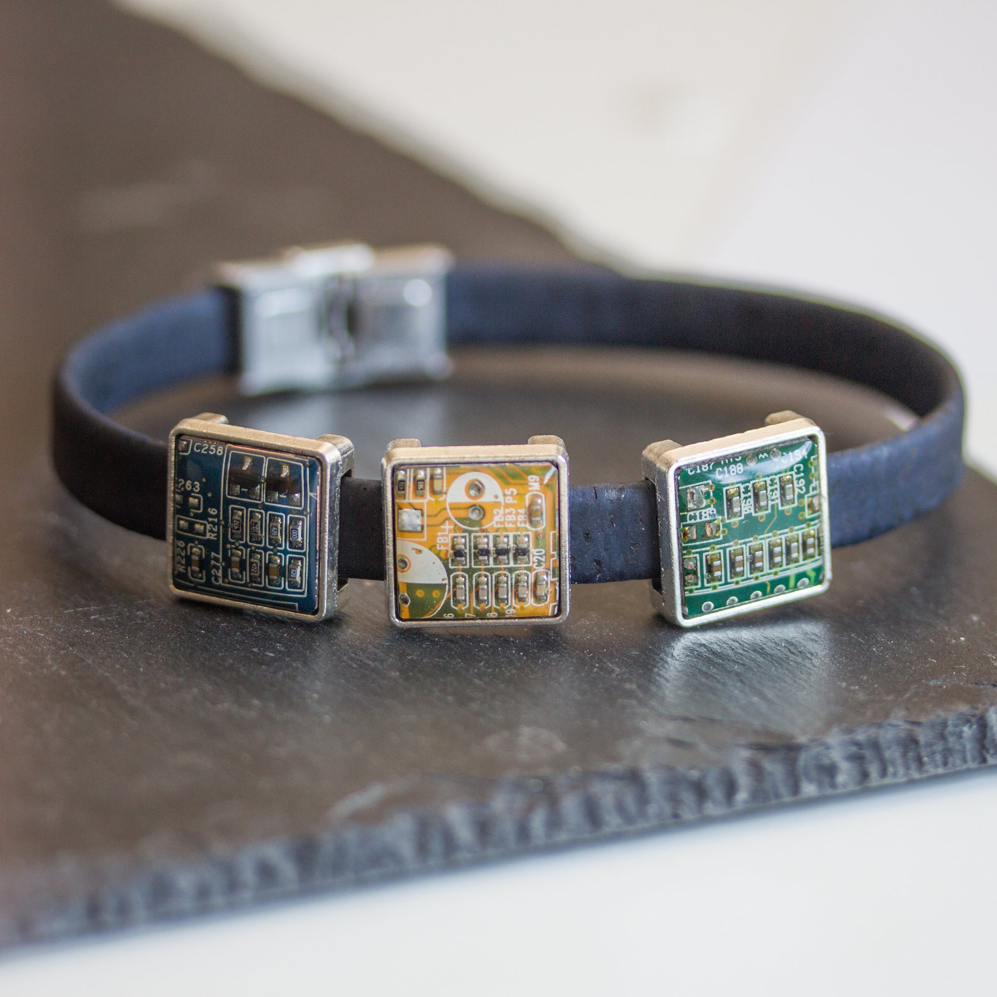 Black vegan cork bracelet, 3 or 5 circuit board beads, unisex bracelet, adjustable