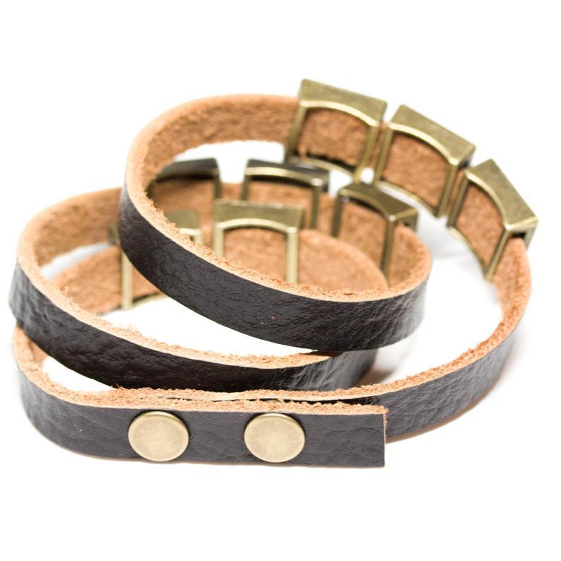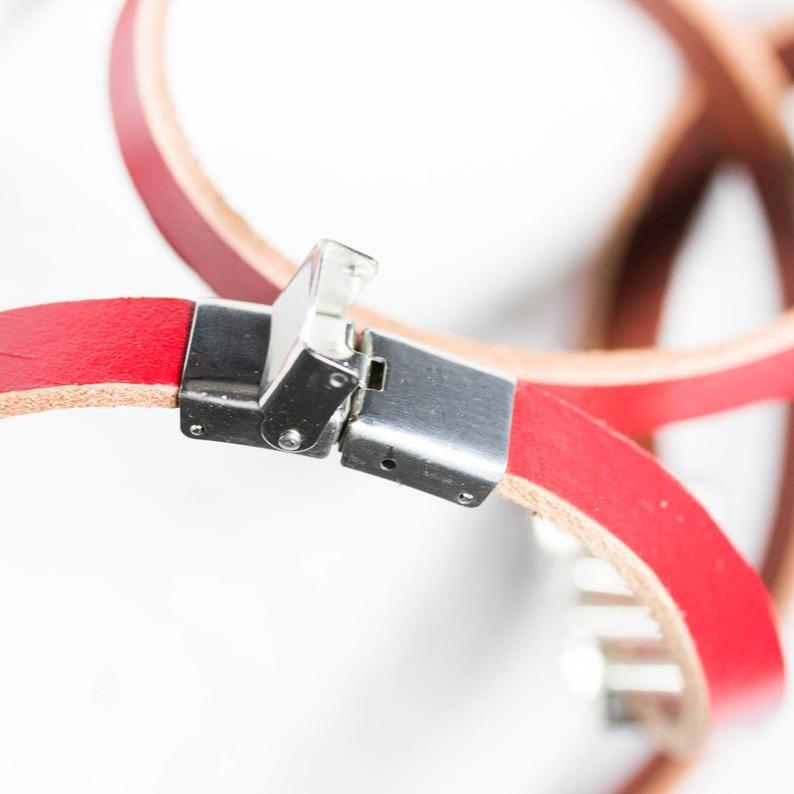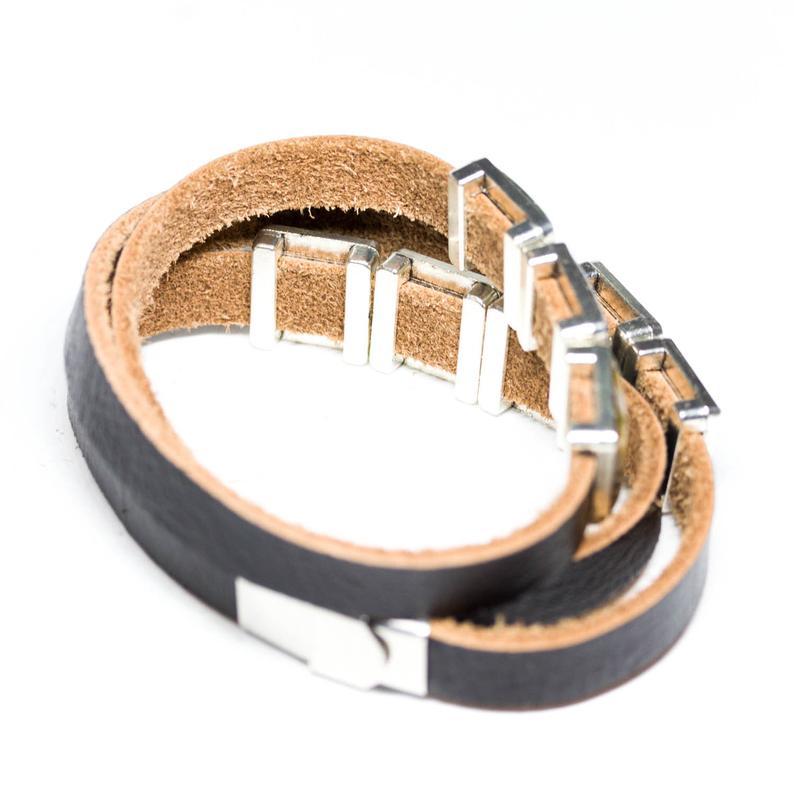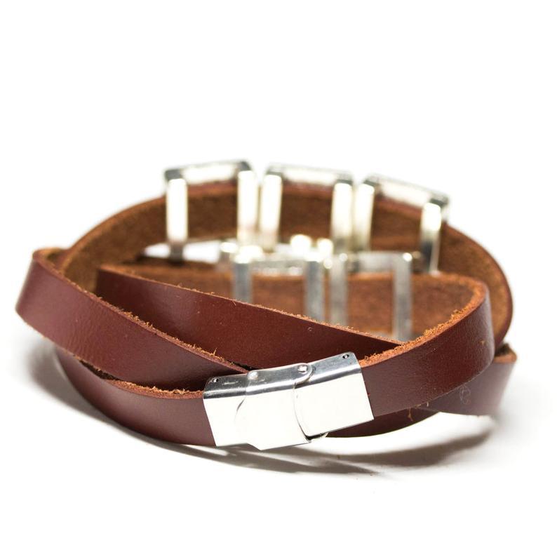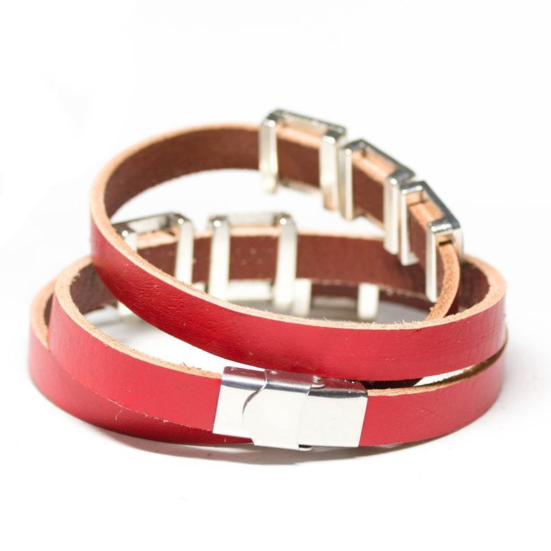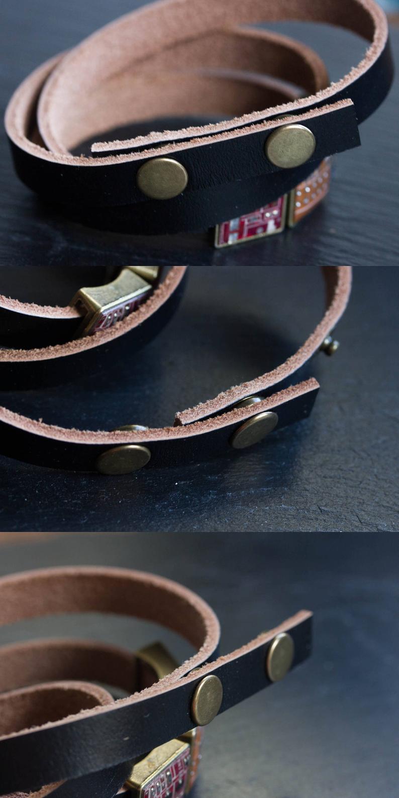 This Wrap bracelet is made of leather (red, brown or black) and circuit board beads. The square beads are 5/8" (15 mm). Bracelet length: 65 cm; Bracelet width: 10 mm The...