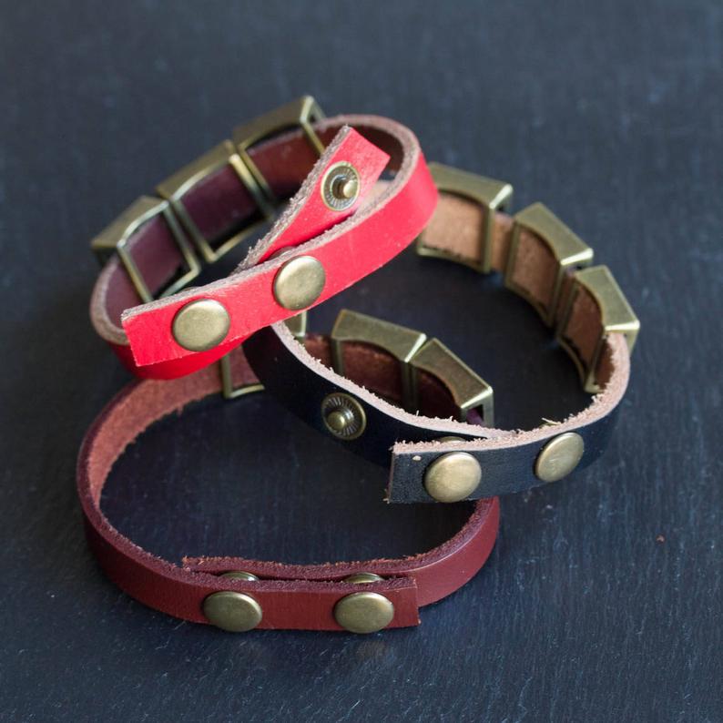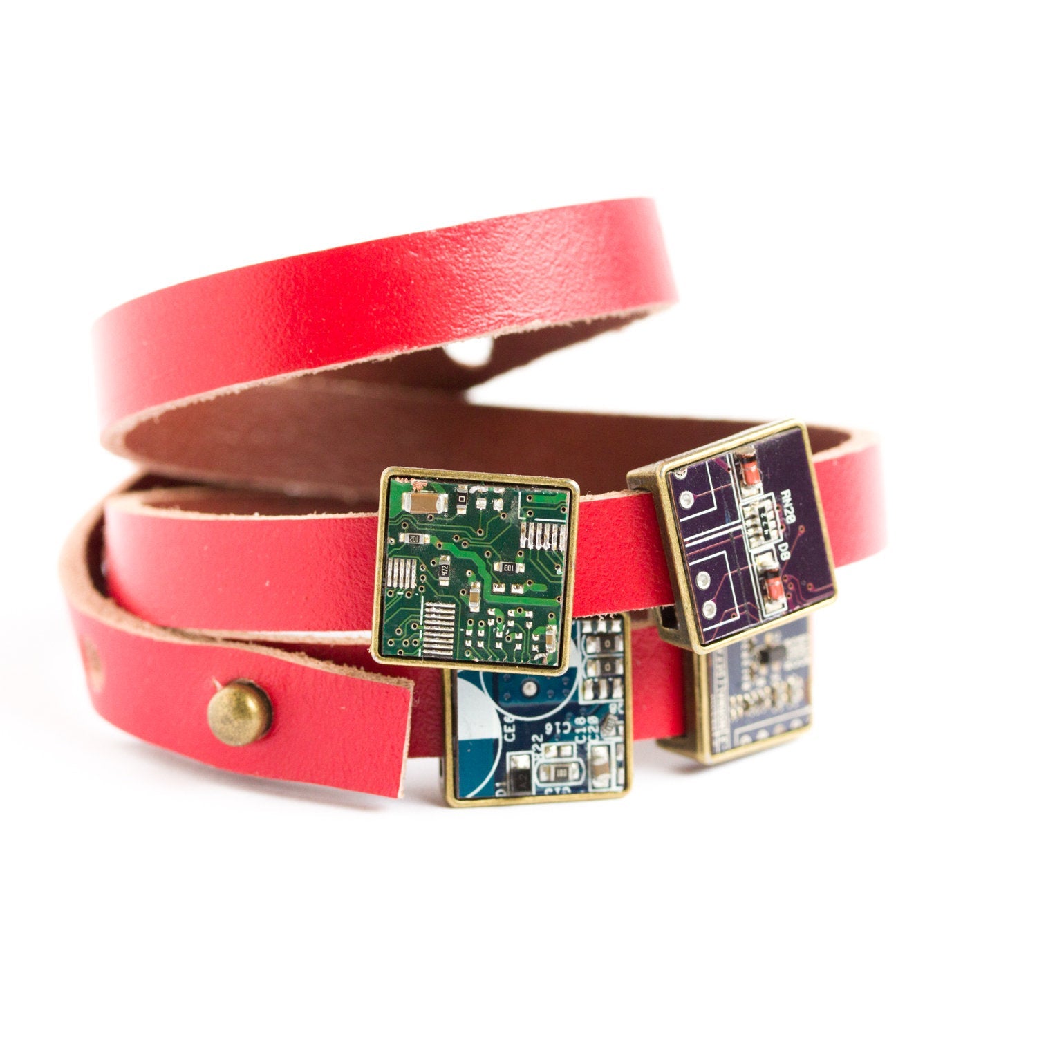 This Wrap bracelet is made of leather (red, brown or black) and circuit board beads. The square beads are 5/8" (15 mm). Bracelet length: 24 cm; Bracelet width: 10 mm. We...