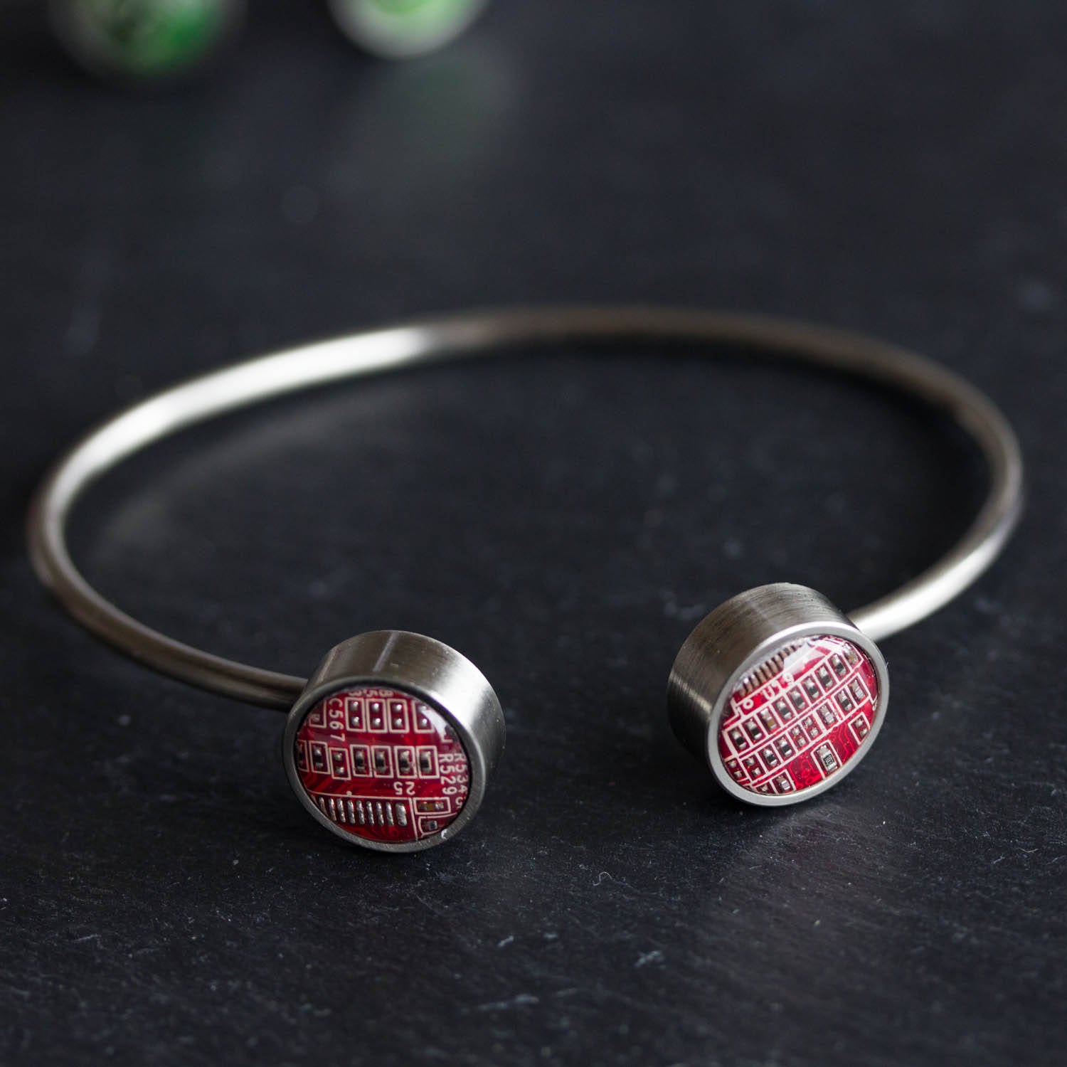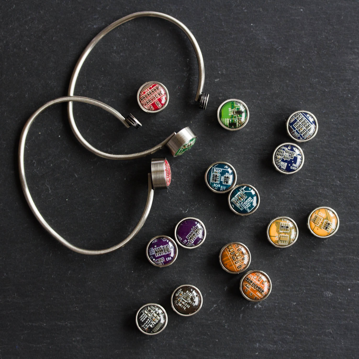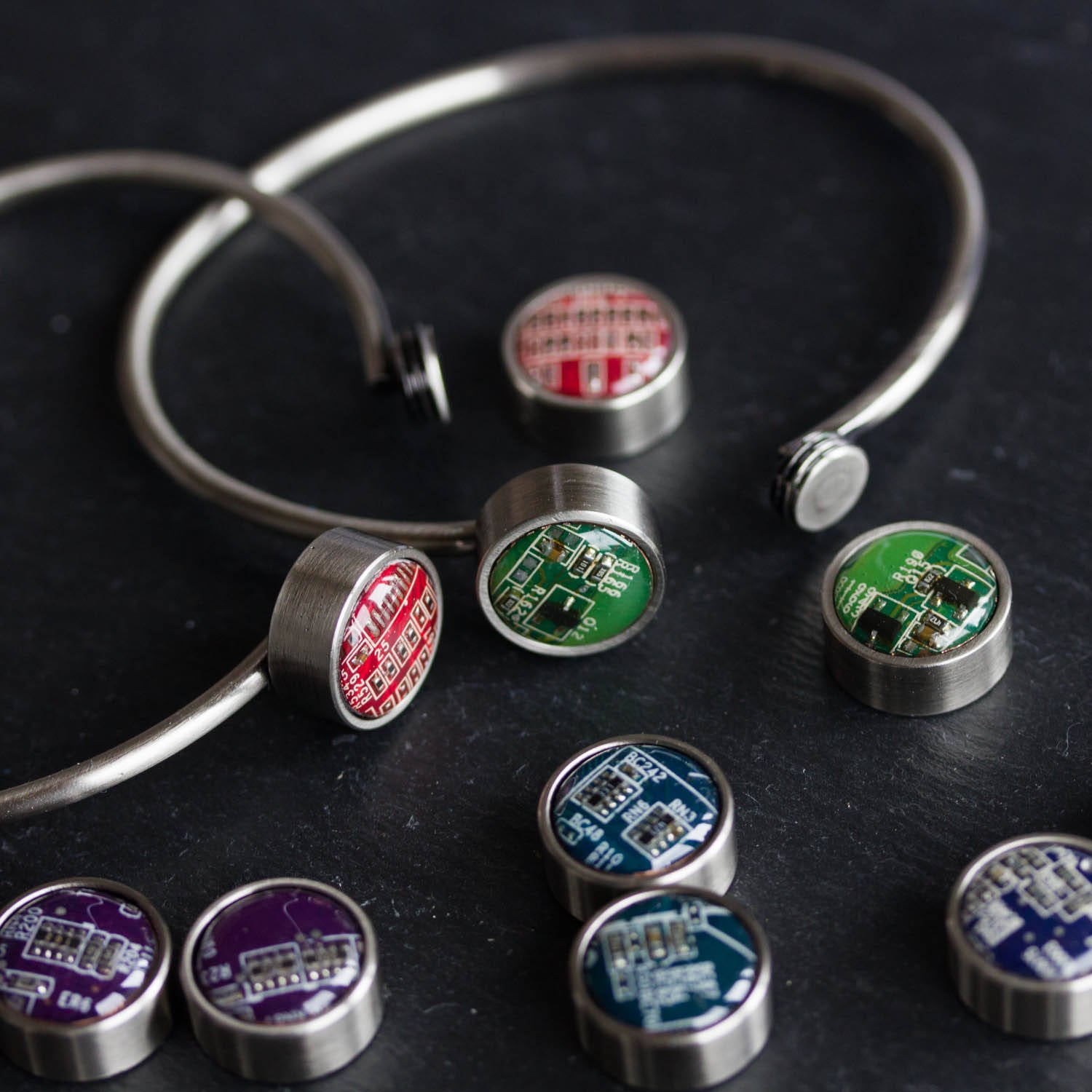 The Bangle Bracelet with interchangeable Circuit board buttons. Buy just one bangle + 2 screw buttons or buy all the 8 colors and change them as often as you want!The...