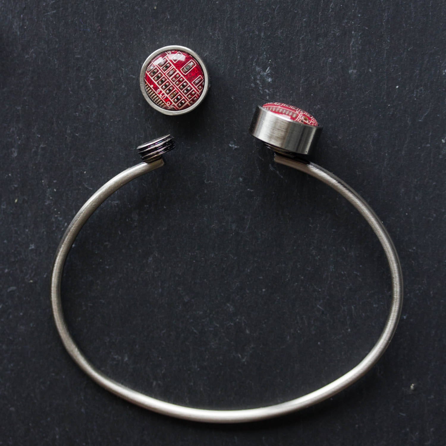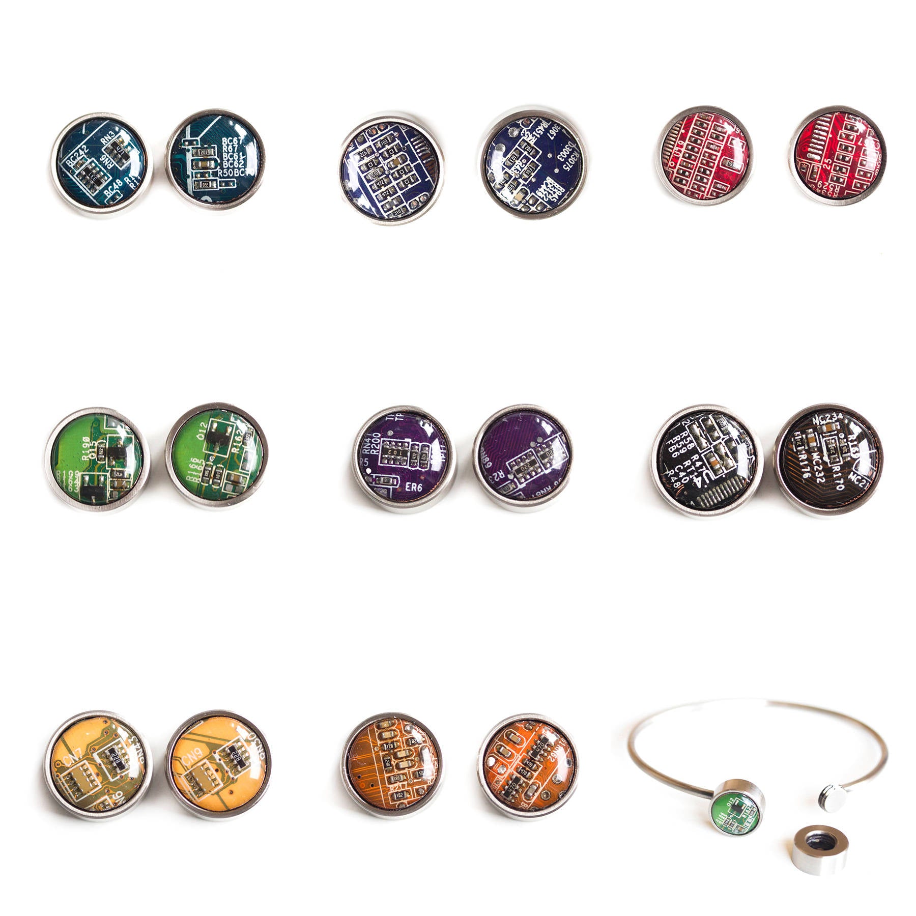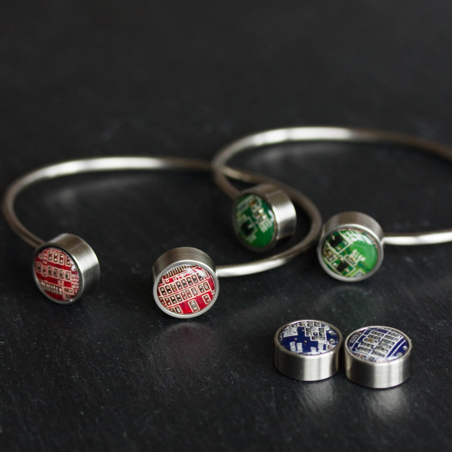 The Bangle Bracelet with interchangeable Circuit board buttons. Buy just one bangle + 2 screw buttons or buy all the 8 colors and change them as often as you want!The...