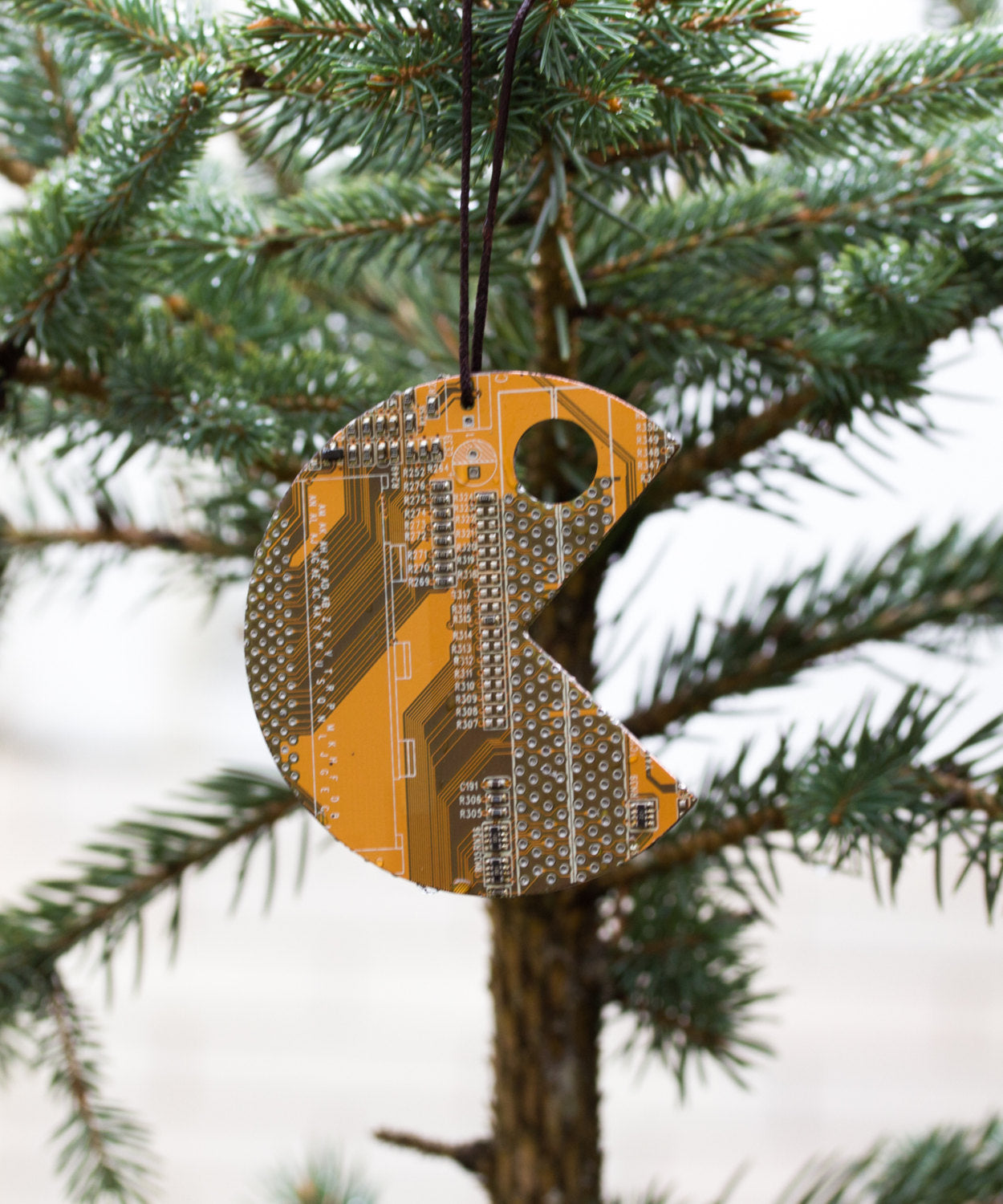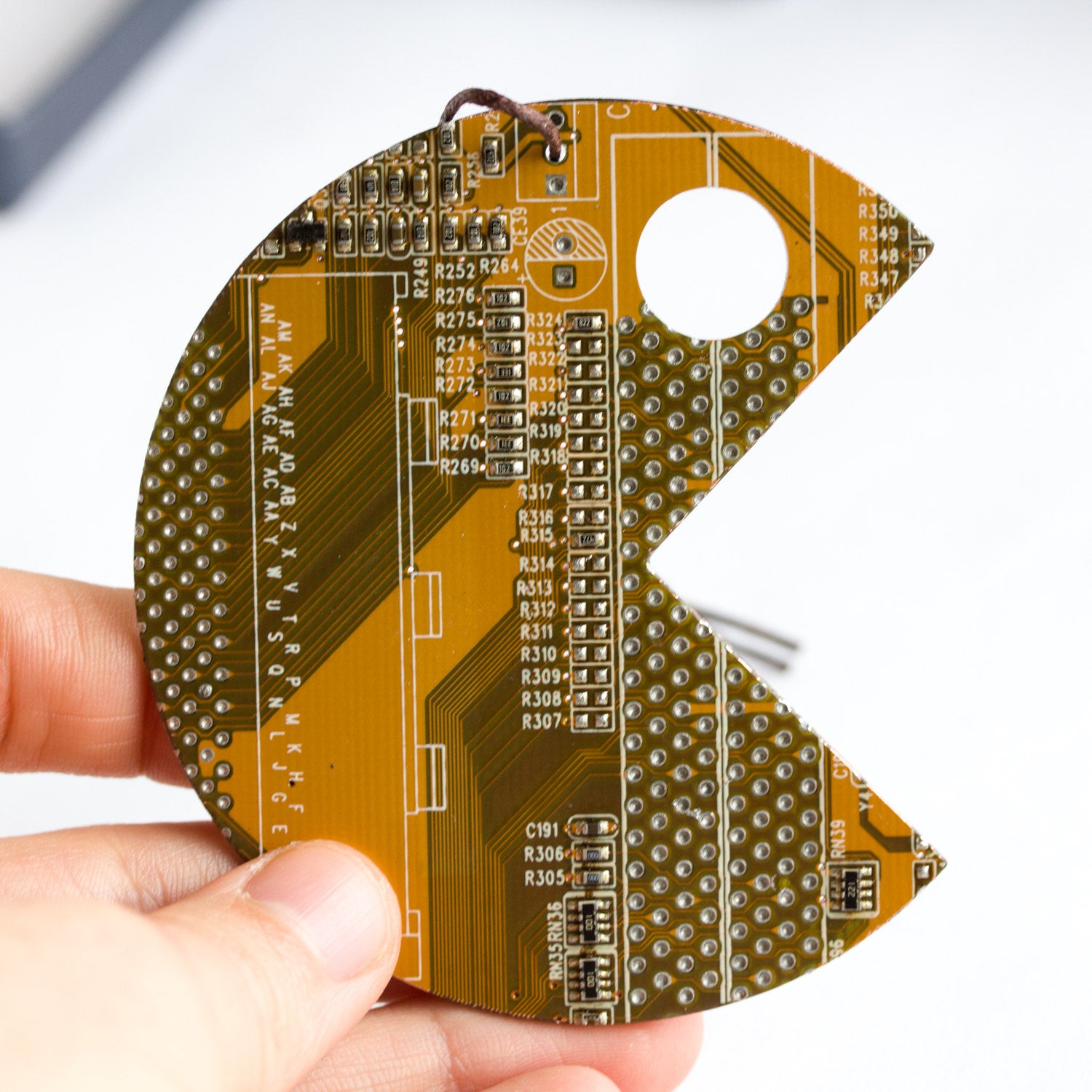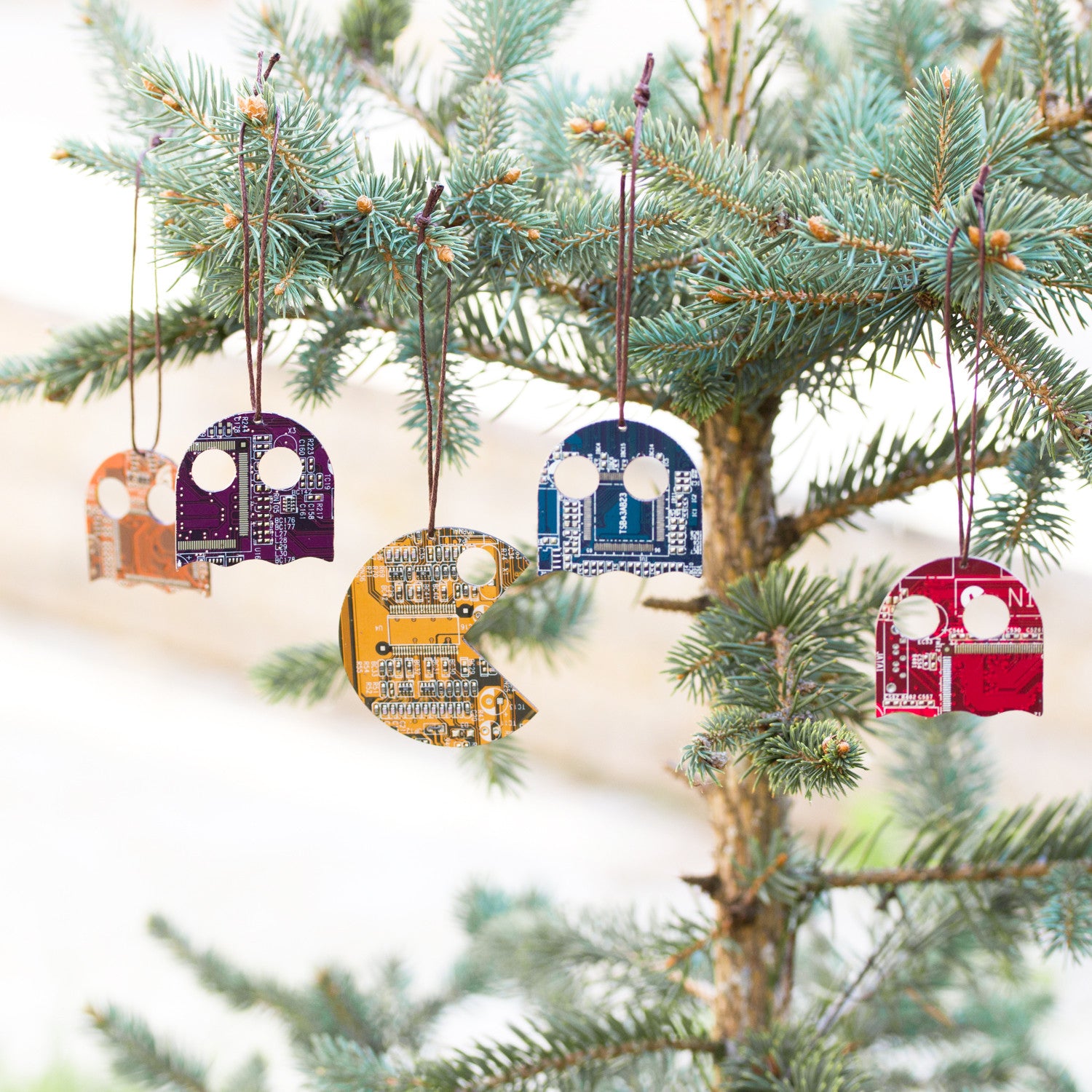 Pacman Christmas Tree ornaments are inspired by an old video game. It contains 5 items, all are made of real circuit boards, yellow (olive green), red, blue, purple and orange...