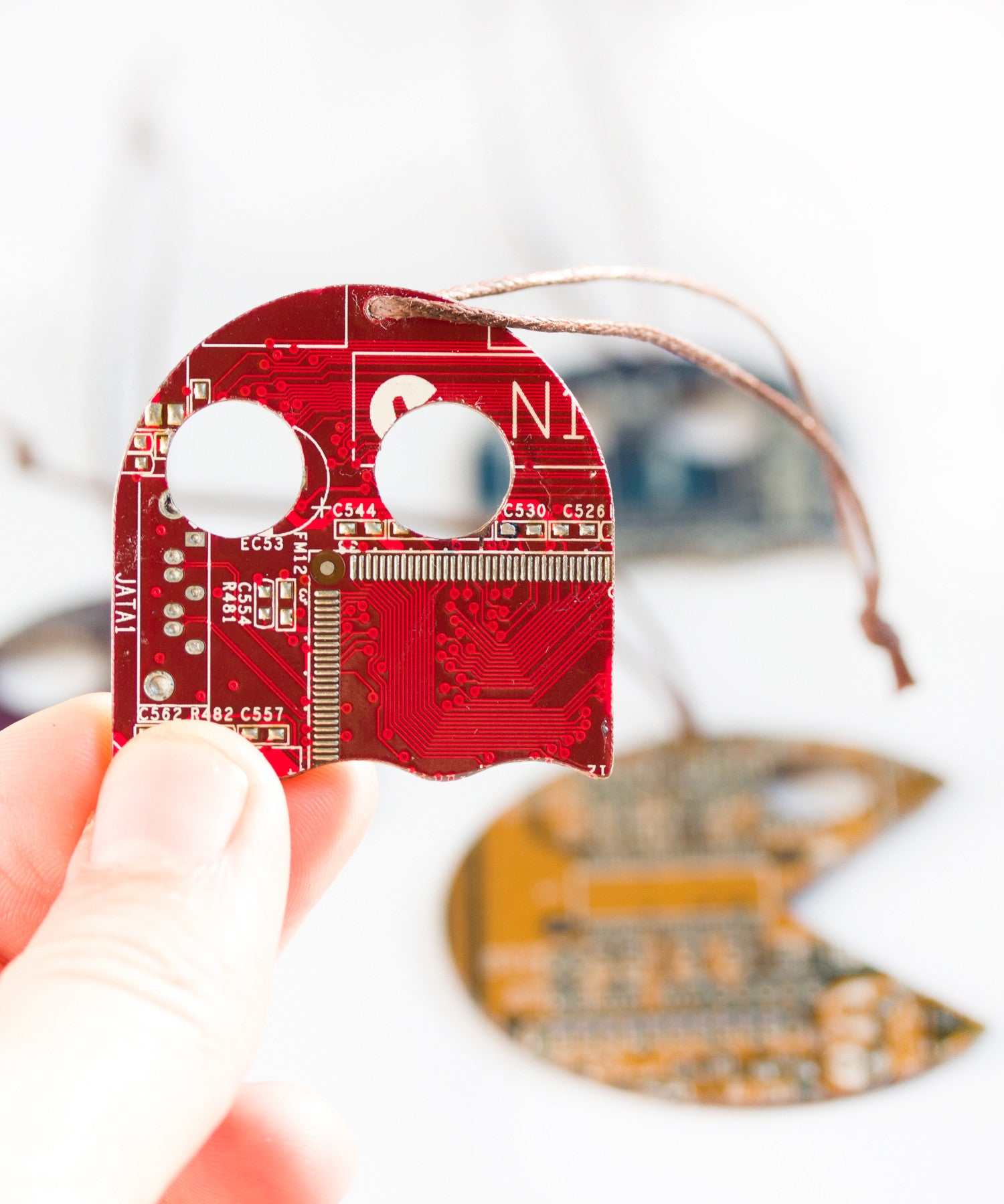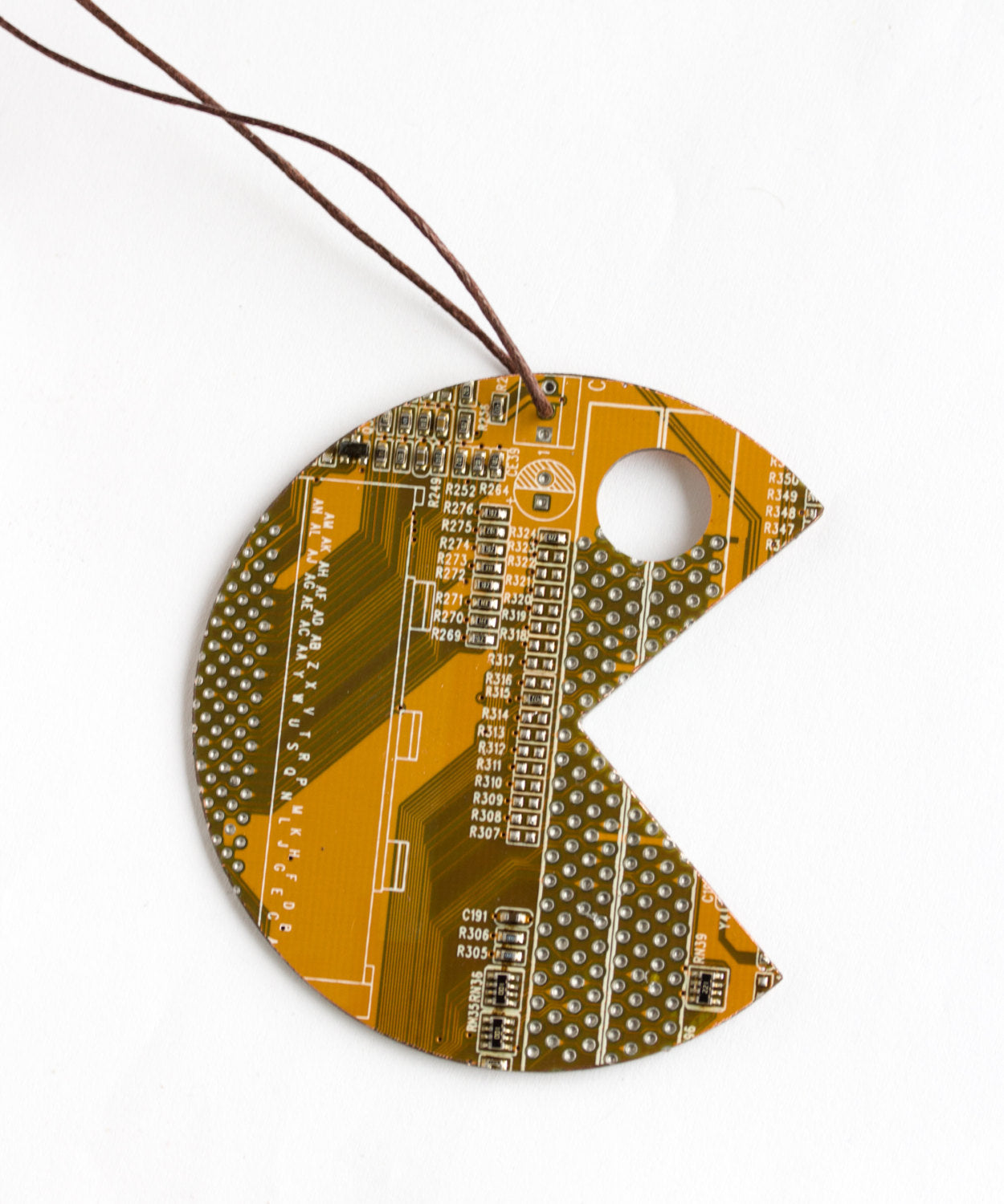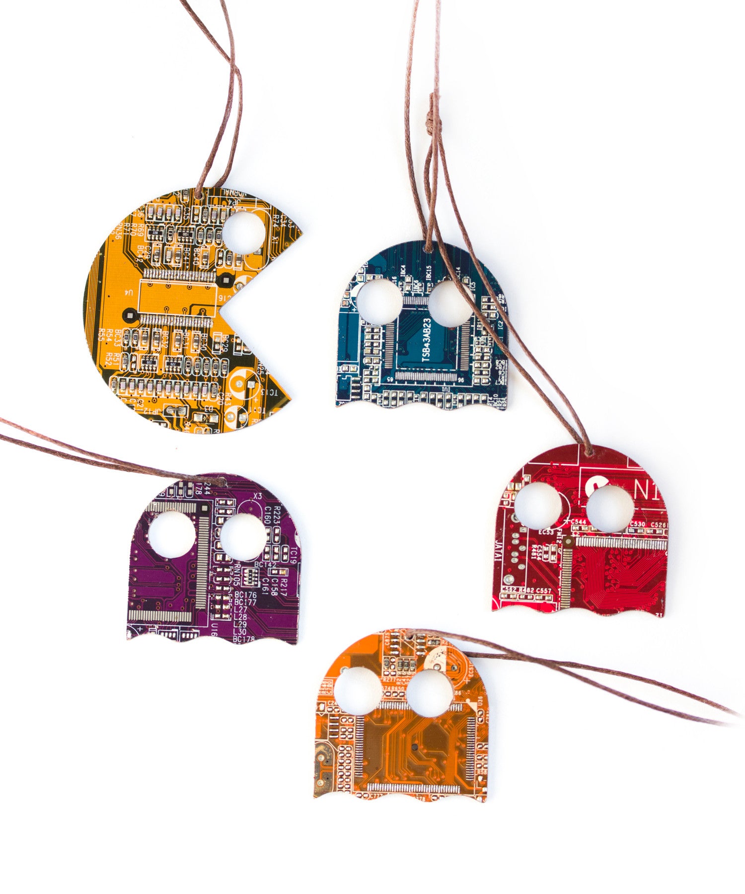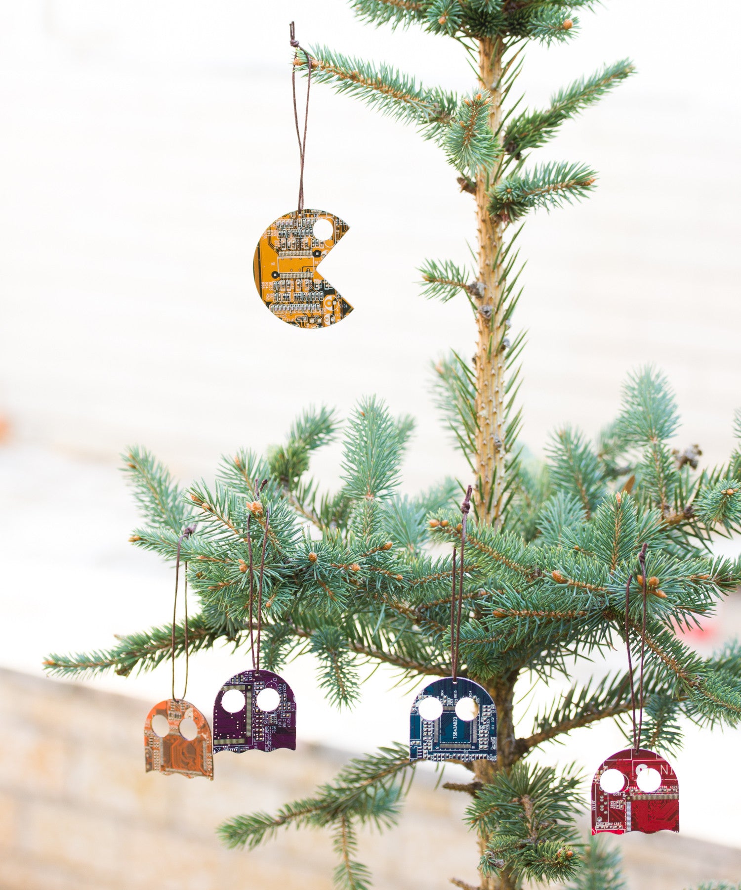 Pacman Christmas Tree ornaments are inspired by an old video game. It contains 5 items, all are made of real circuit boards, yellow (olive green), red, blue, purple and orange...