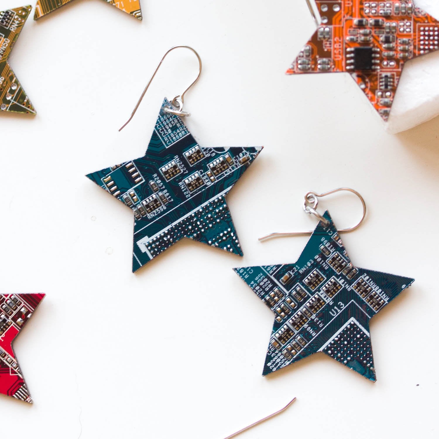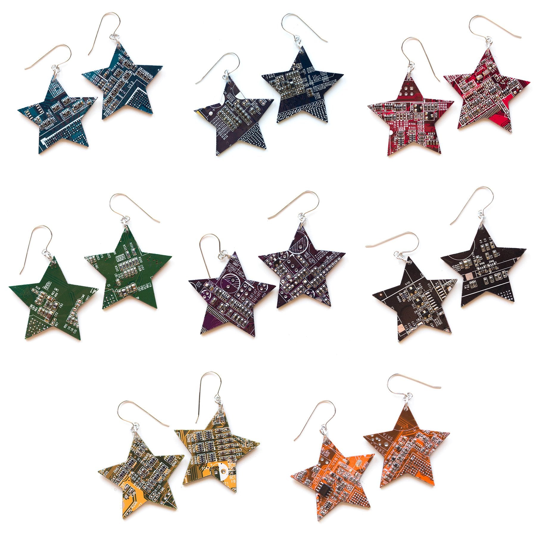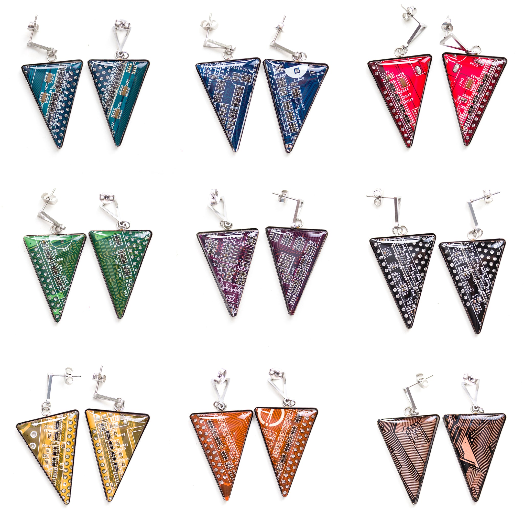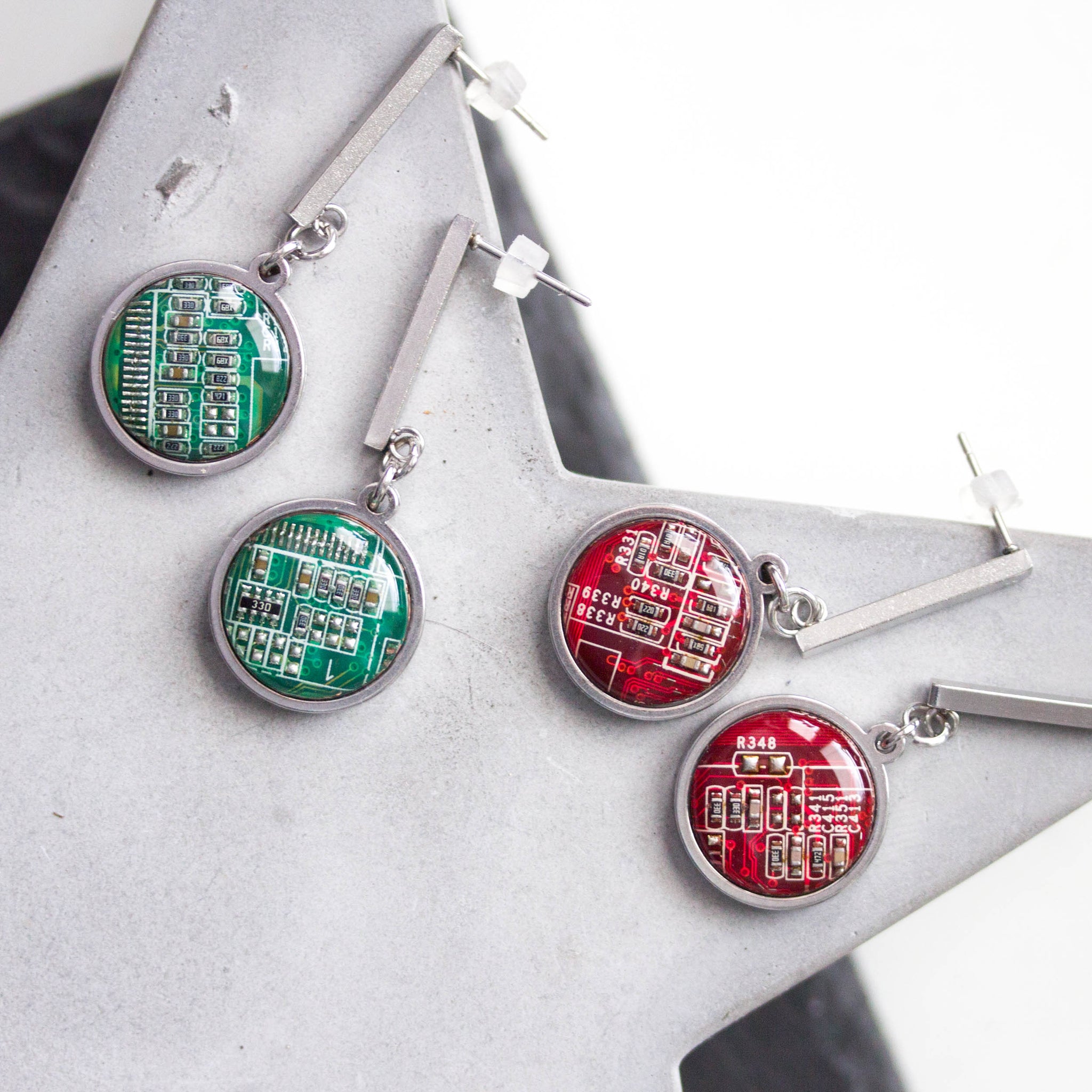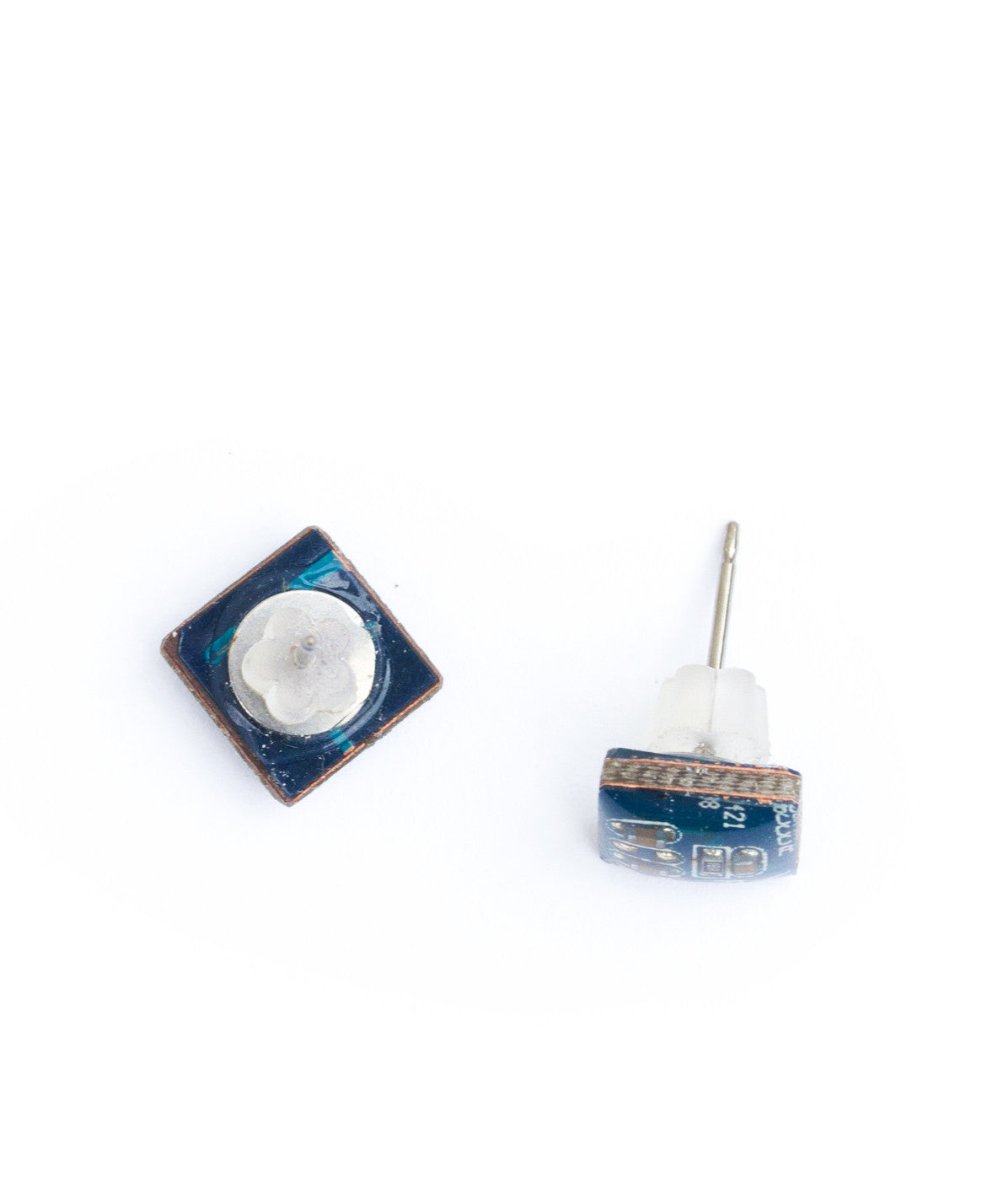 Stud earrings with dangle rectangular circuit board pendants. The pendants are made from pieces of a real computer's circuit board. The surface is covered with clear resin and is as...