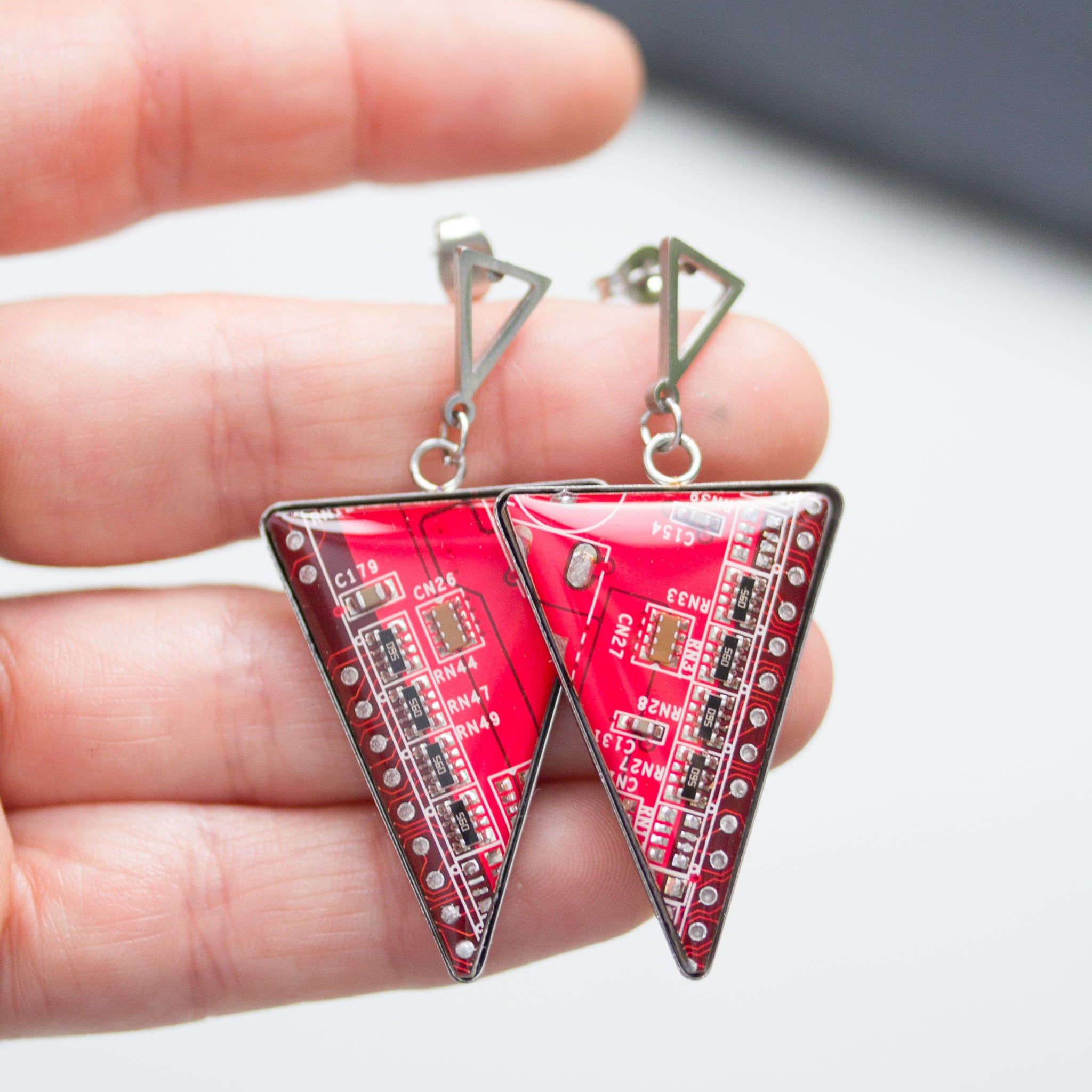 Dangle circuit board earrings are made of a piece of a real circuit board (23x33 mm). It is covered with a clear resin, so the surface is as shiny as...