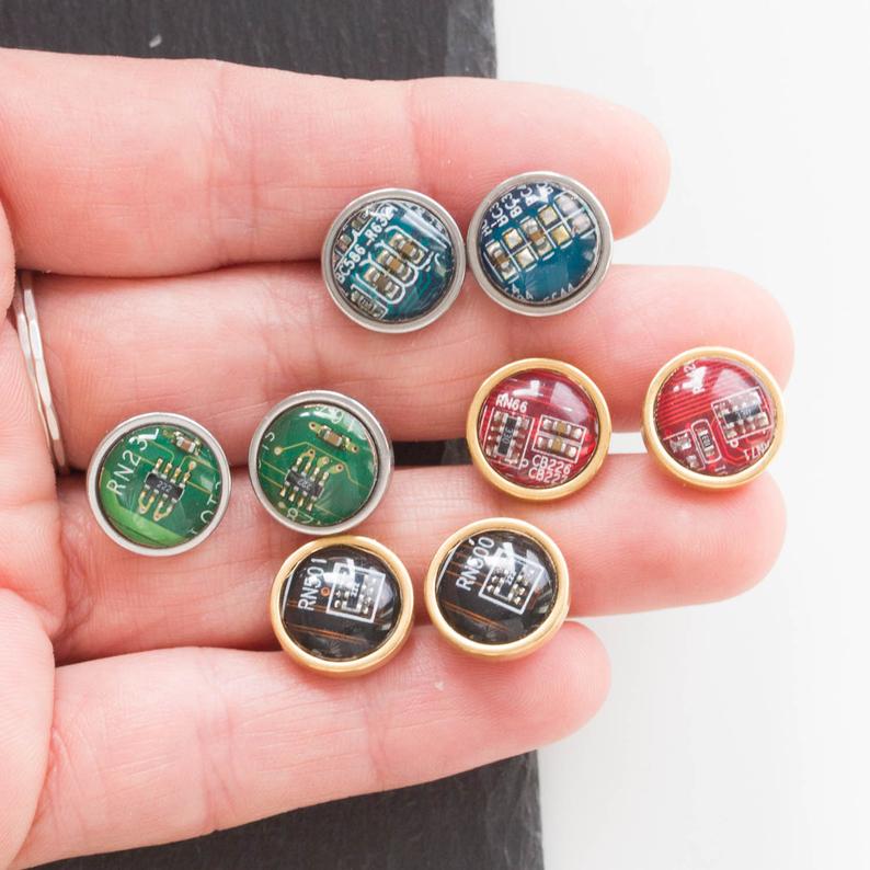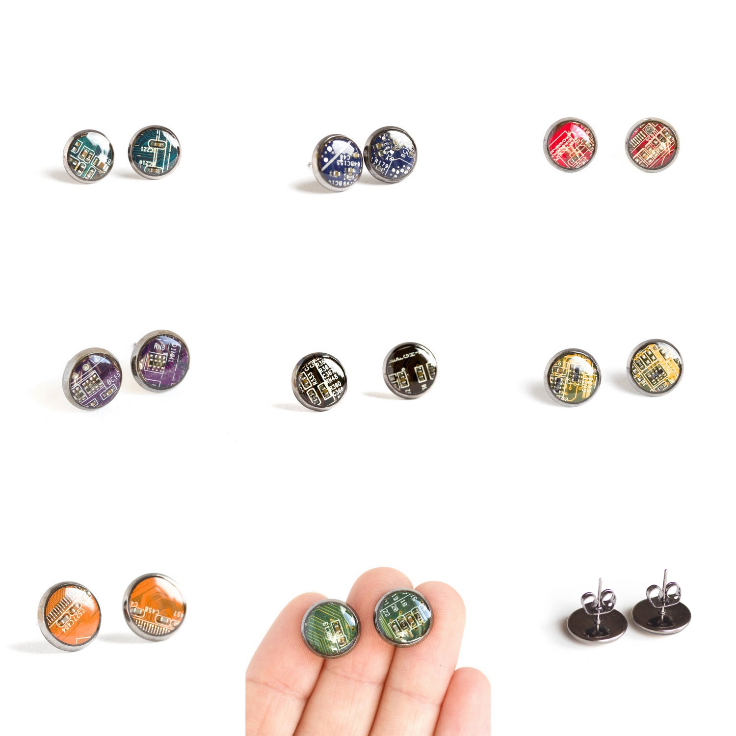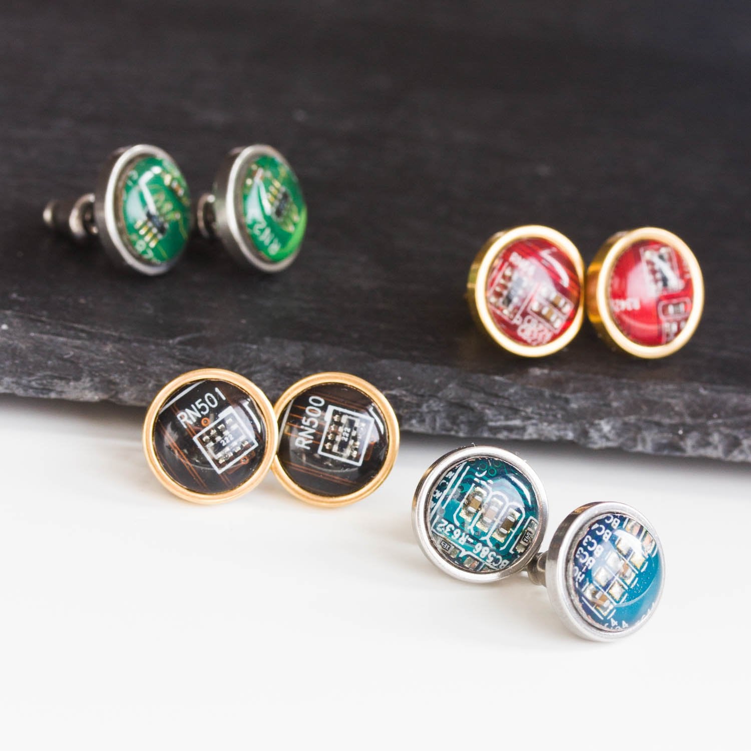 Circuit Board Stud Earrings in a round stainless steel base. These earrings are made from pieces of real computer's circuit board. The surface is covered with clear resin and is...