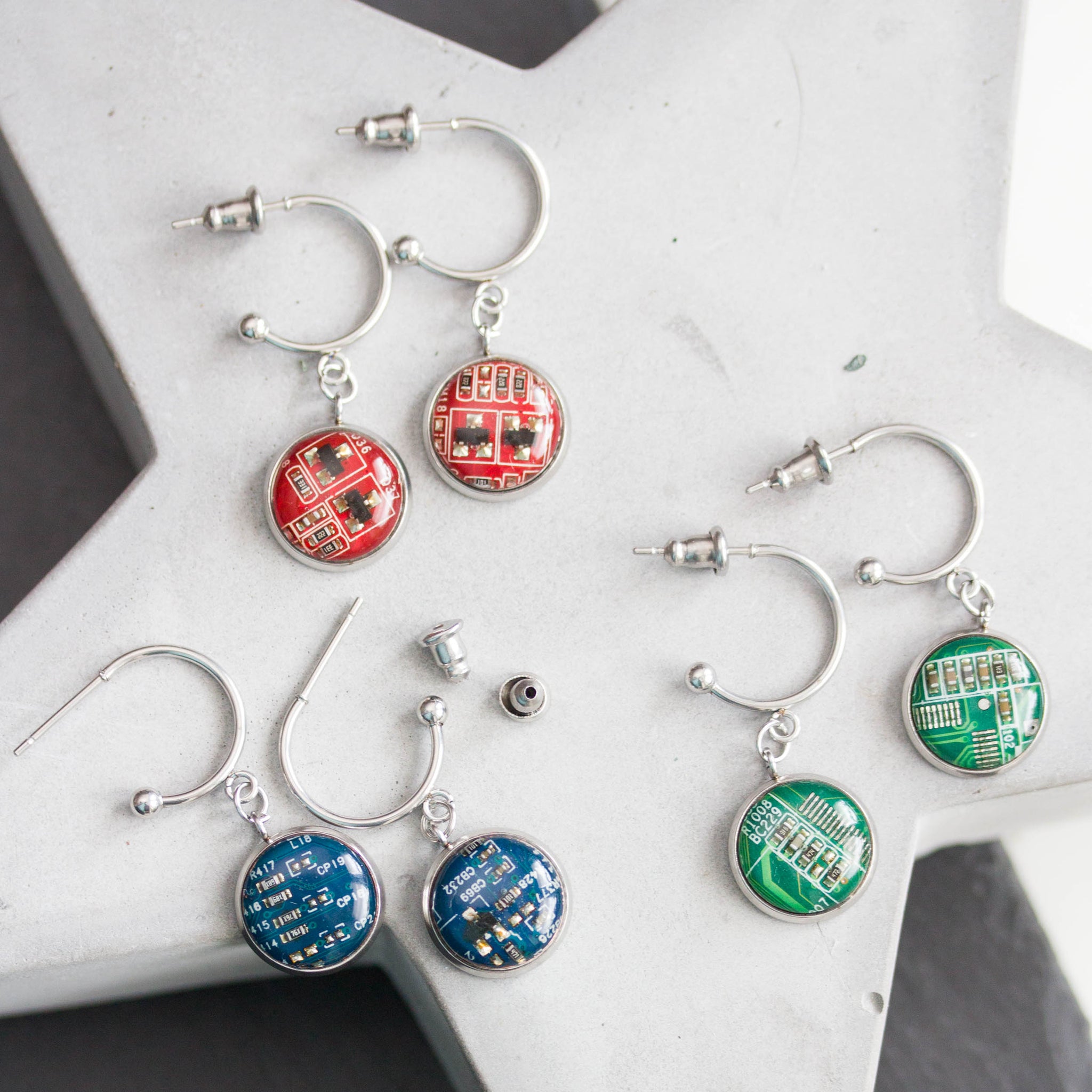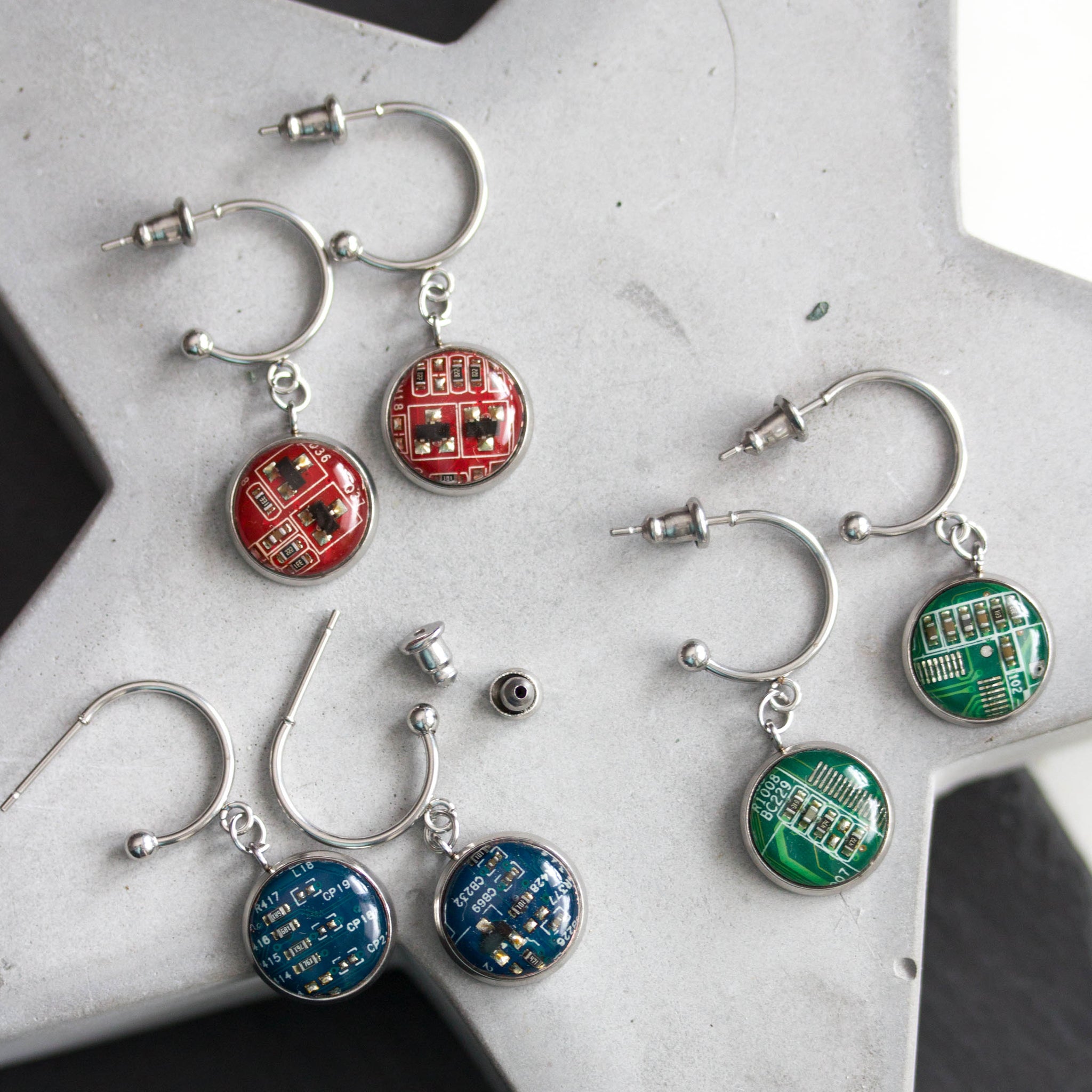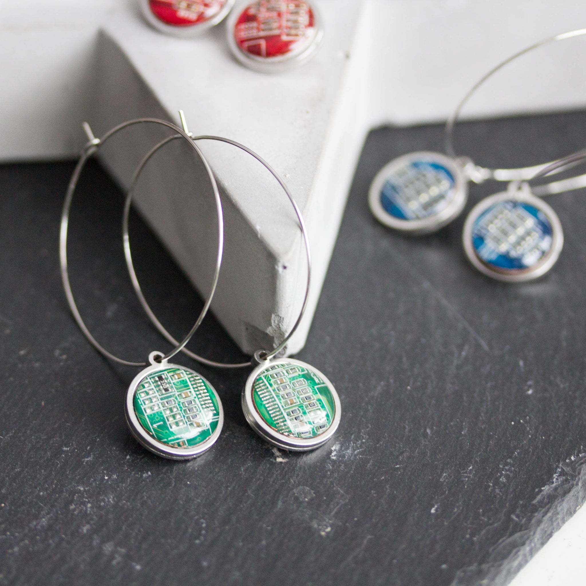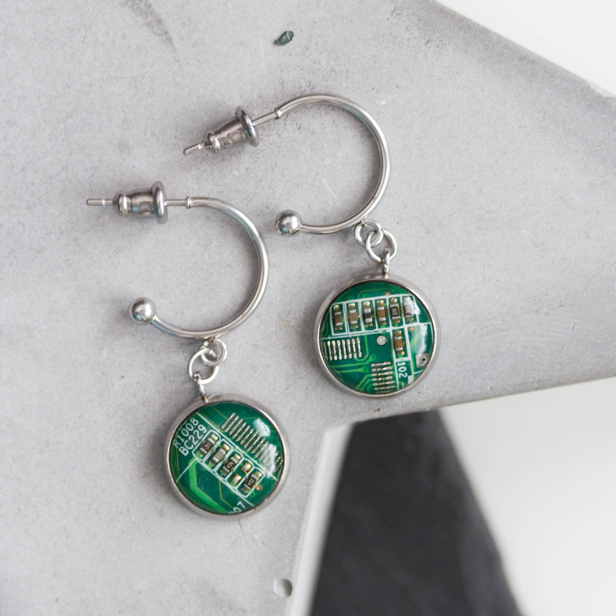 Hoop earrings with 12mm round circuit board pendants. The pendants are made from pieces of a real computer's circuit board. The surface is covered with clear resin and is as...