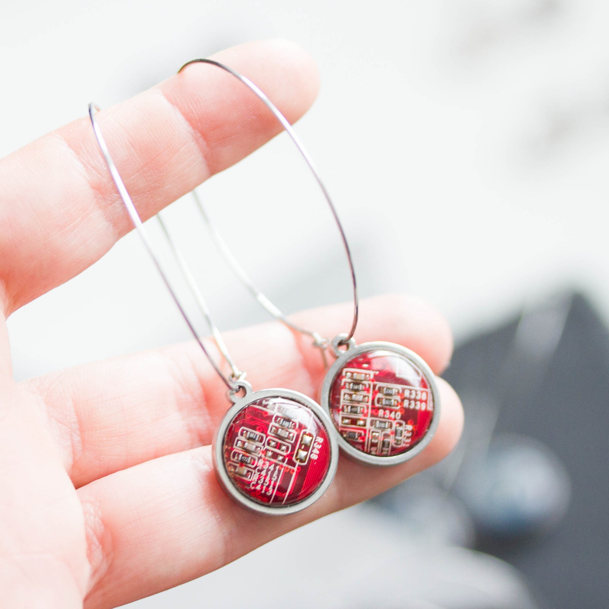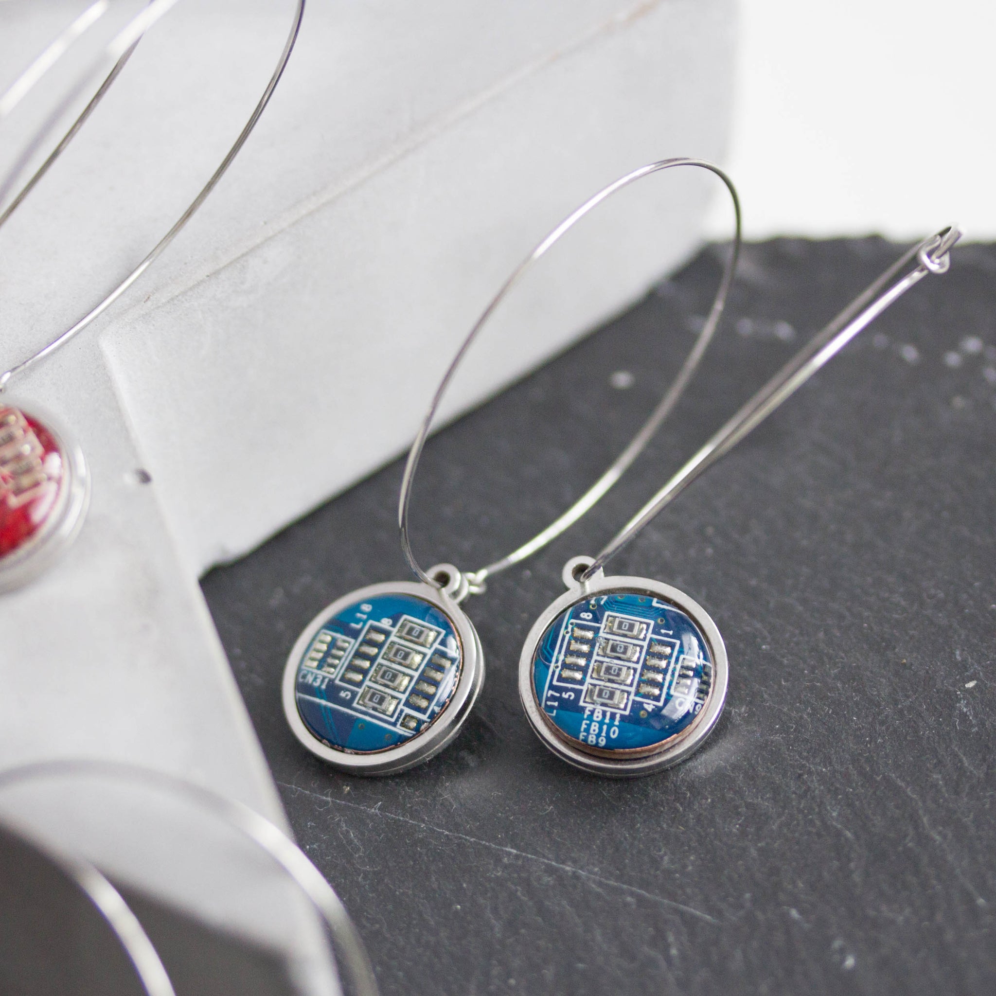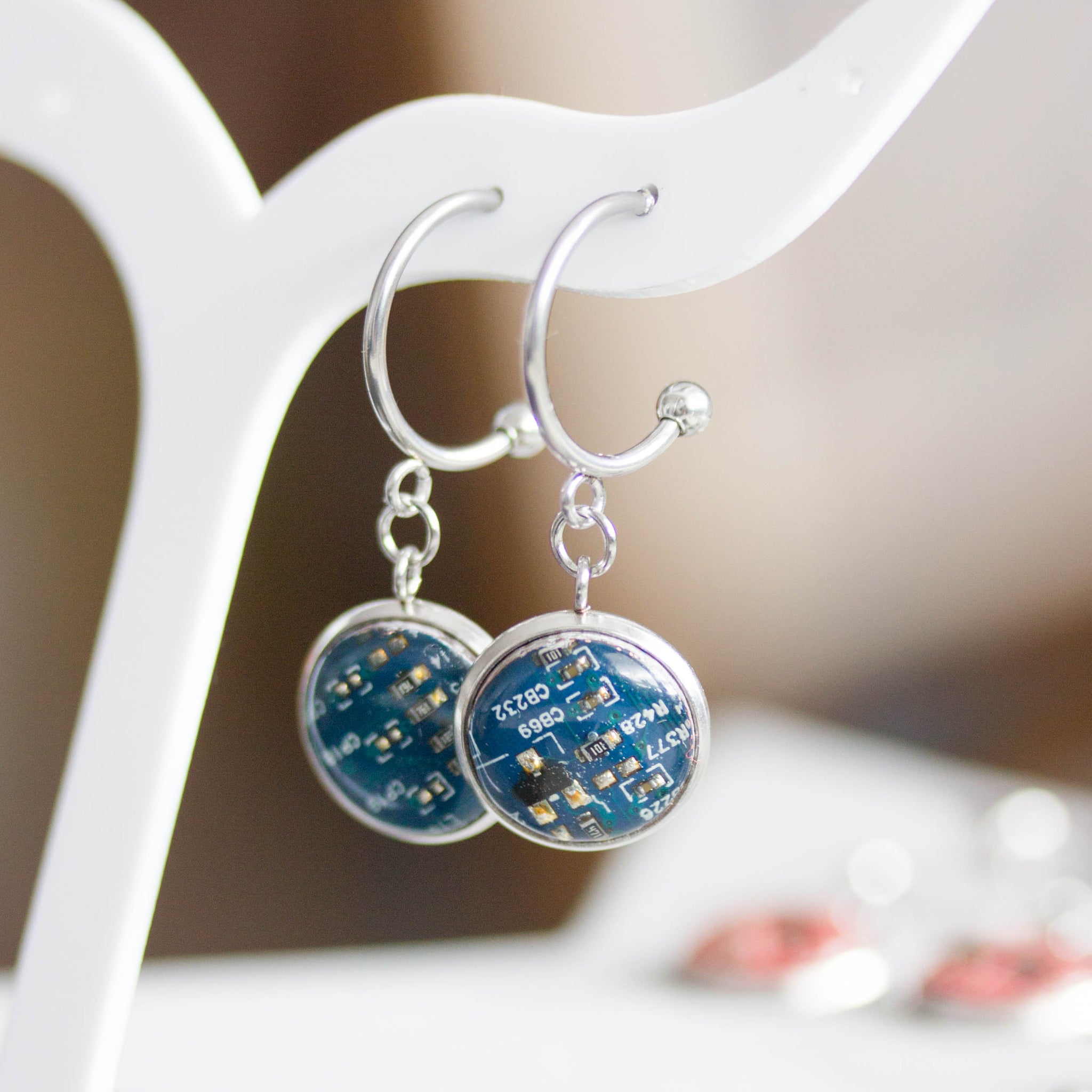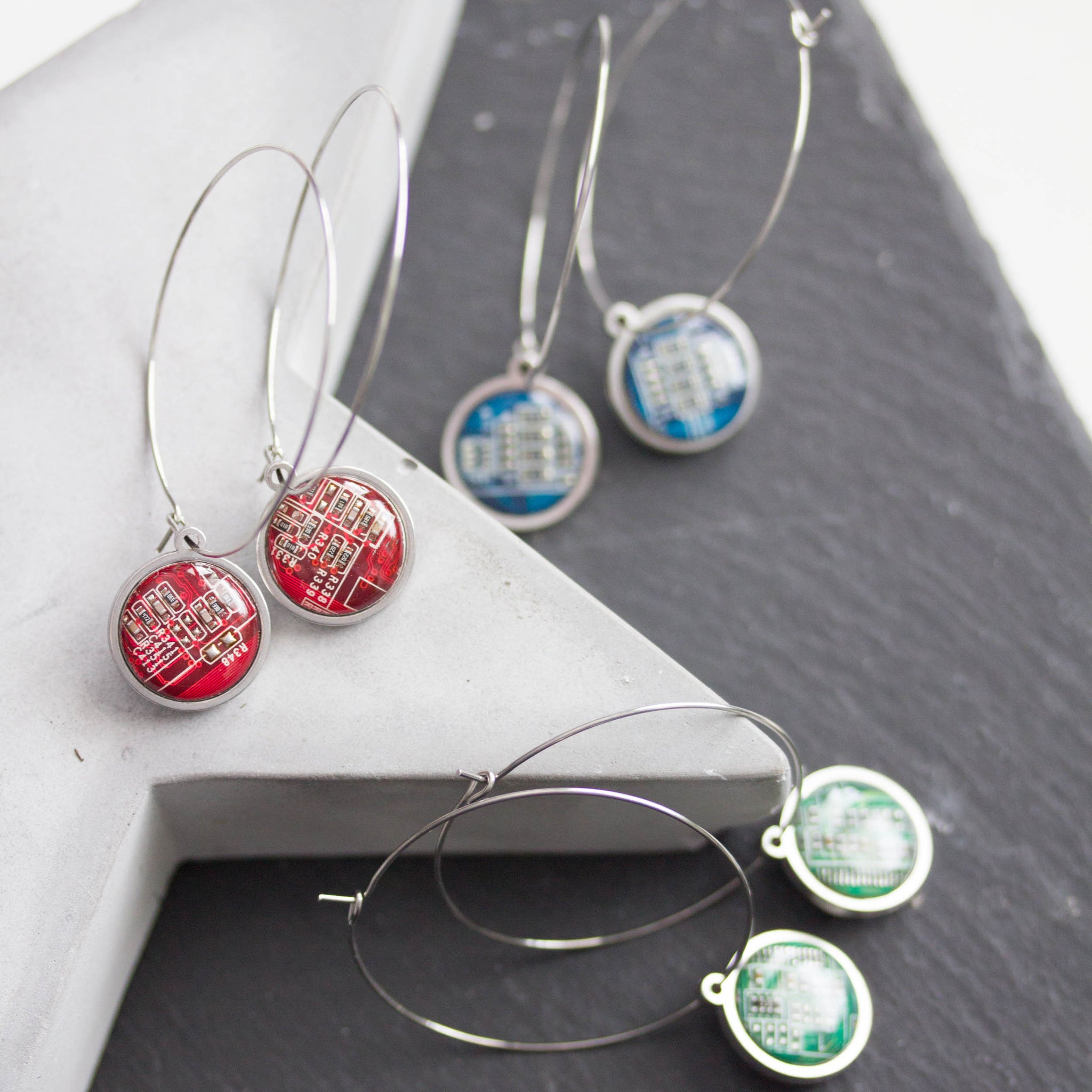 Hoop earrings with 12mm round circuit board pendants. The pendants are made from pieces of a real computer's circuit board. The surface is covered with clear resin and is as...