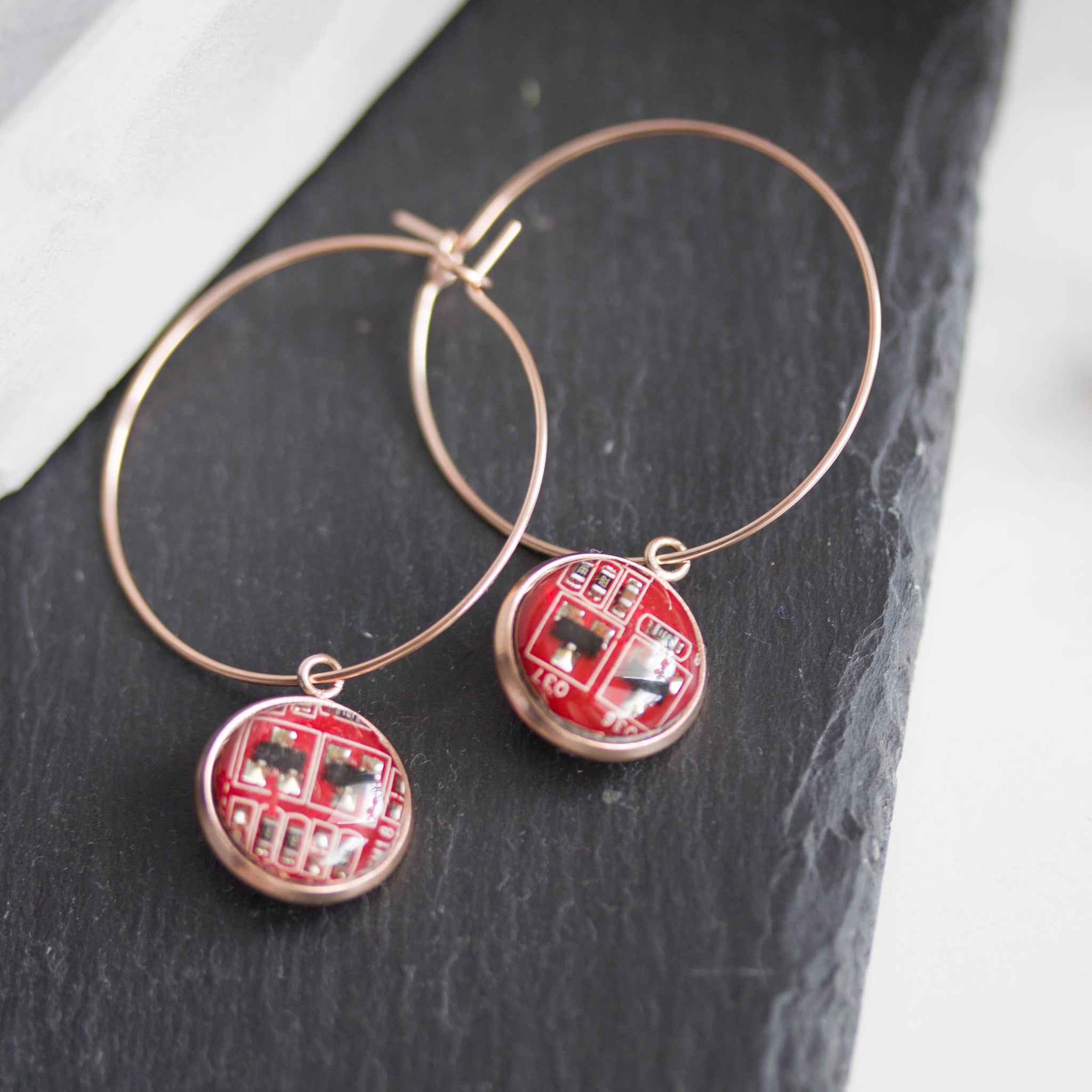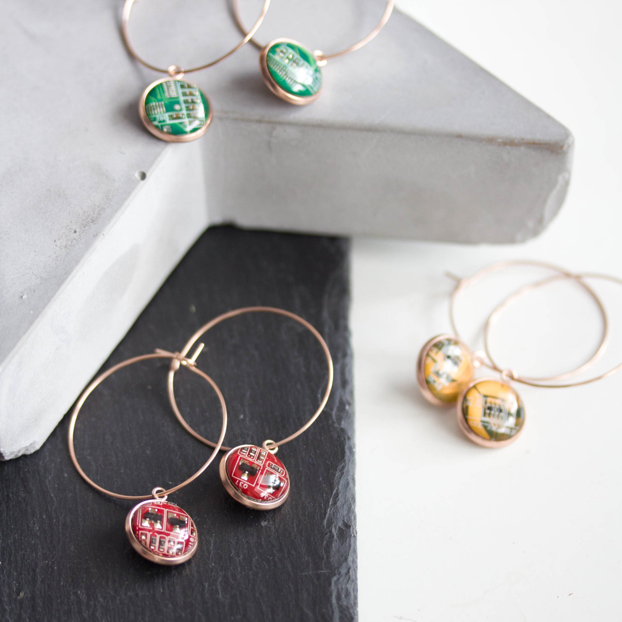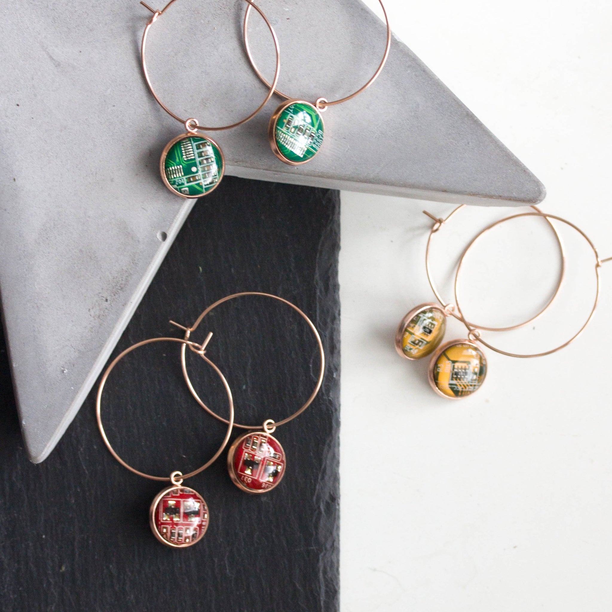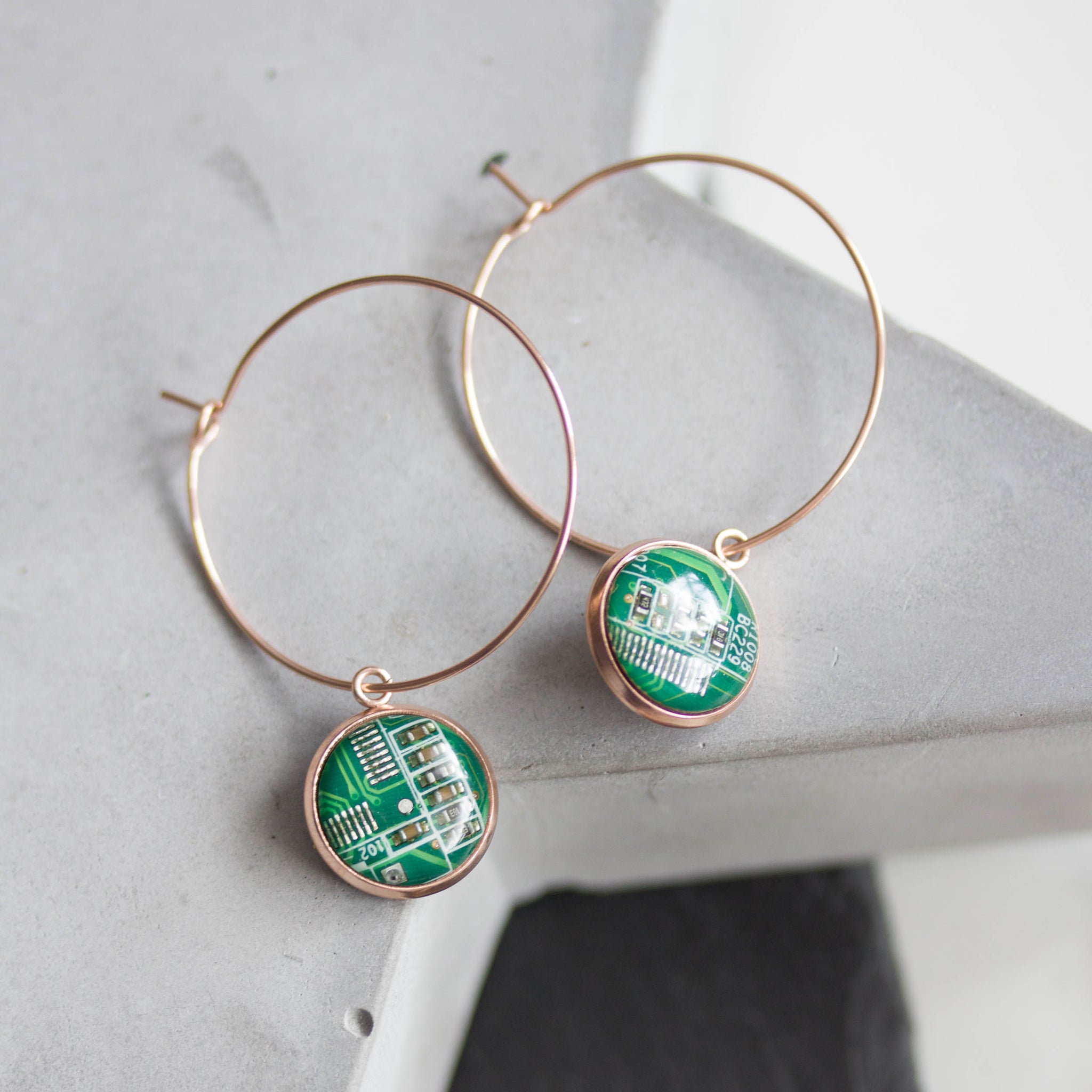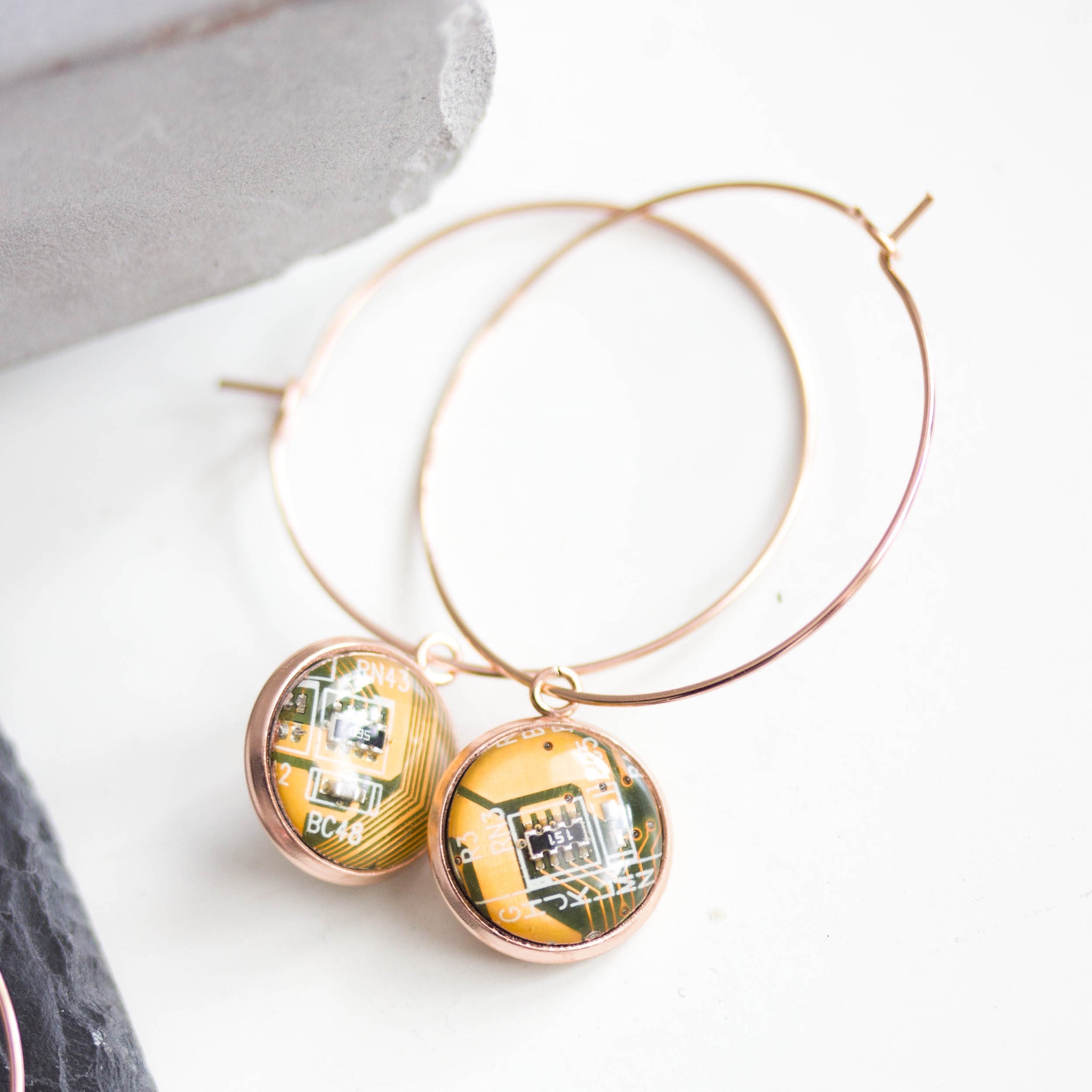 Hoop earrings with 12mm round circuit board pendants, rose gold colored wires