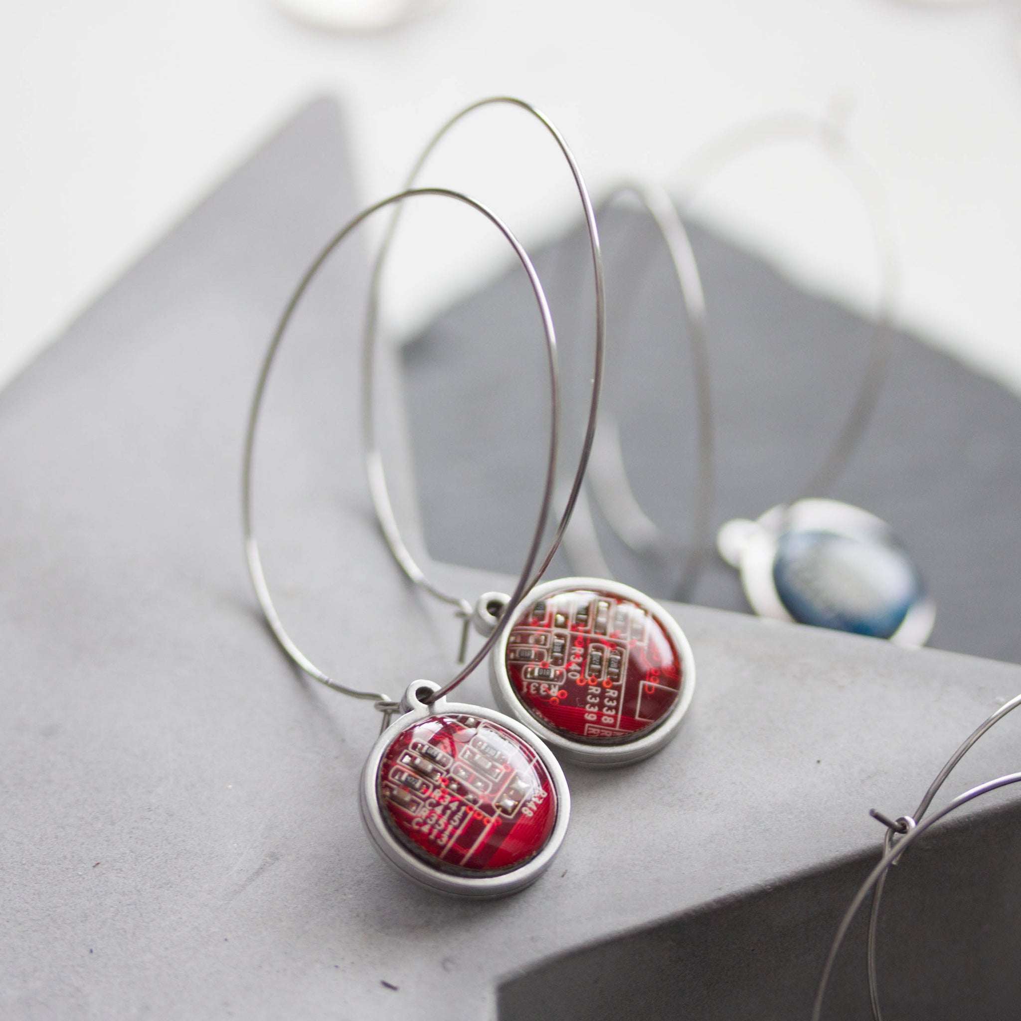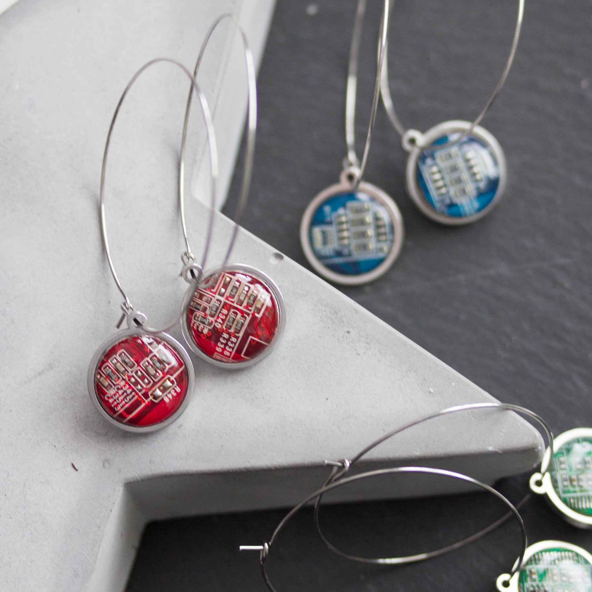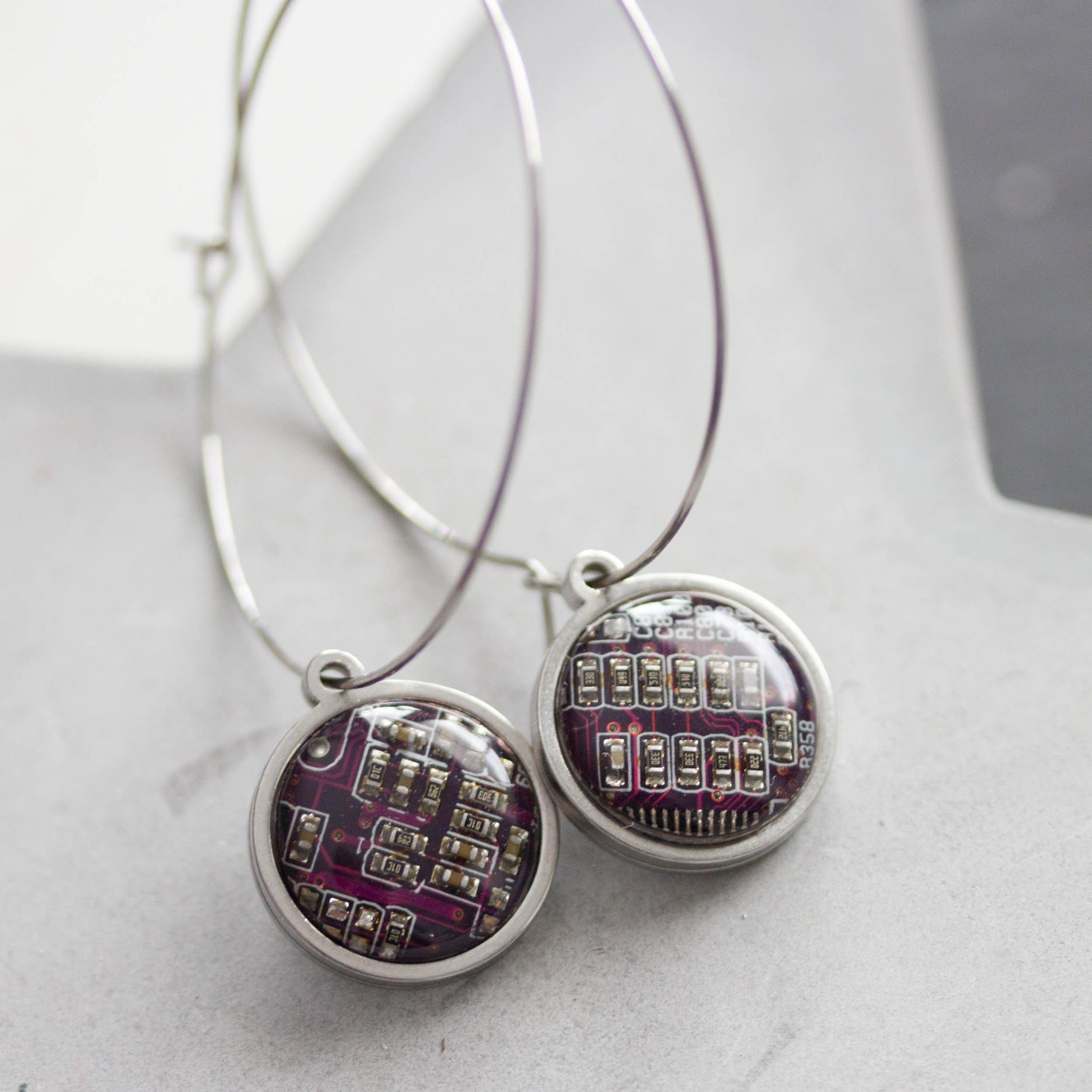 Hoop earrings with 15mm round circuit board pendants. The pendants are made from pieces of a real computer's circuit board. The surface is covered with clear resin and is as...