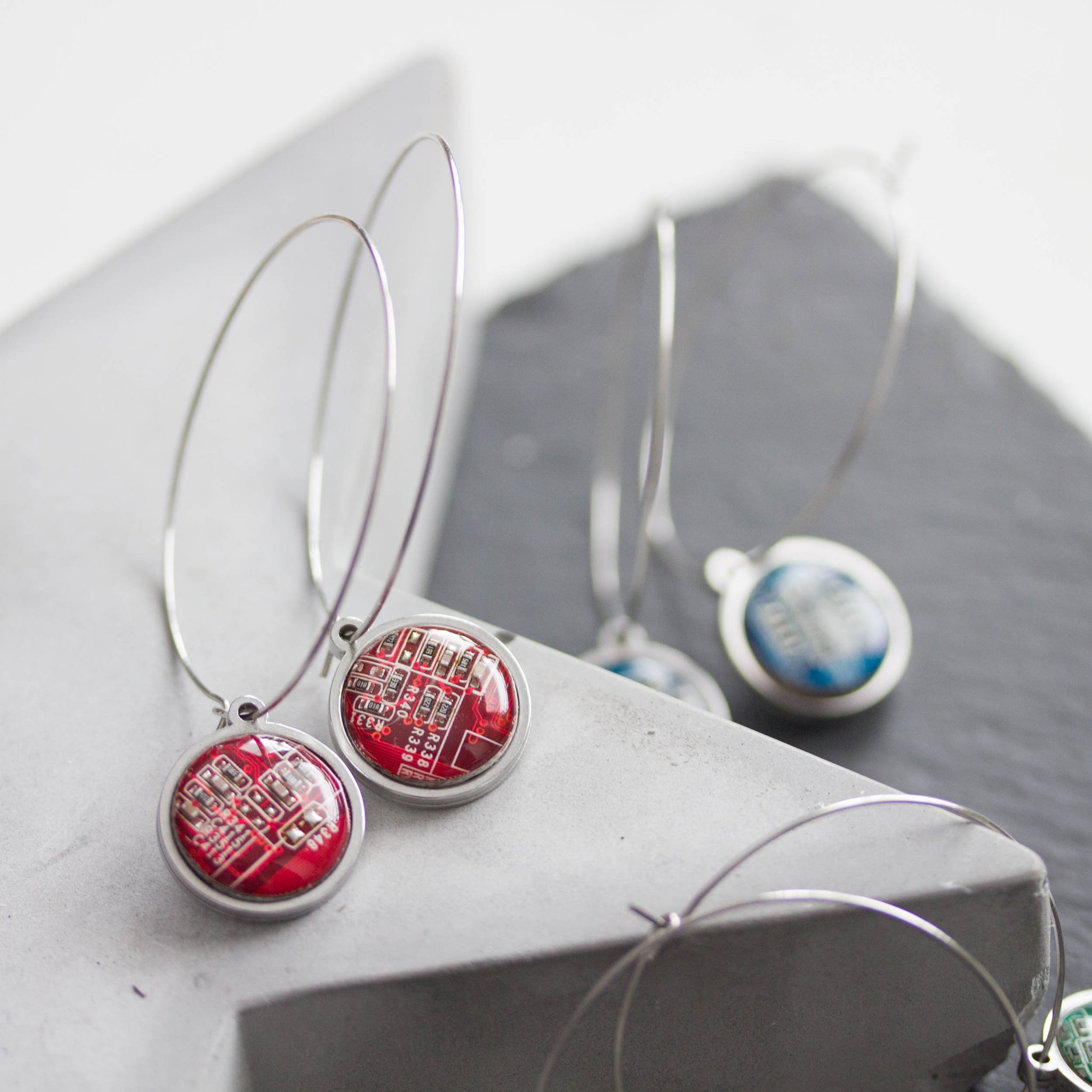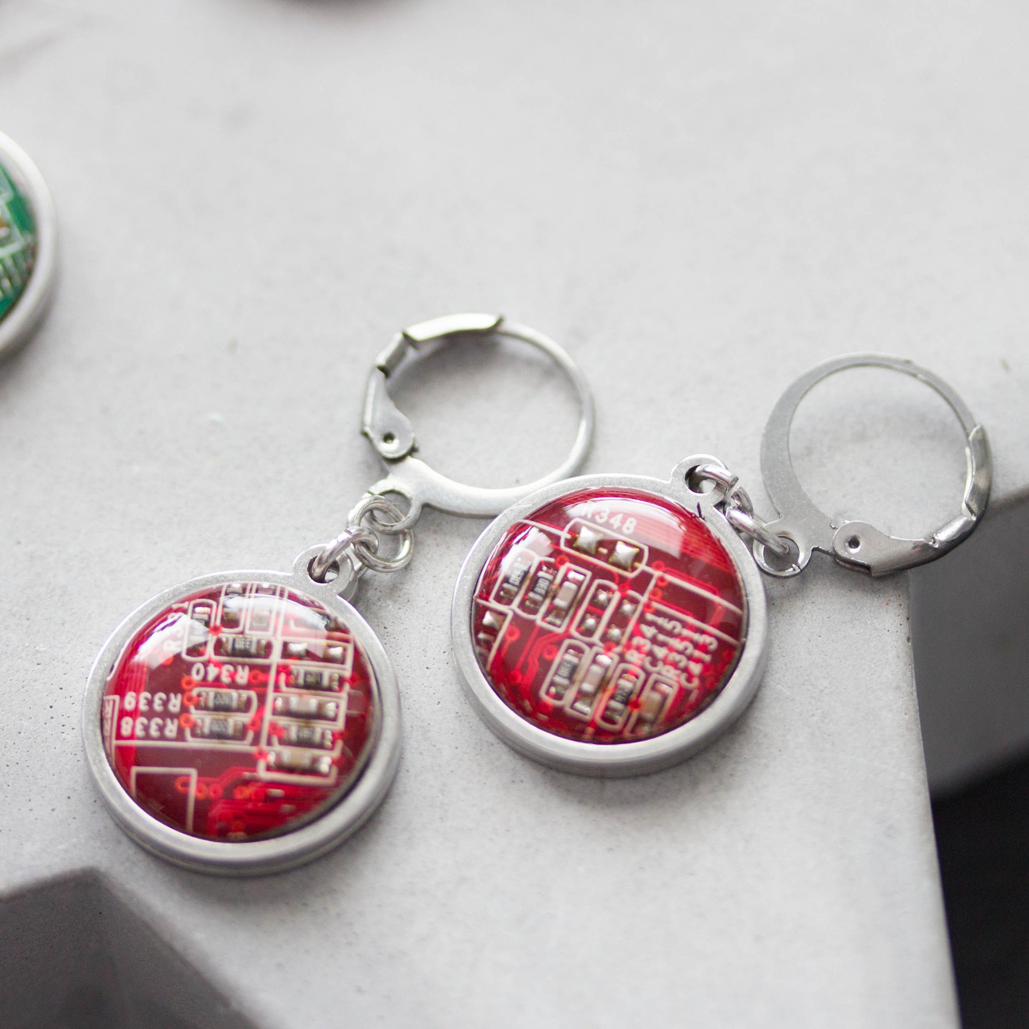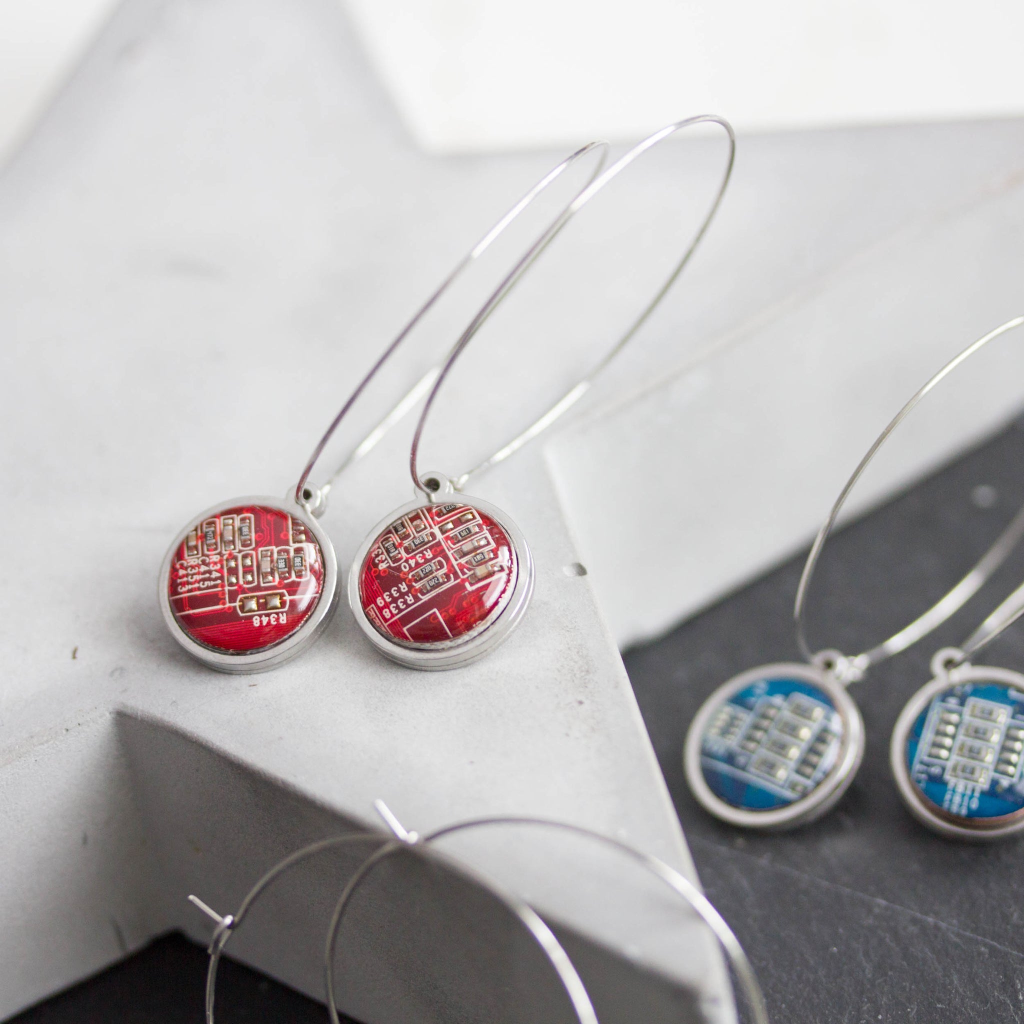 Hoop earrings with 15mm round circuit board pendants. The pendants are made from pieces of a real computer's circuit board. The surface is covered with clear resin and is as...