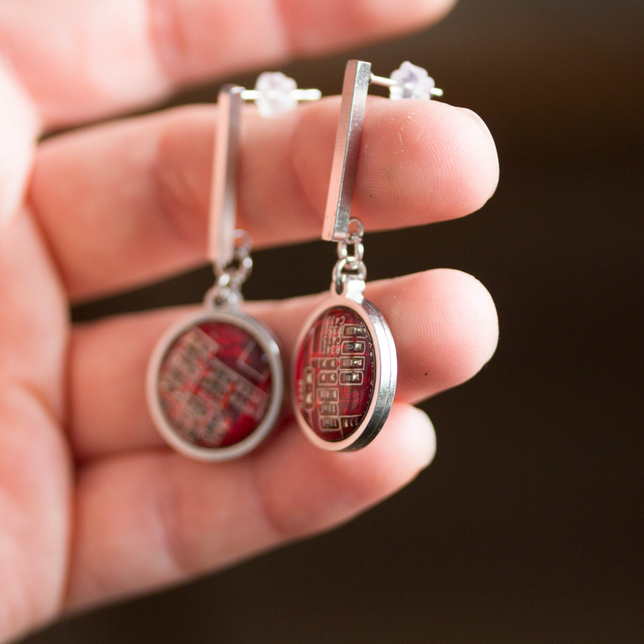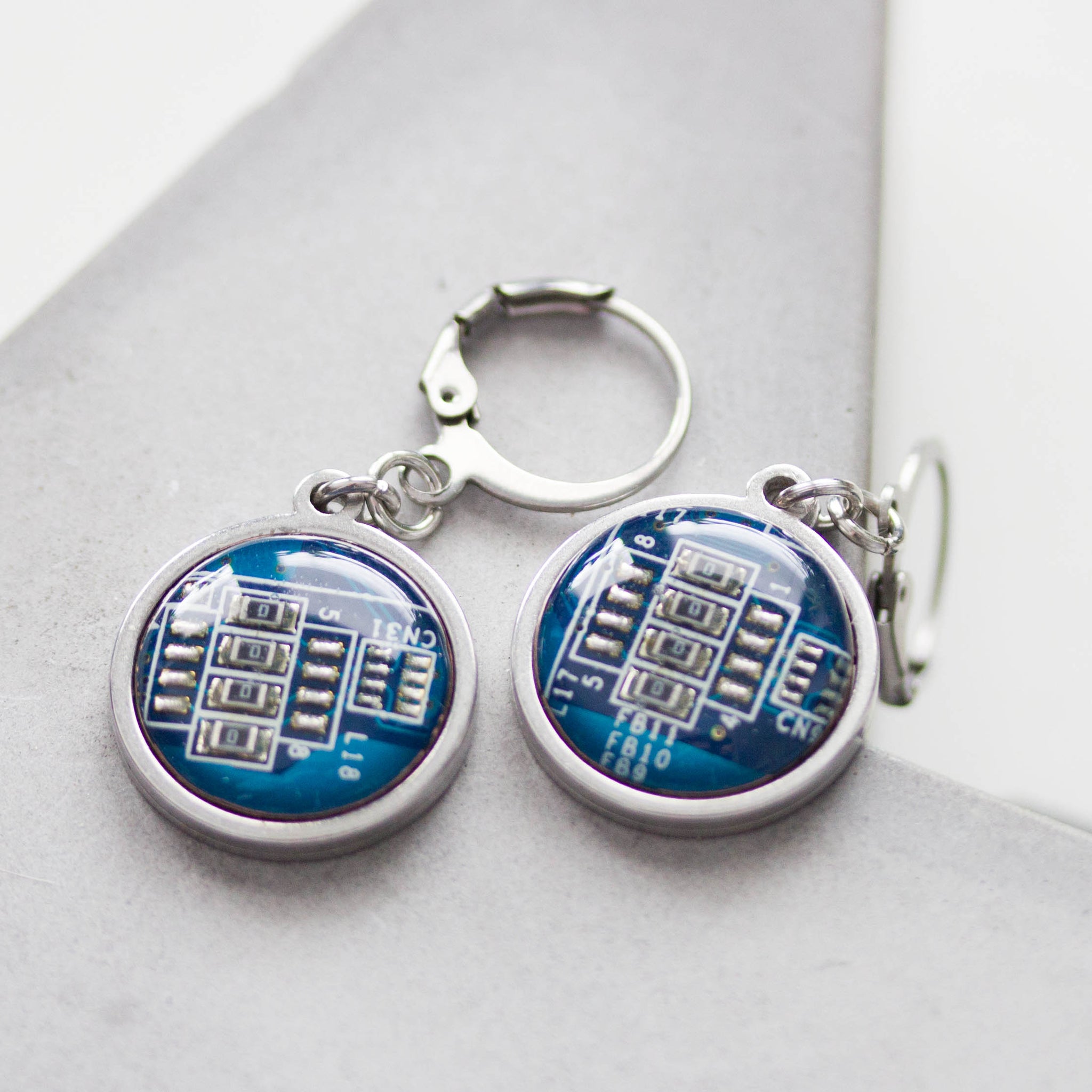 Dangle earrings with 15mm round circuit board pendants, steel wires