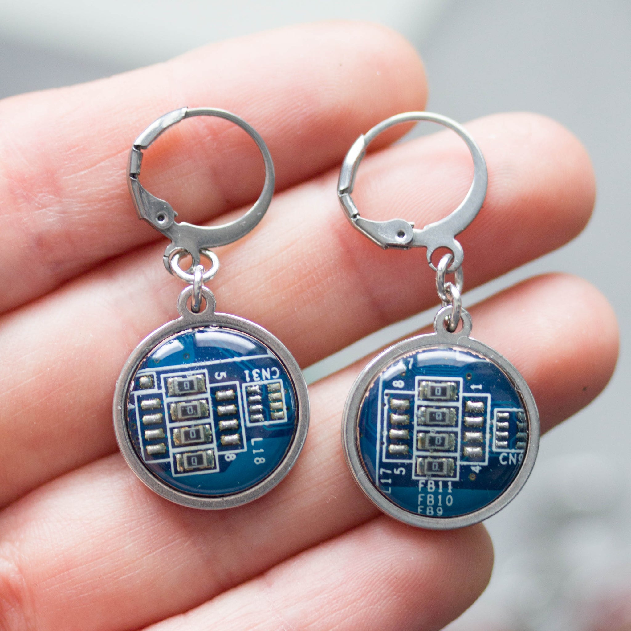 Dangle earrings with 15mm round circuit board pendants. The pendants are made from pieces of a real computer's circuit board. The surface is covered with clear resin and is as...