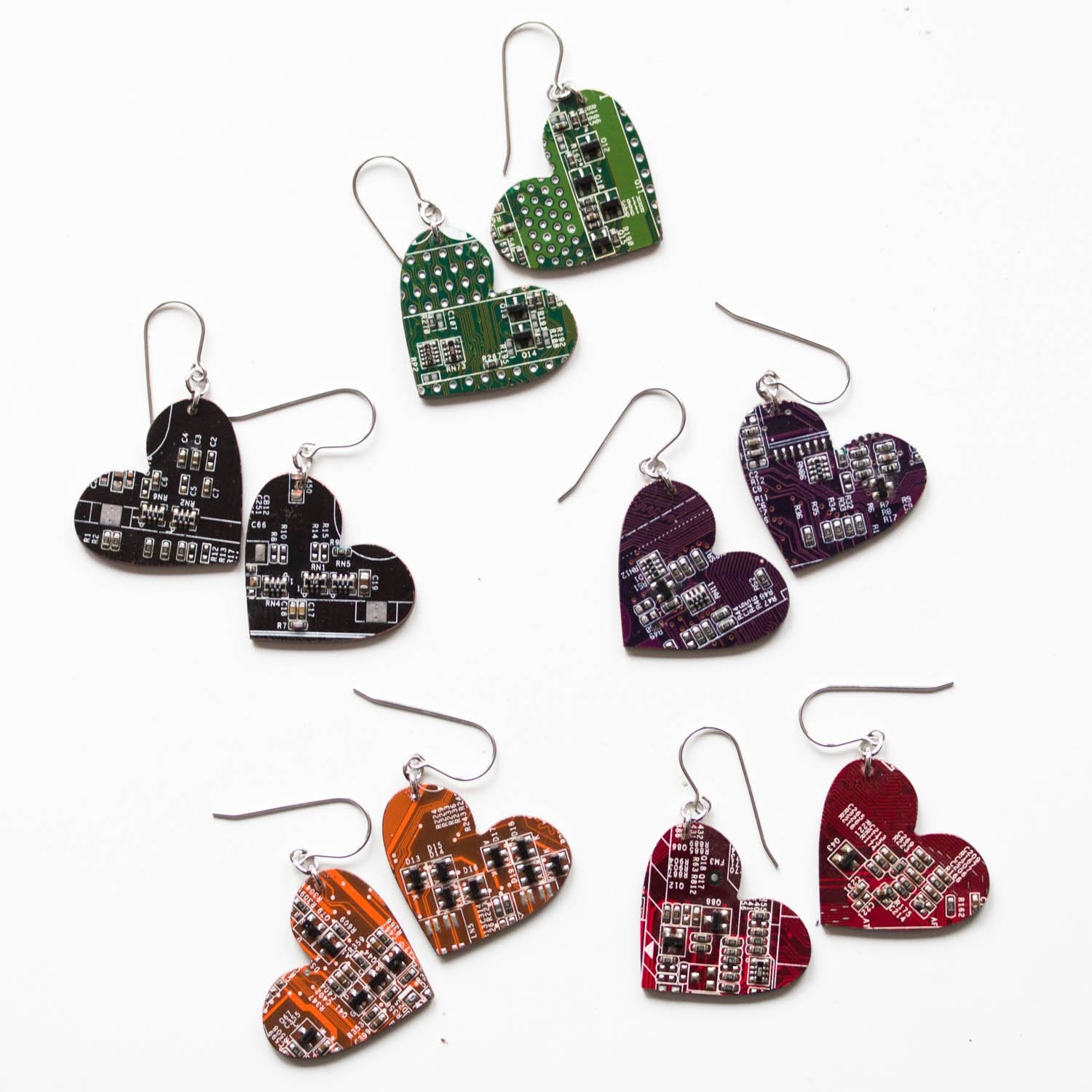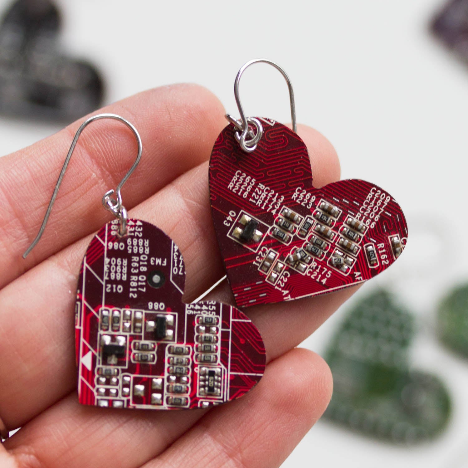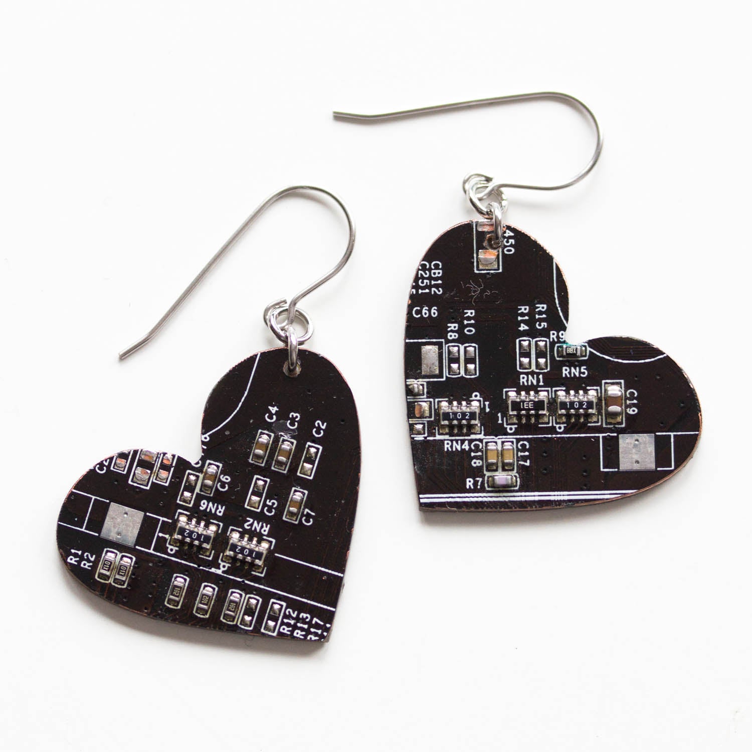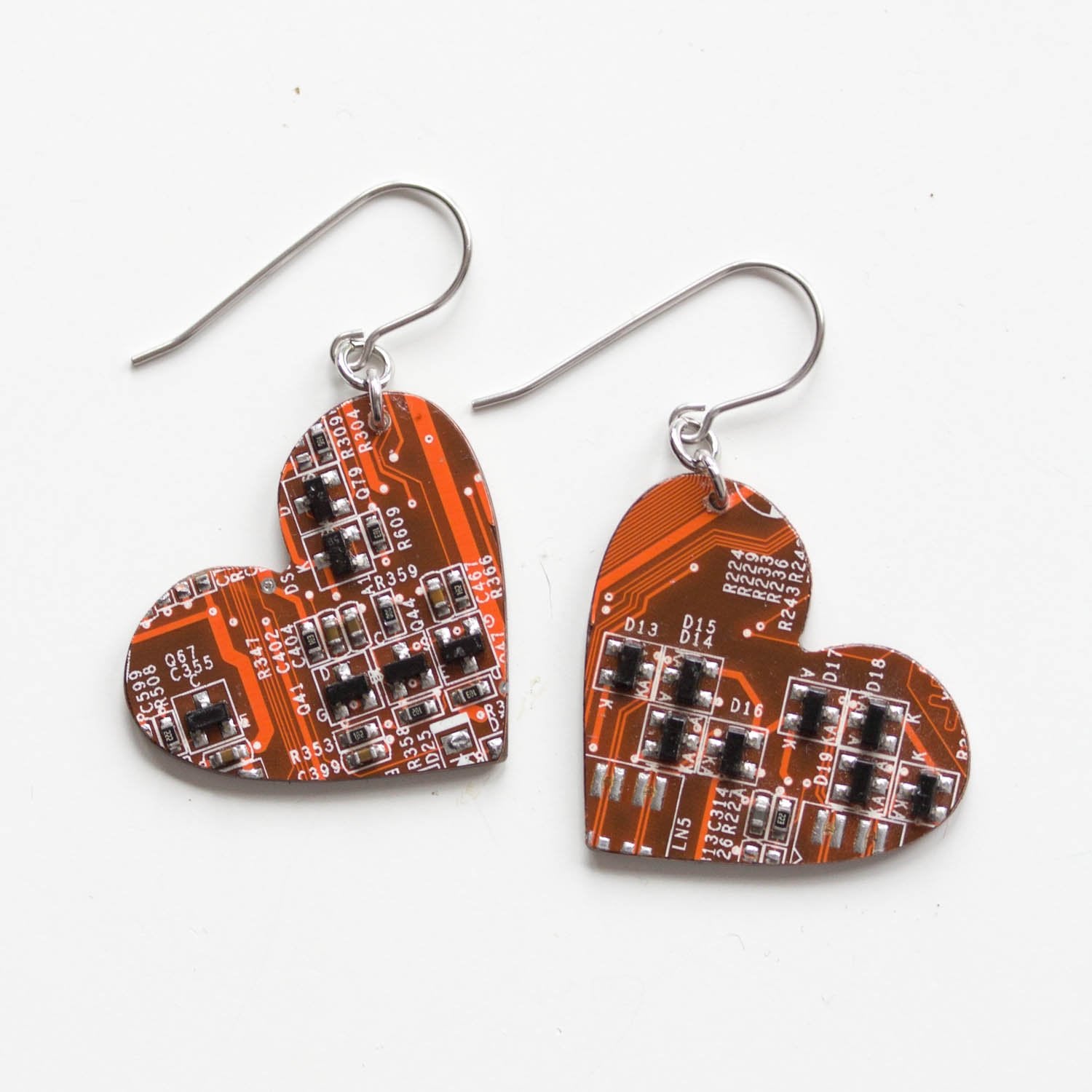 Cute and geeky heart earrings made of a circuit board.The heart is 3 x 4 cm. The total length of the earring is 5 cm.We use real circuit boards from...