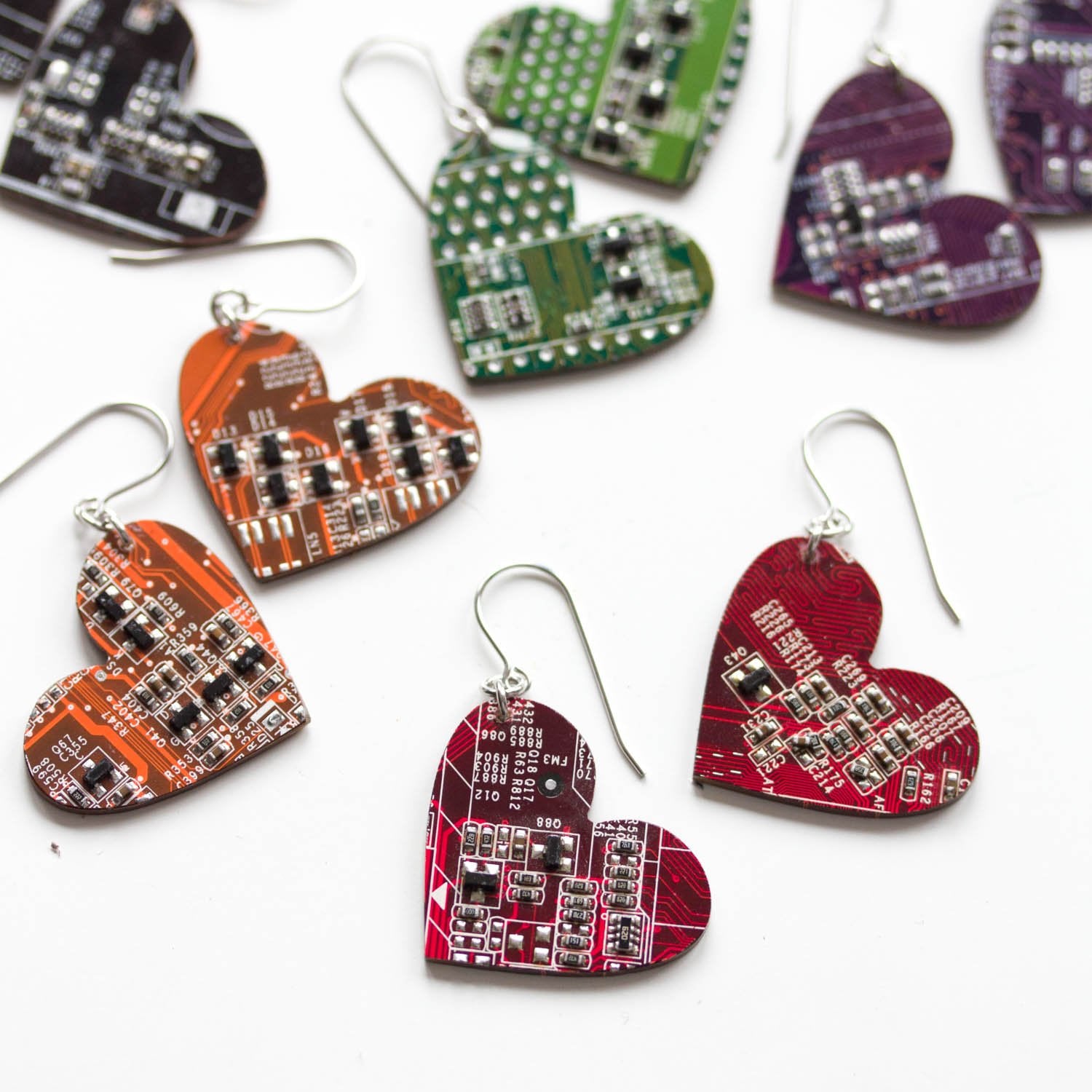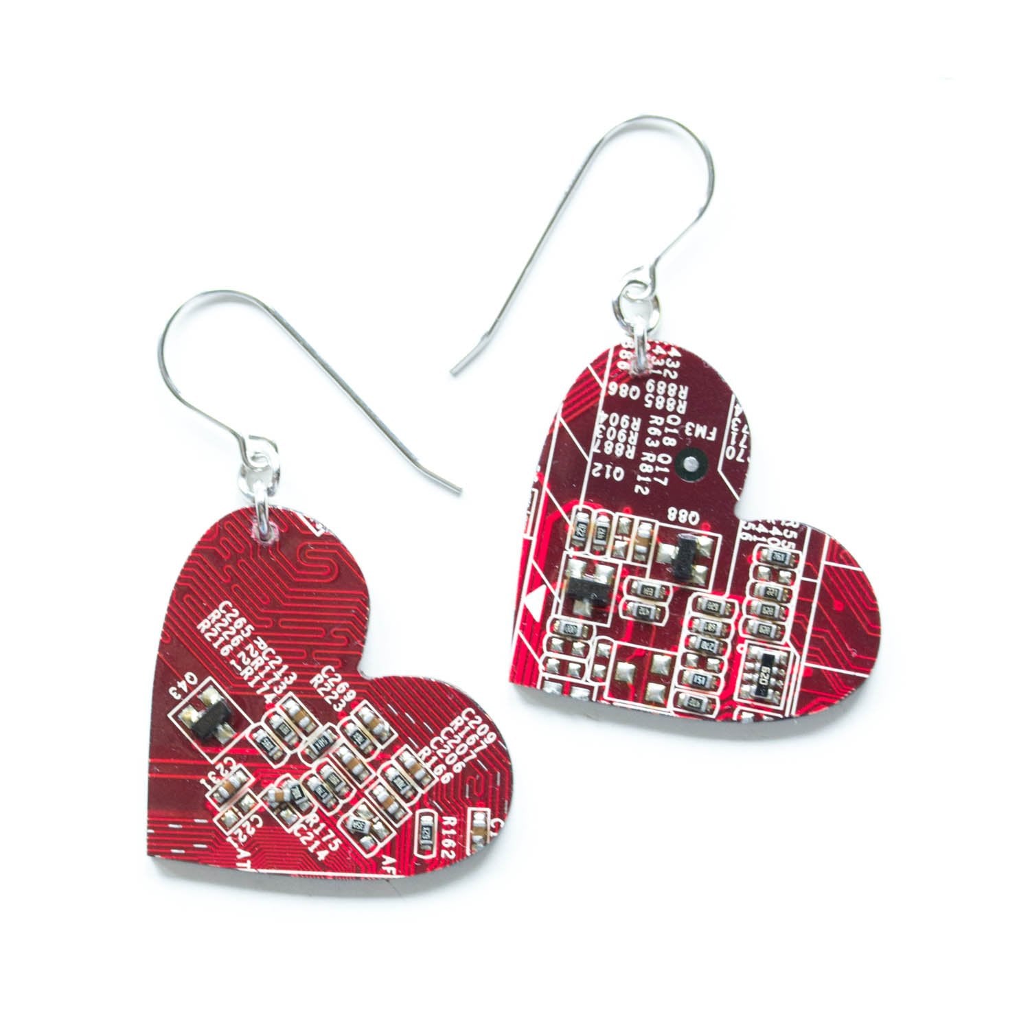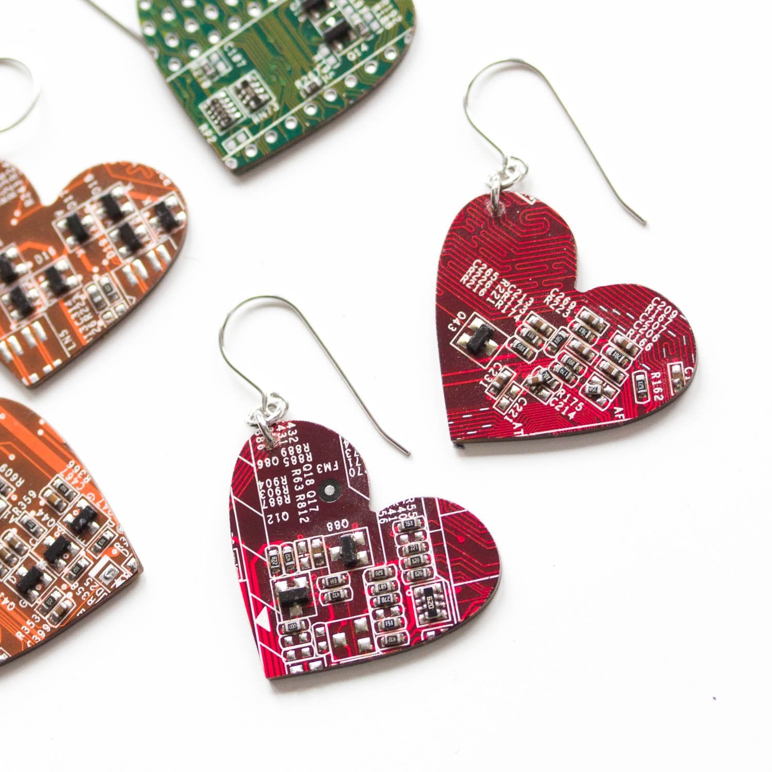 Cute and geeky heart earrings made of a circuit board.The heart is 3 x 4 cm. The total length of the earring is 5 cm.We use real circuit boards from...