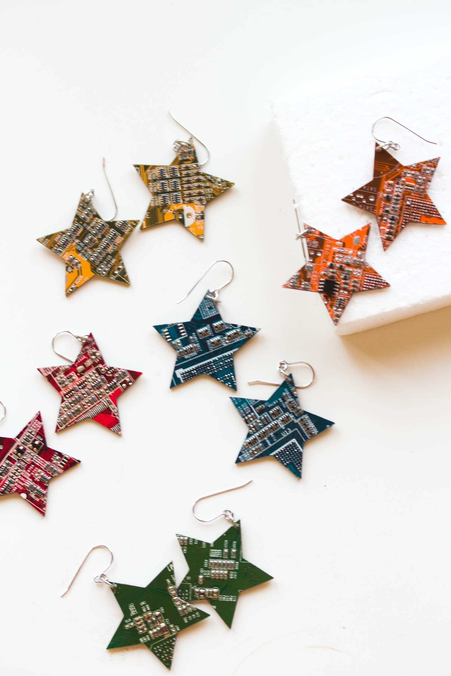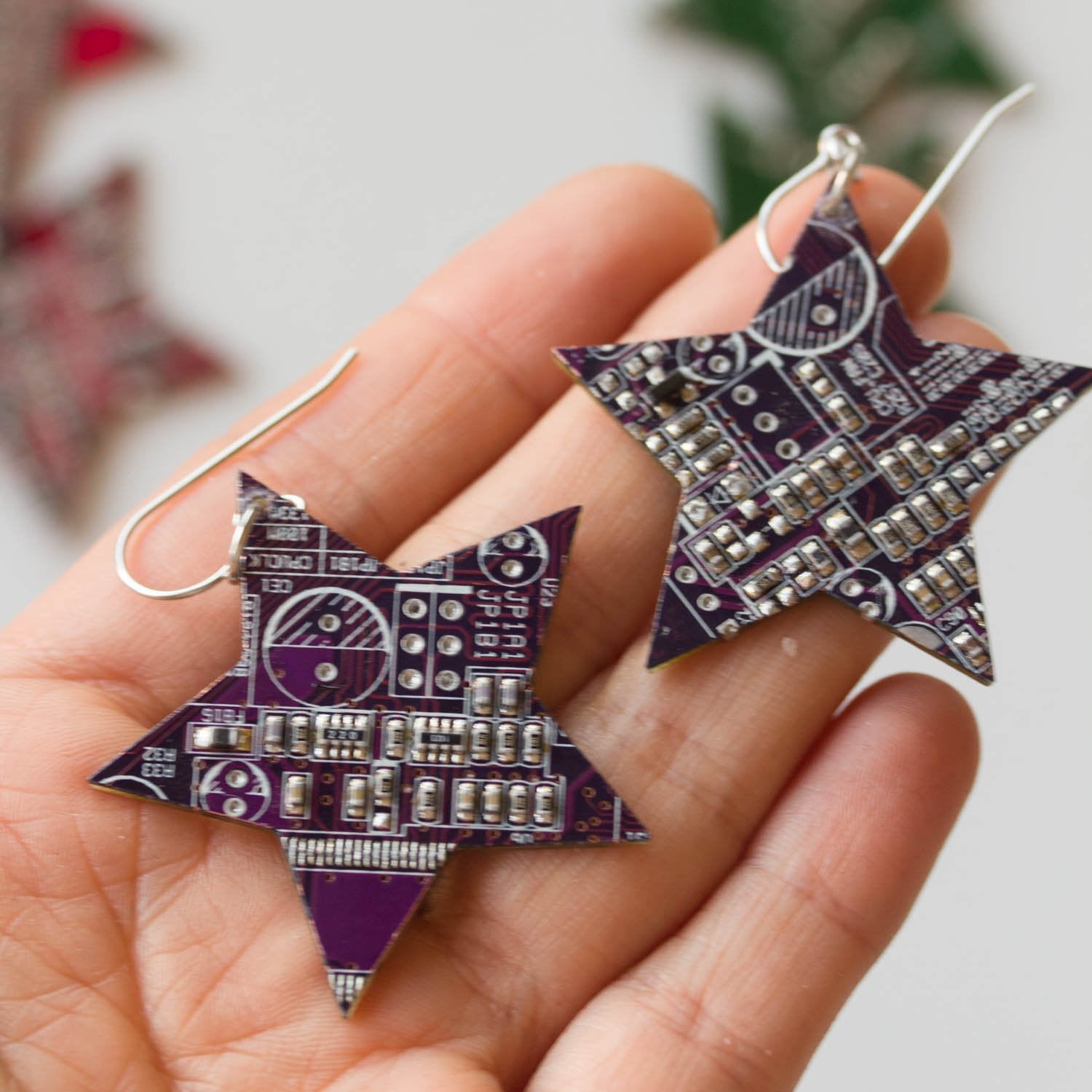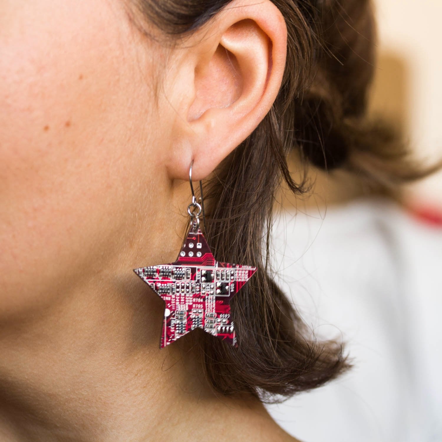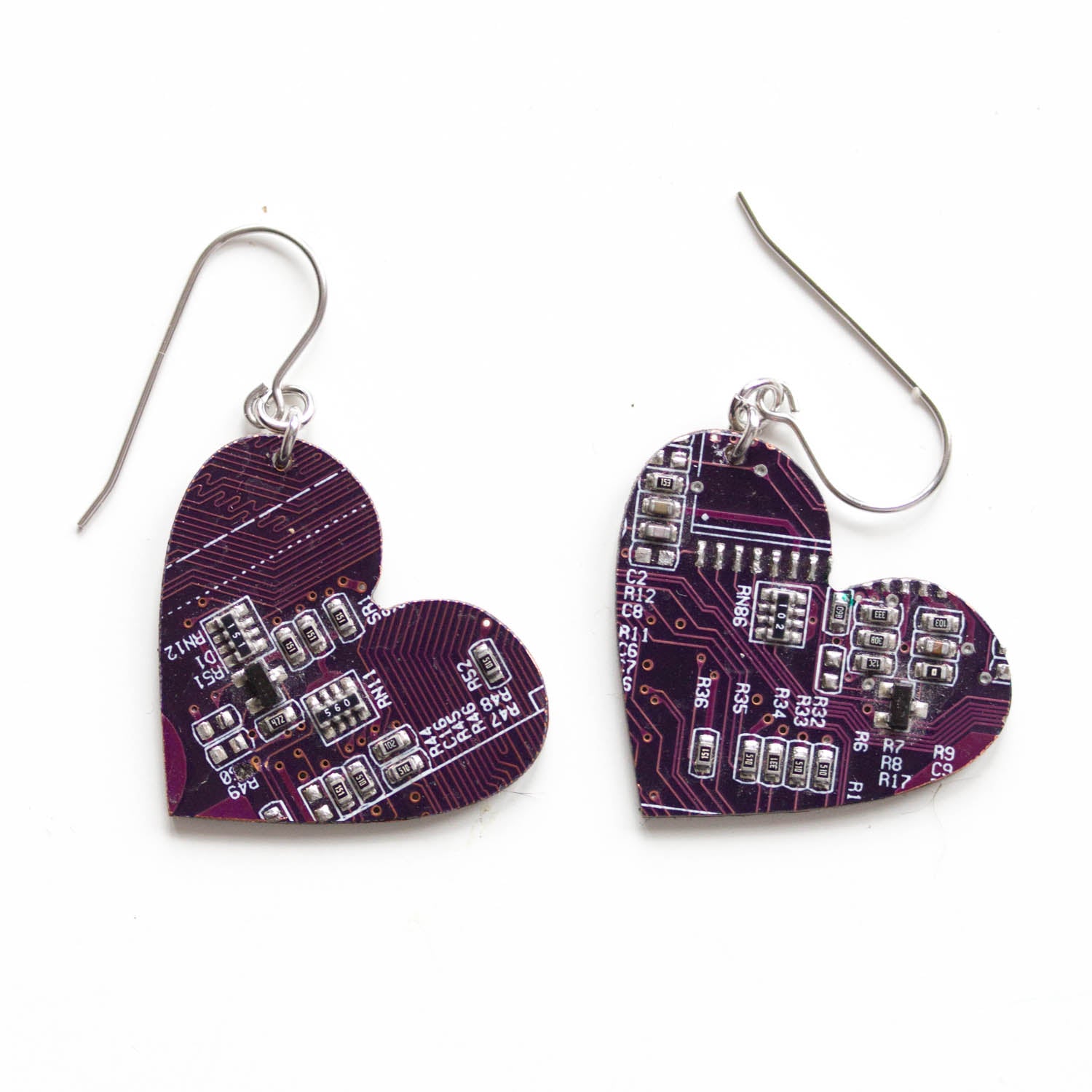 Cute and geeky heart earrings made of a circuit board.The heart is 3 x 4 cm. The total length of the earring is 5 cm.We use real circuit boards from...