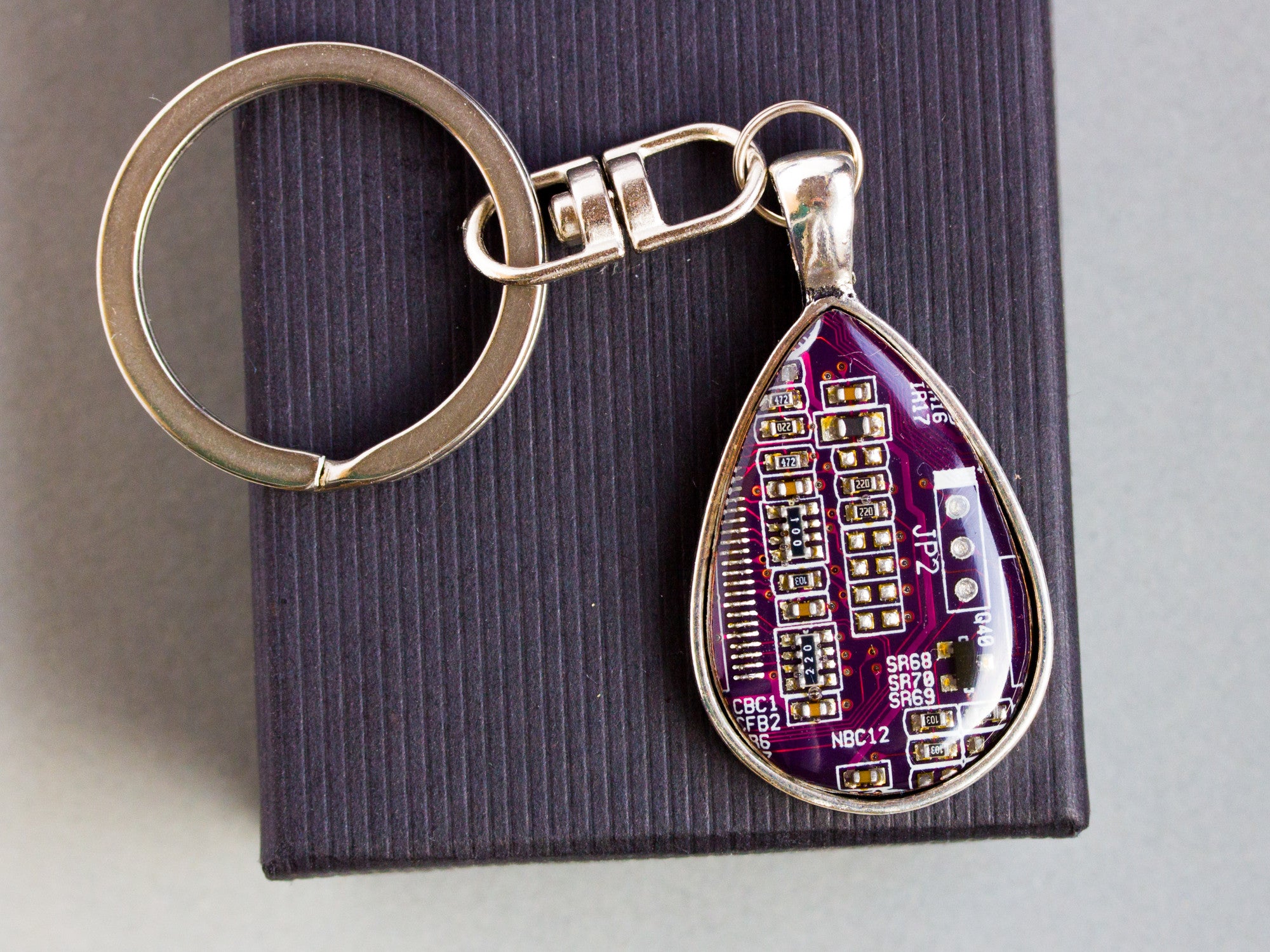 Drop-shaped circuit board keychain is made of a piece of real circuit board approx. 1 1/4 inch (30 mm) high and is covered with resin, so the surface is as shiny...