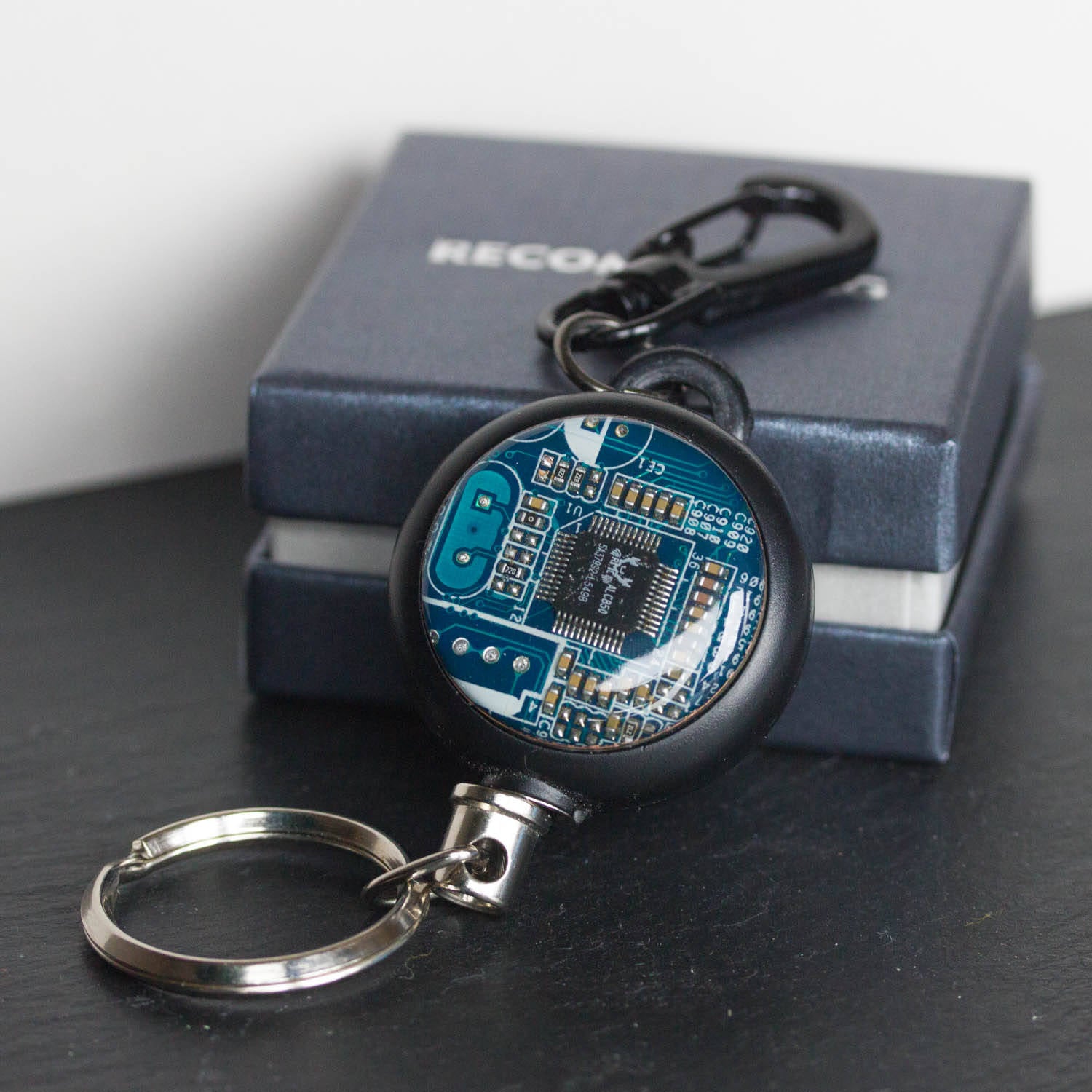 This cool retractable badge holder will be a perfect gift for a new coworker, or for yourself :)The carabiner clip is finished with a round piece of real circuit board...