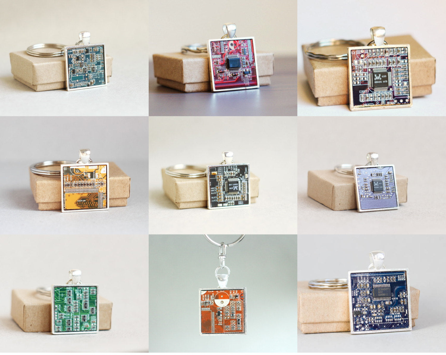 Circuit board keychain is made of a square piece of real circuit board and is covered with resin, so the surface is as shiny as glass. The circuit board piece is 1"...