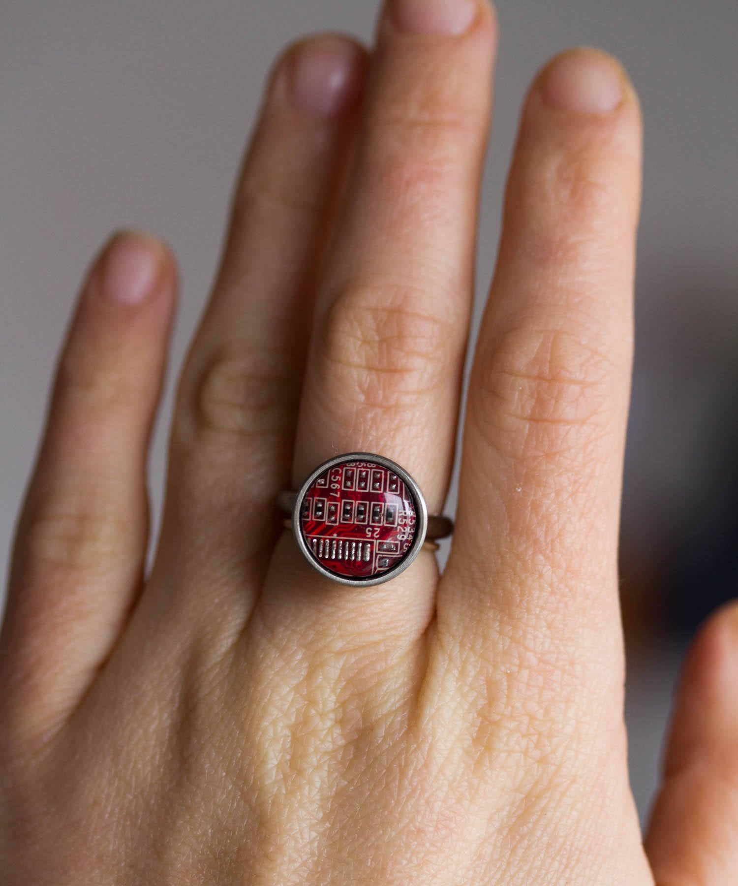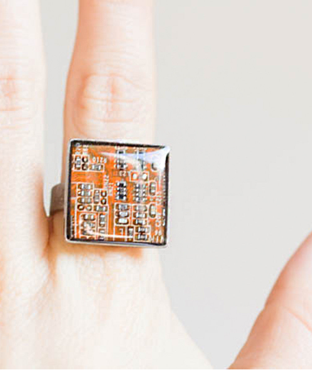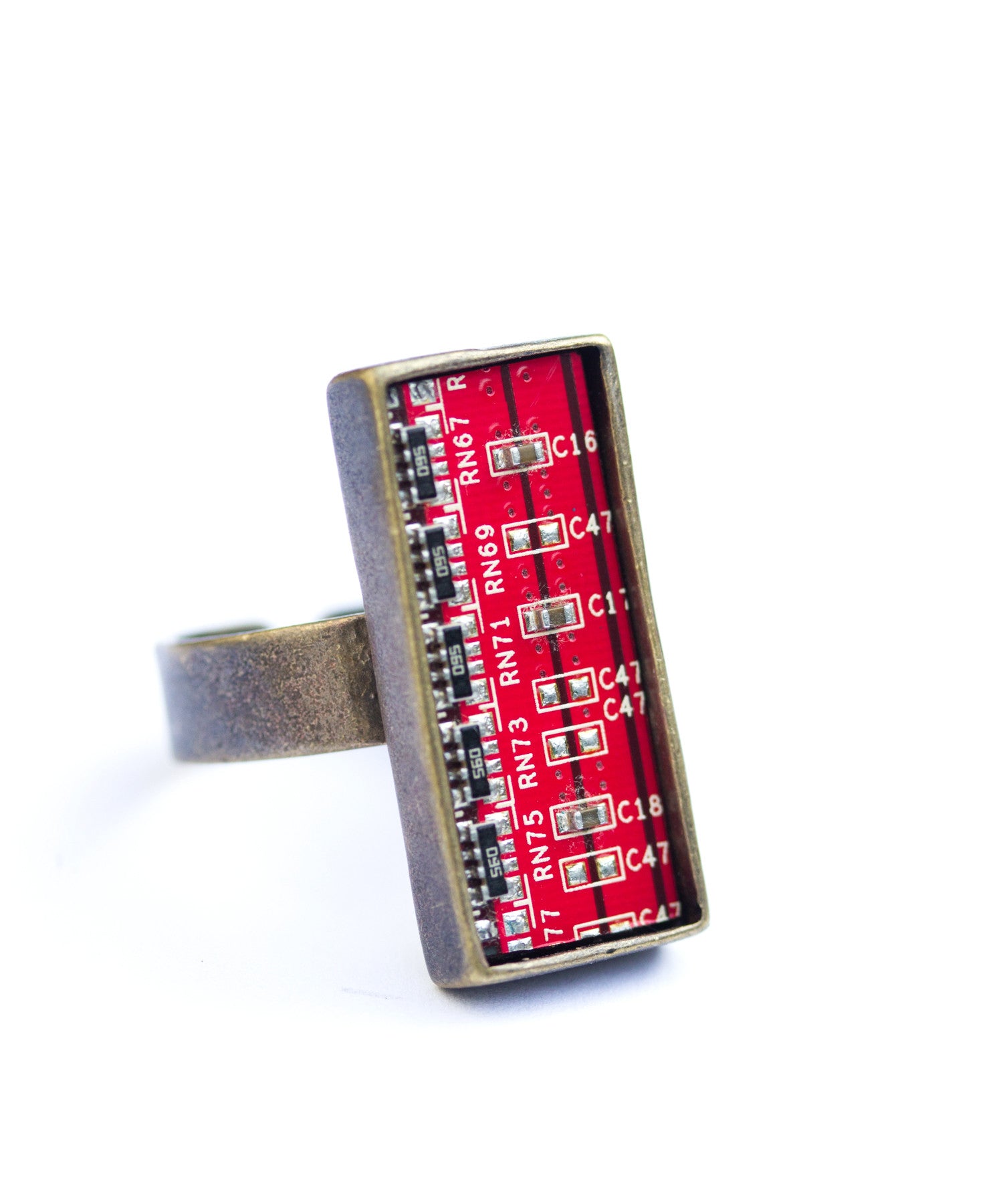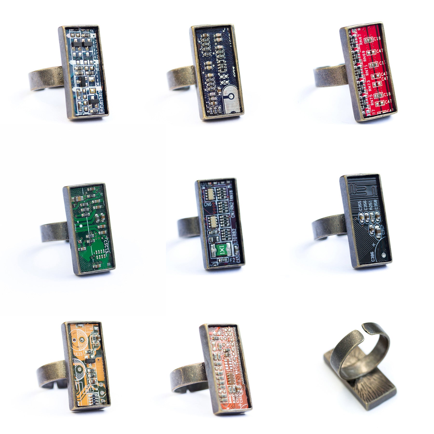 This cool ring is made with a piece of real circuit board covered with resin. The ring is adjustable and can be made in 3 metal colors: steel, gold, rose...