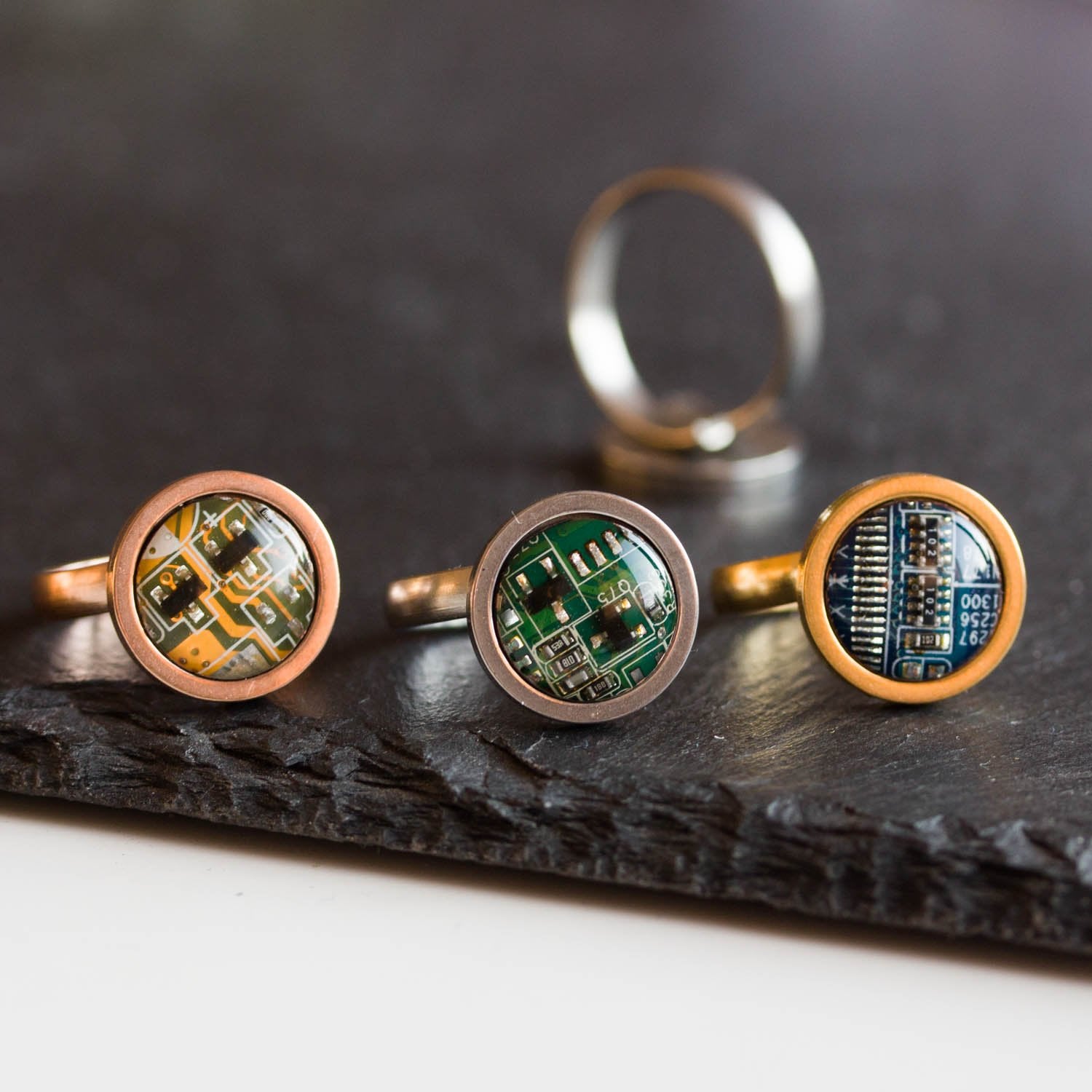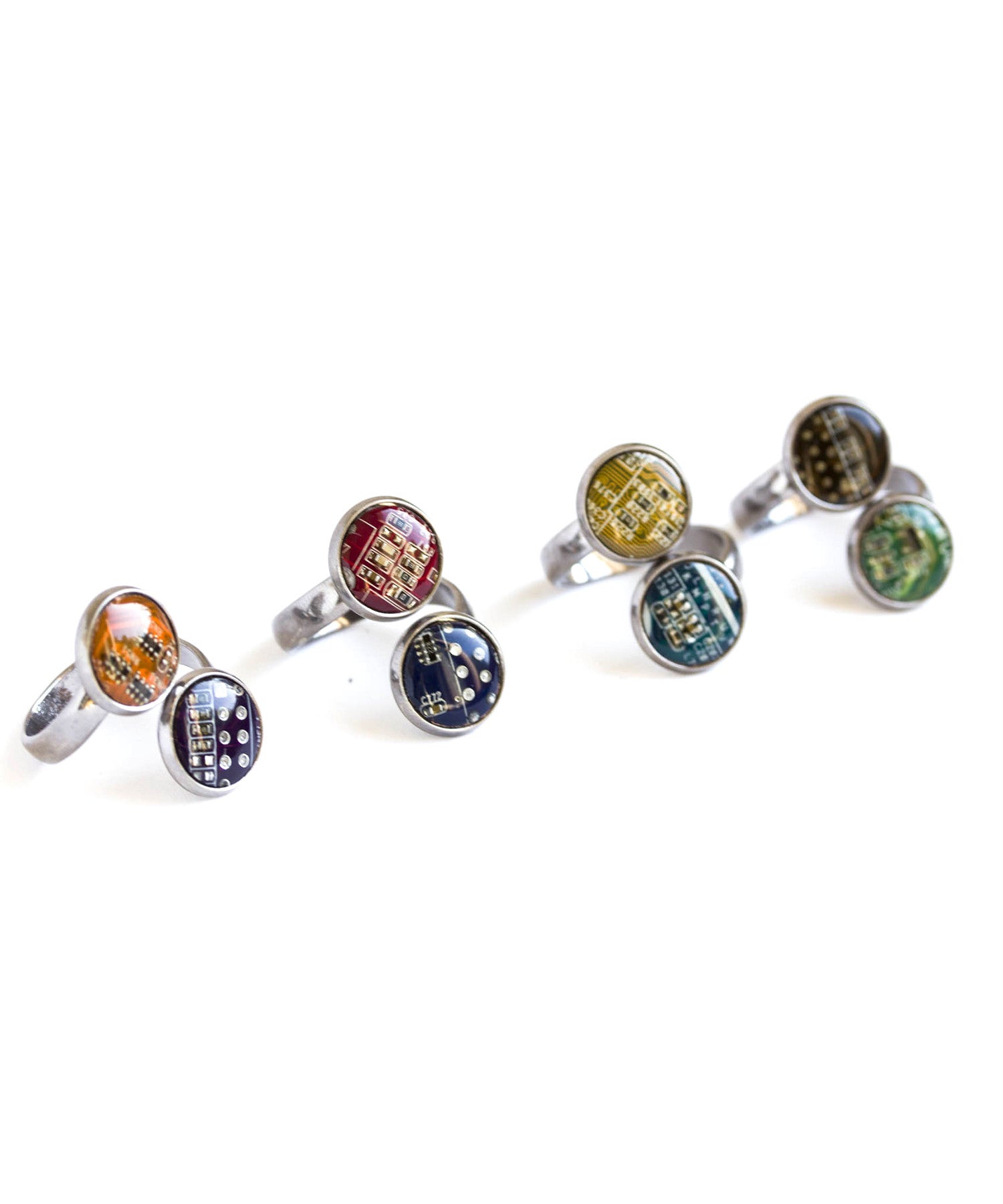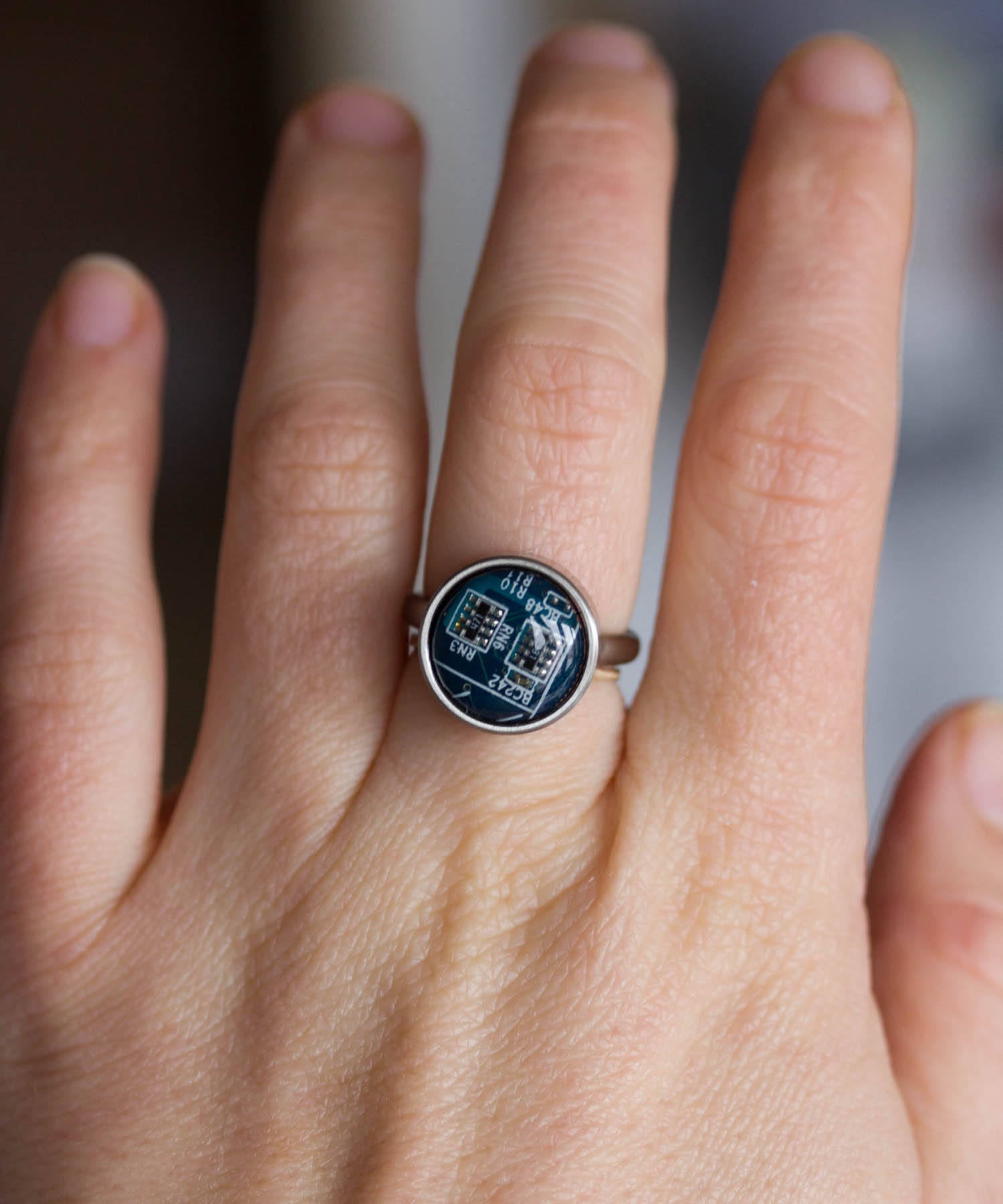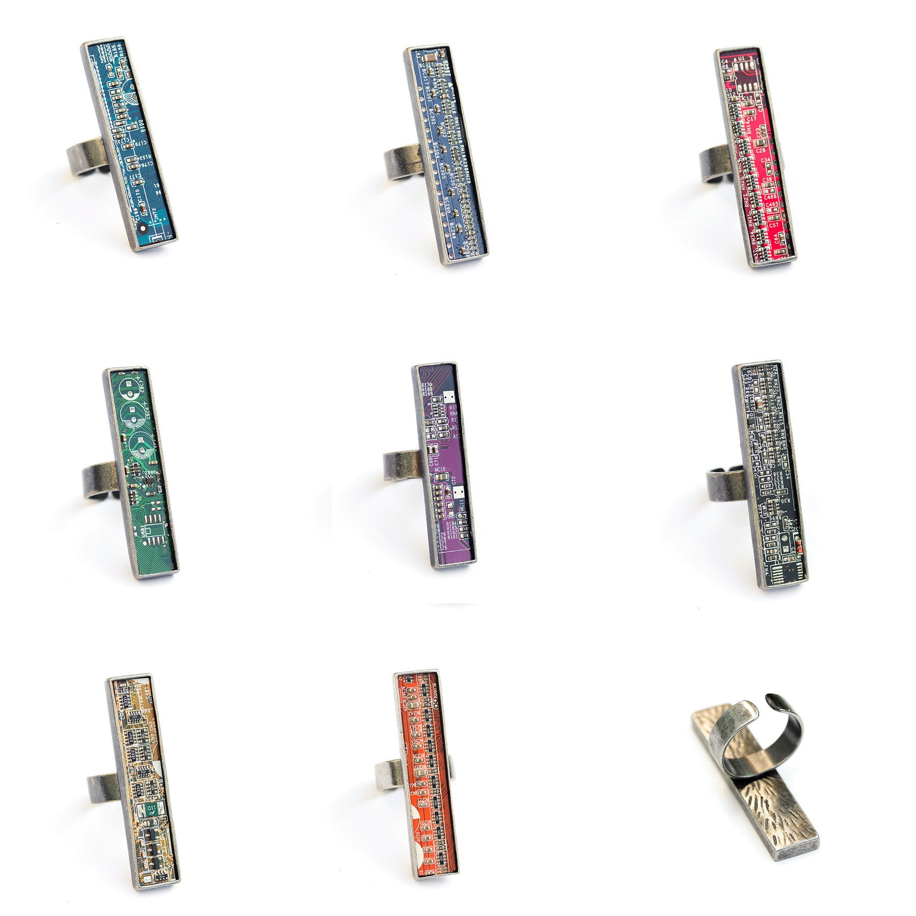 This cool ring is made with a piece of real circuit board covered with resin. The ring is adjustable and can be made in 3 metal colors: steel, gold, rose...