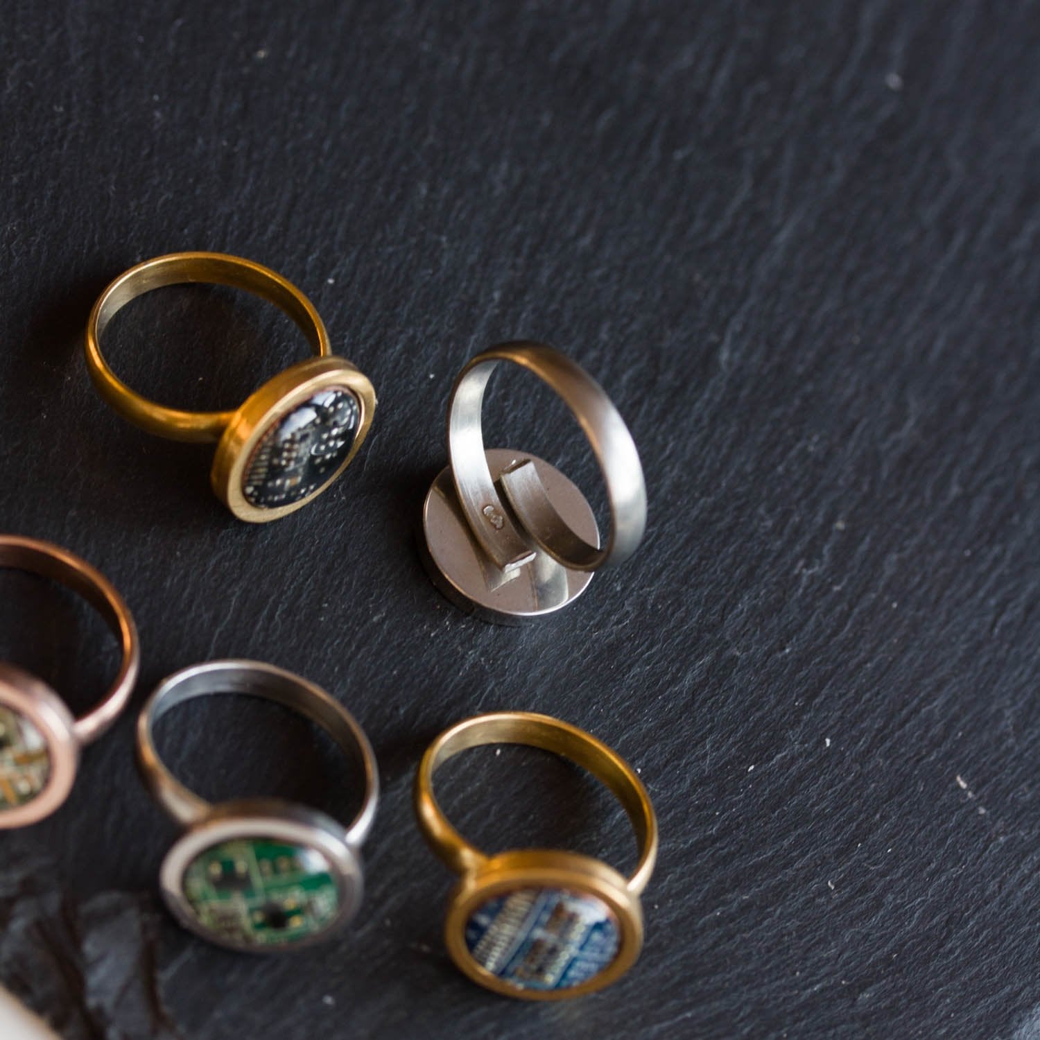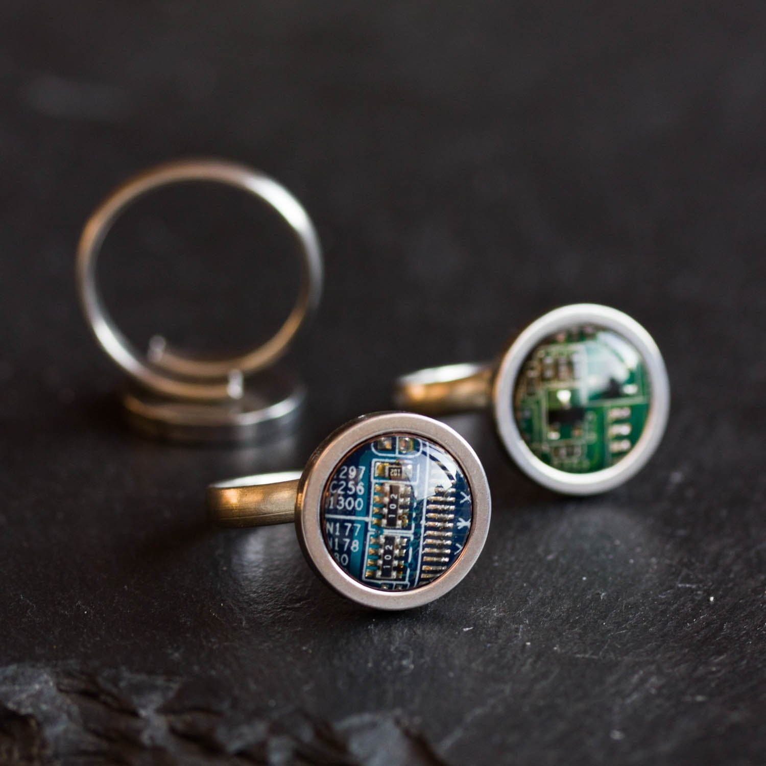 Ring with interchangeable buttons, recycled circuit board ring, unisex jewelry